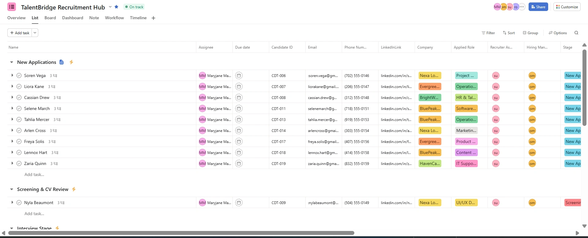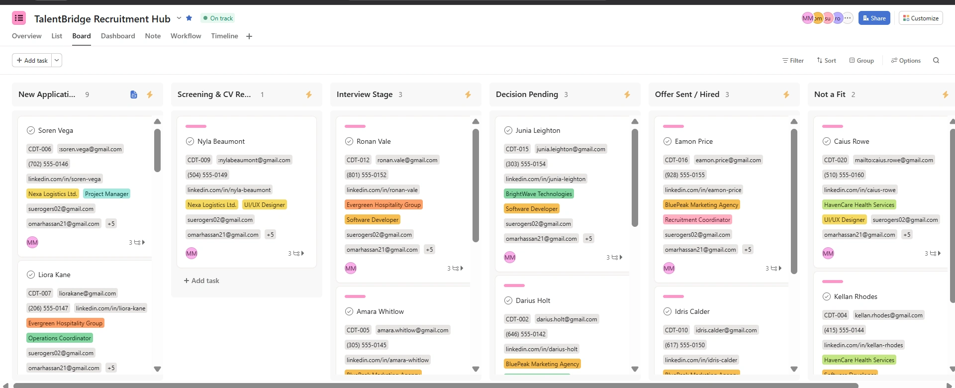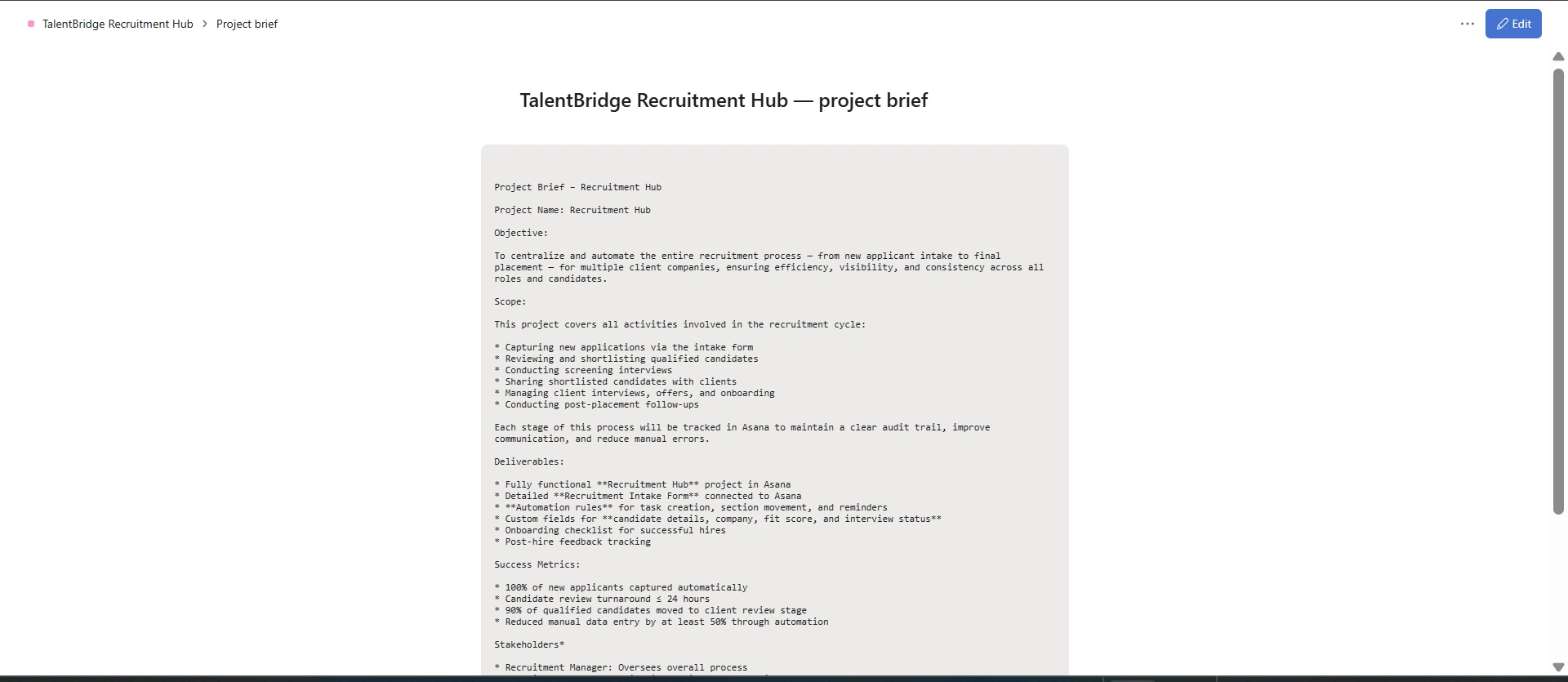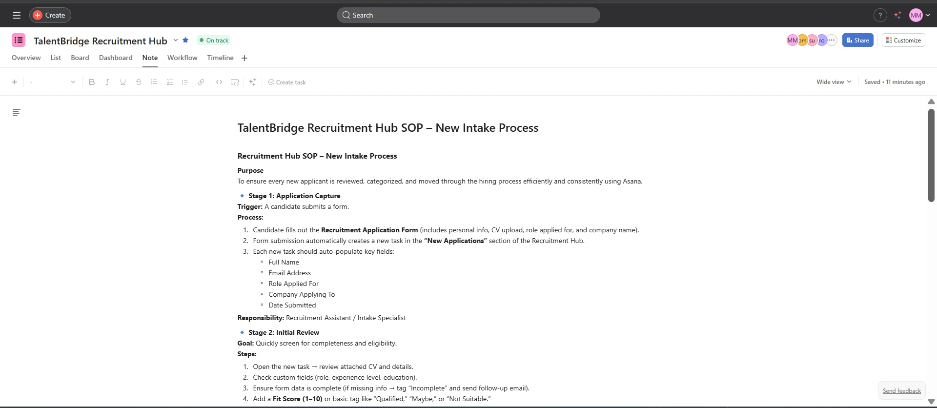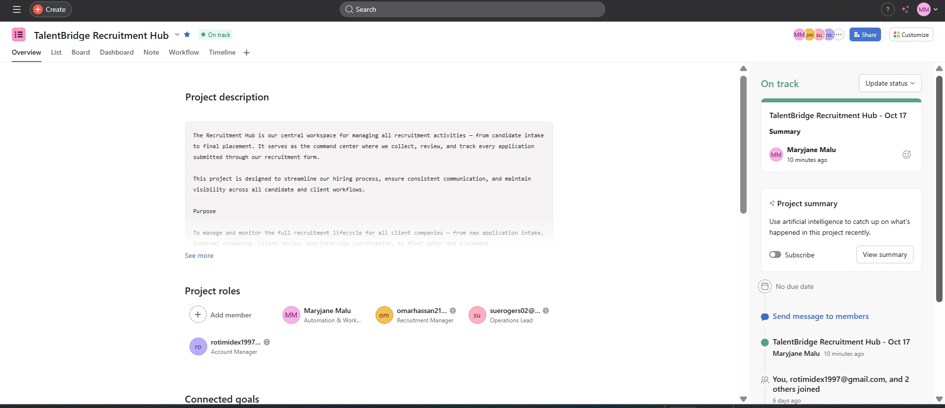 Automated and managed Talent Bridge’s hiring workflows in Asana, centralizing candidate intake for five client companies to streamline recruitment.