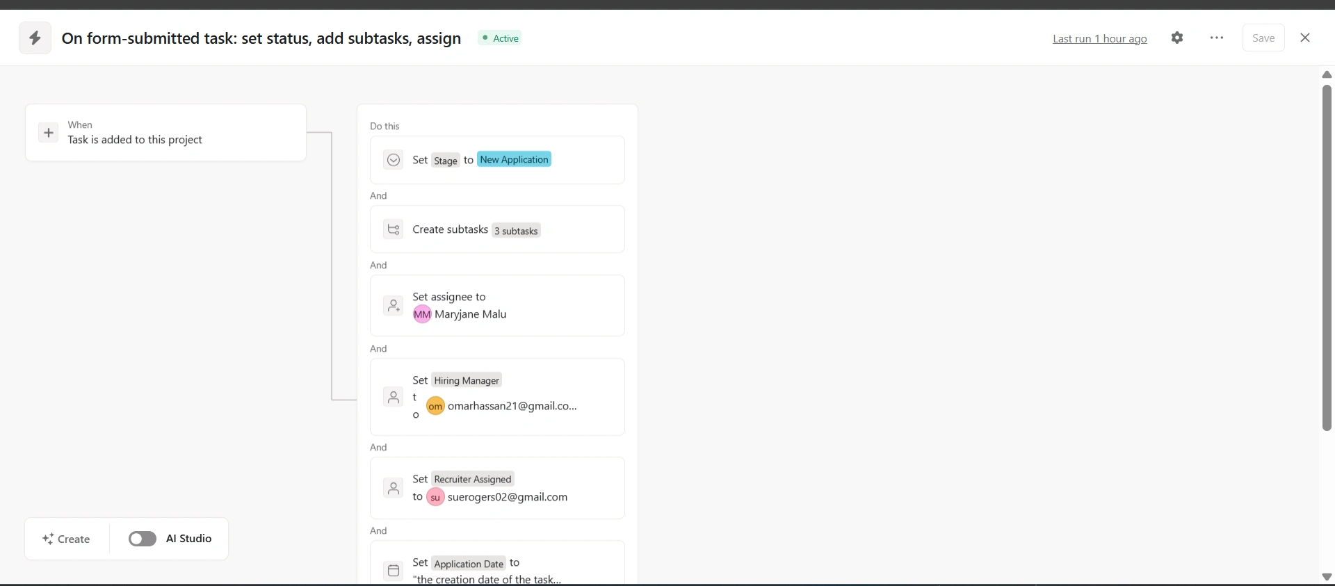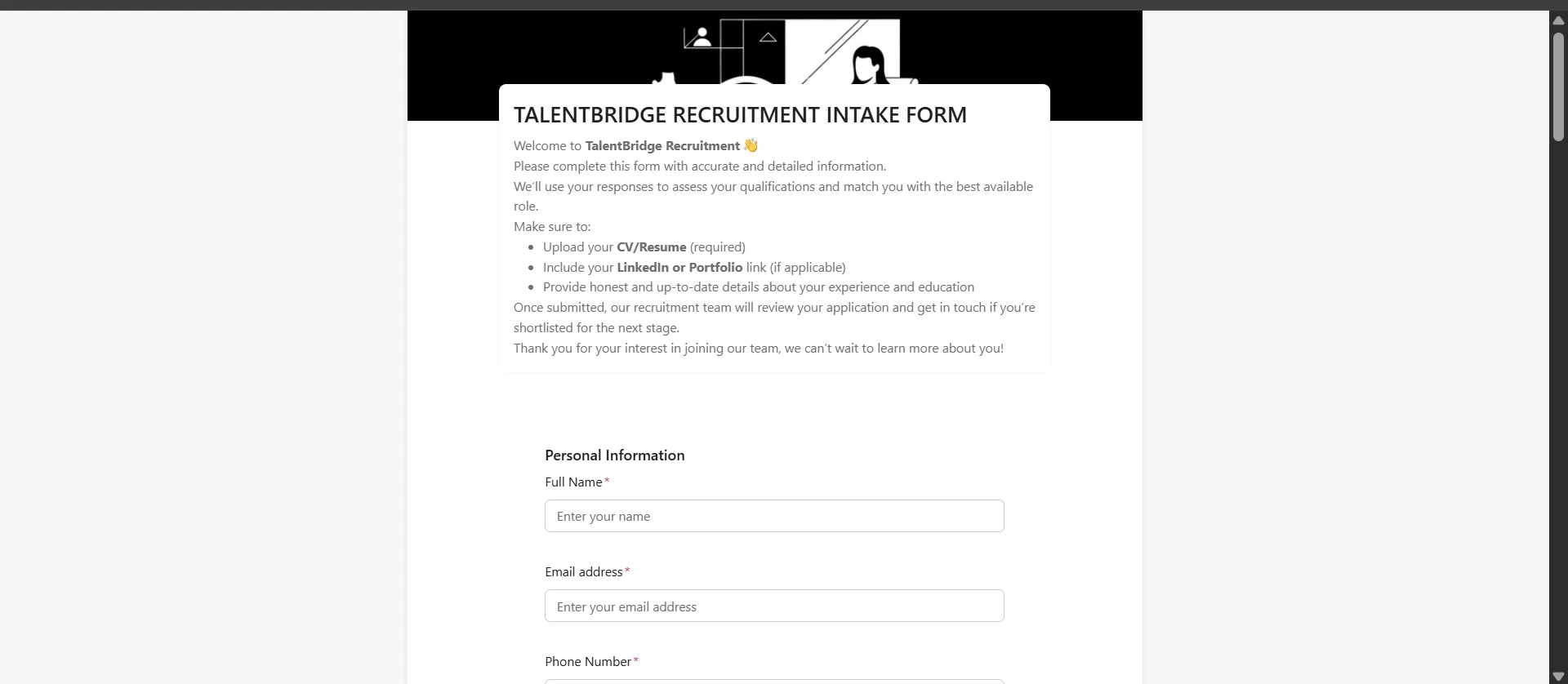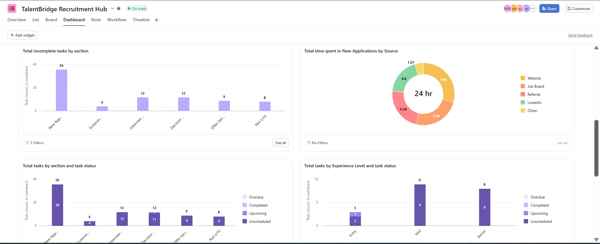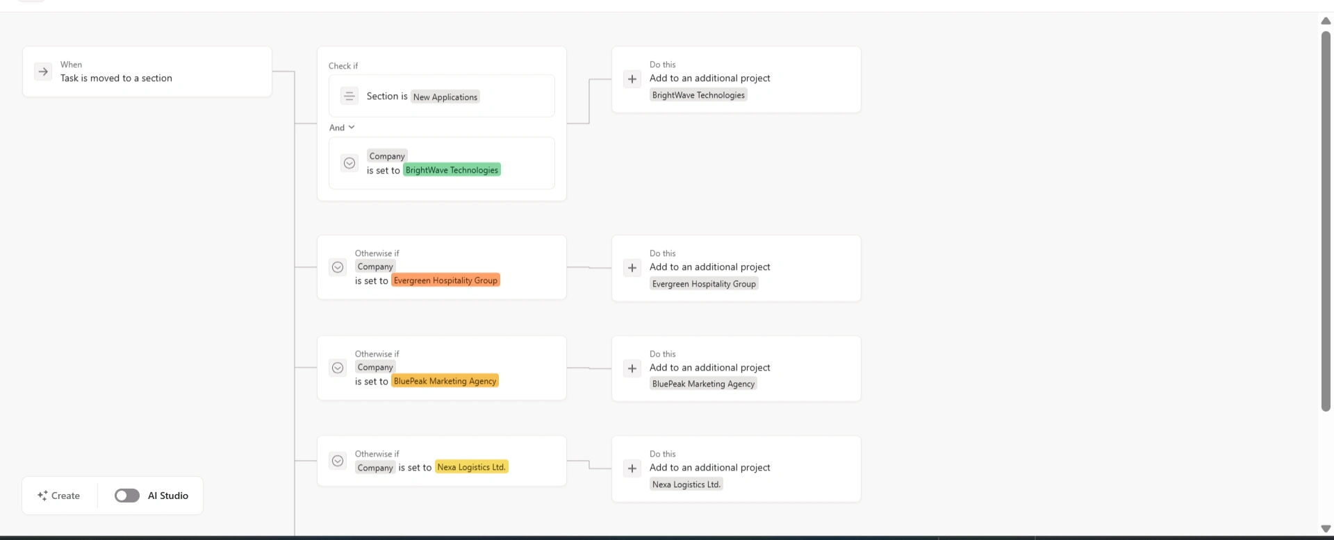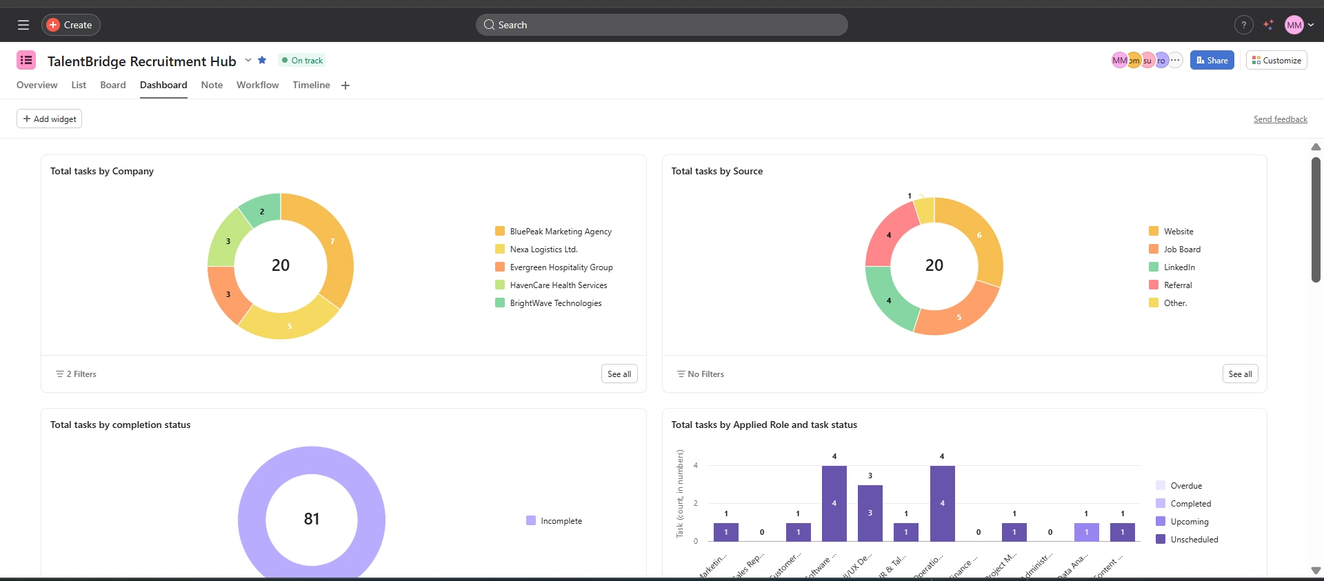 Automated and managed Talent Bridge’s hiring workflows in Asana, centralizing candidate intake for five client companies to streamline recruitment.