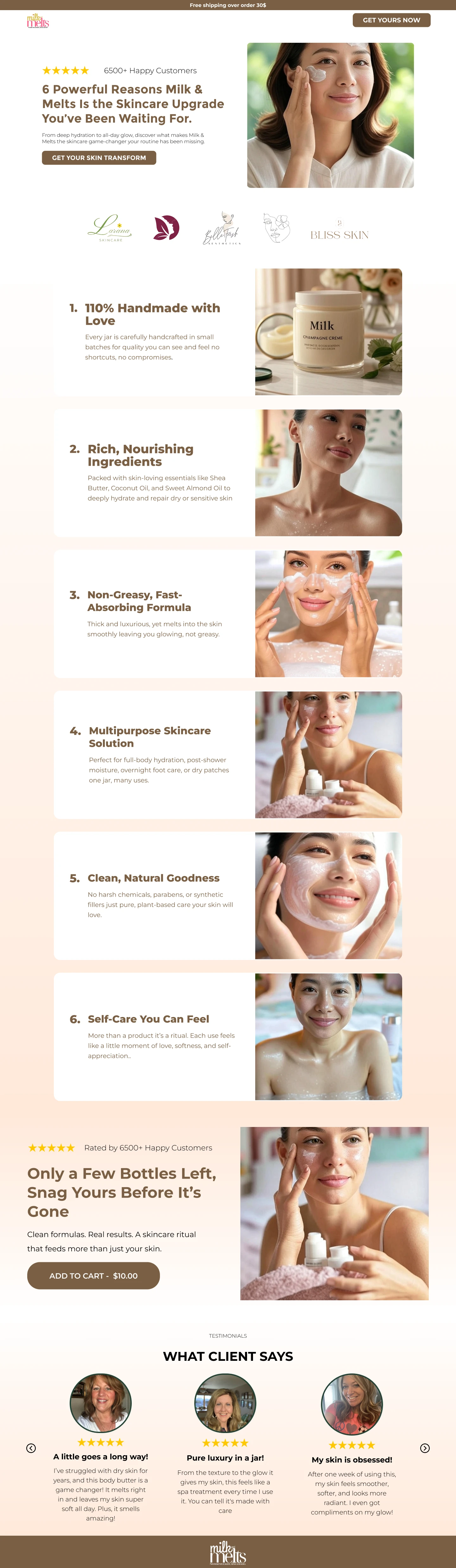 A persuasive, scroll-optimized listicle landing page created to drive product discovery and boost conversions. This Replo-ready layout uses benefit-driven storytelling, striking imagery, and social proof to showcase 6 powerful reasons to choose Milk and Melts. Designed to guide users from curiosity to checkout seamlessly with direct CTA placement and glowing testimonials.