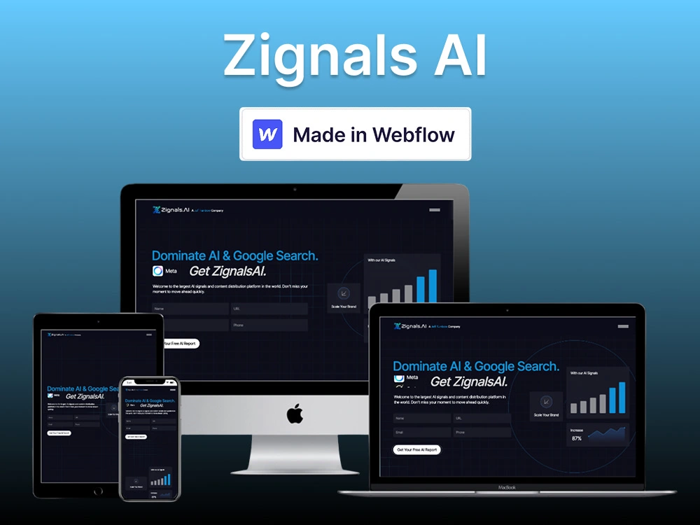 This project was a Webflow build for ZignalsAI, a content distribution and AI-driven marketing platform focused on helping businesses grow authority and organic reach across search and social channels. The brand operates in a fast-moving, technical space and needed a website that felt modern, dynamic, and forward-thinking from the first impression.