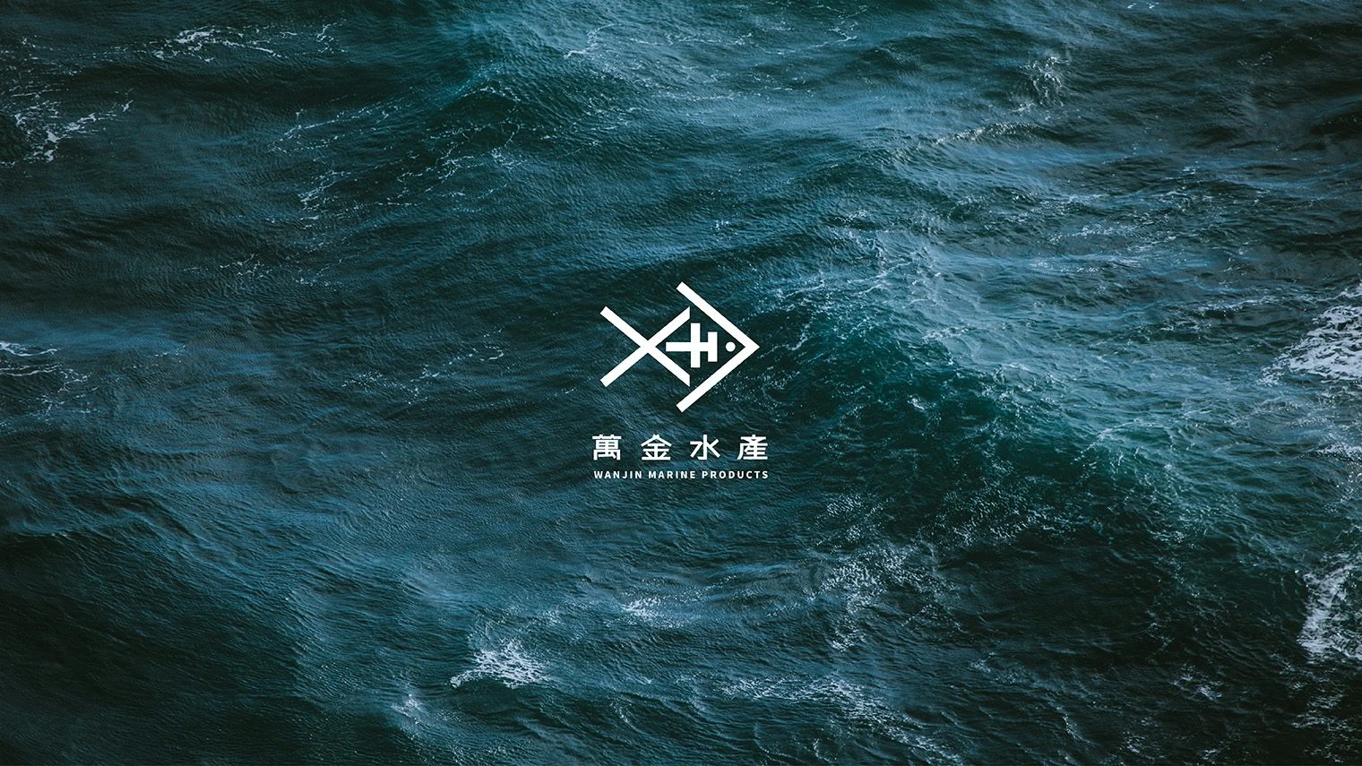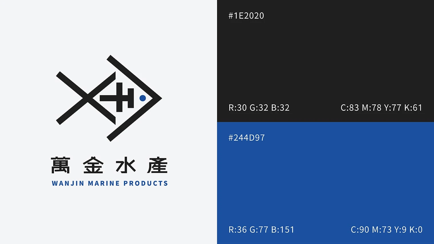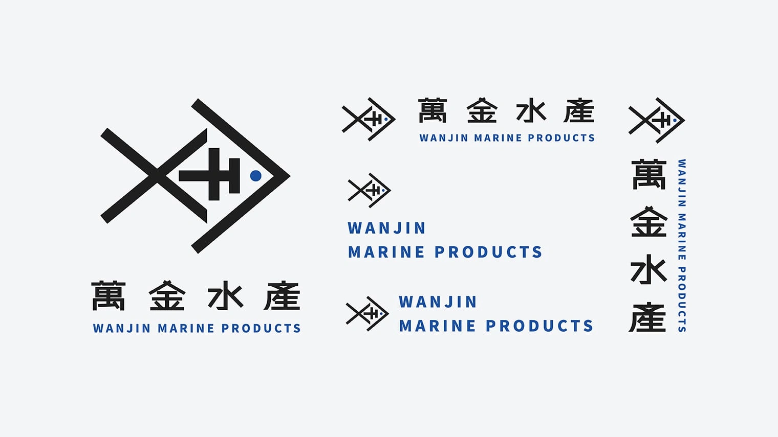 "萬金" (wànjīn) symbolizing abundance and wealth. Sleek lines form a fish shape, complemented by dark gray tones for depth and deep blue for tranquility.