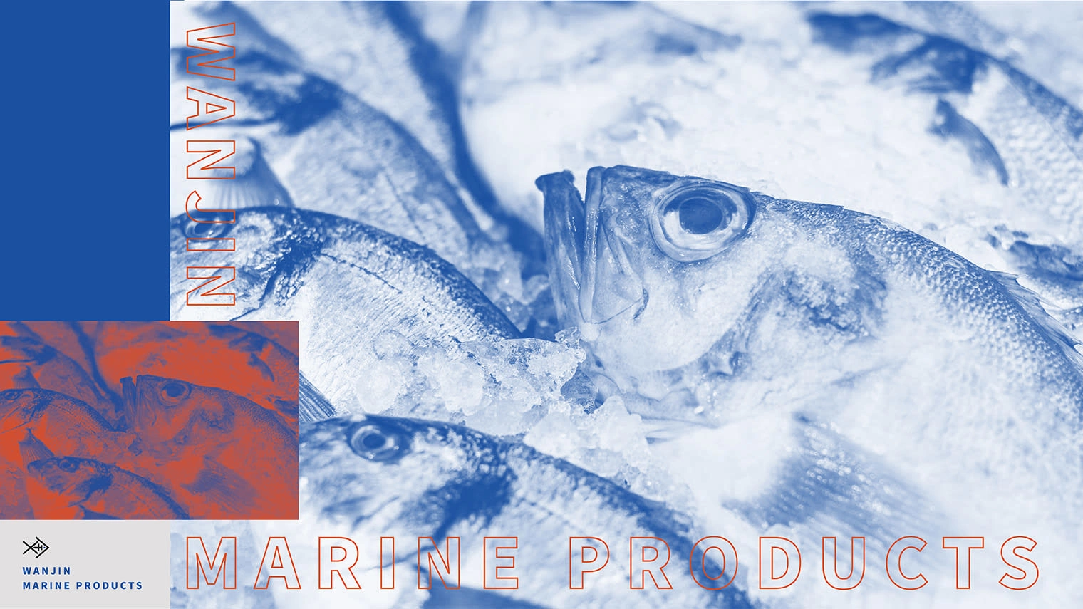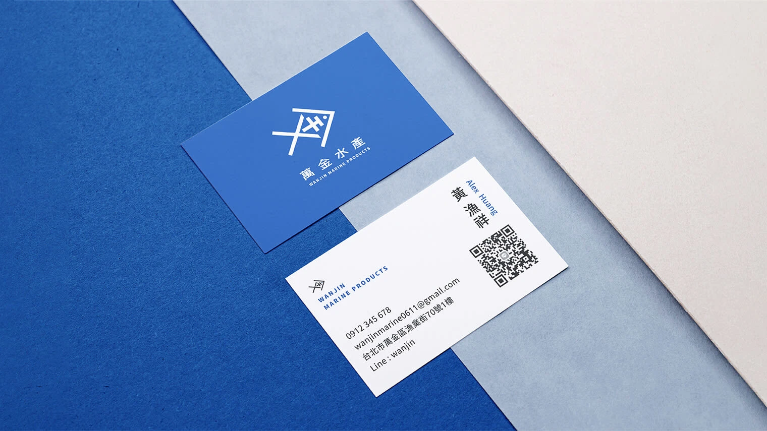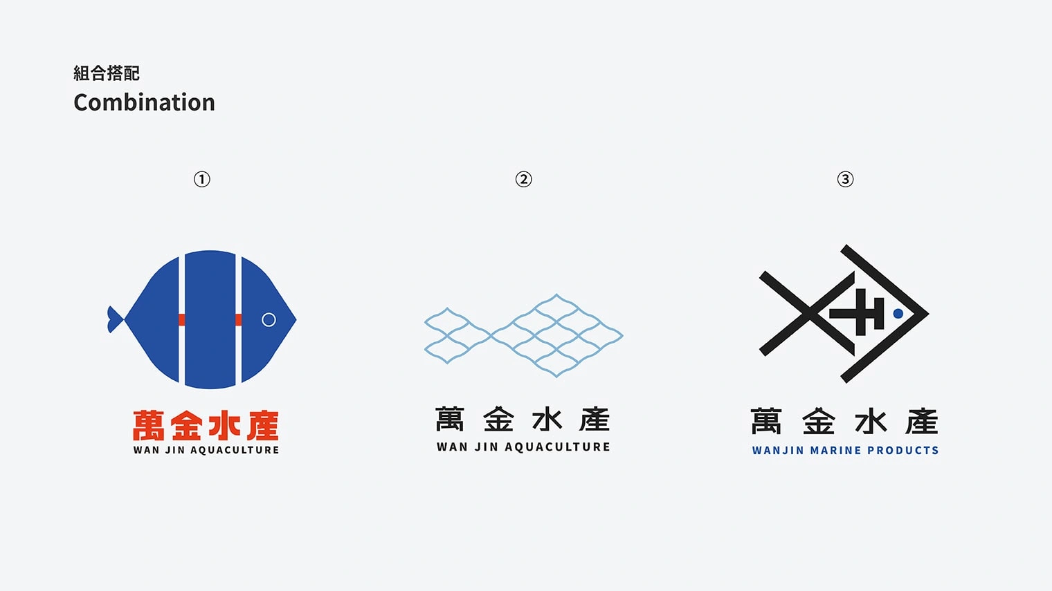 "萬金" (wànjīn) symbolizing abundance and wealth. Sleek lines form a fish shape, complemented by dark gray tones for depth and deep blue for tranquility.
