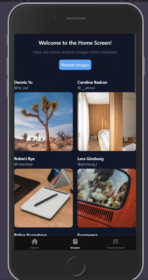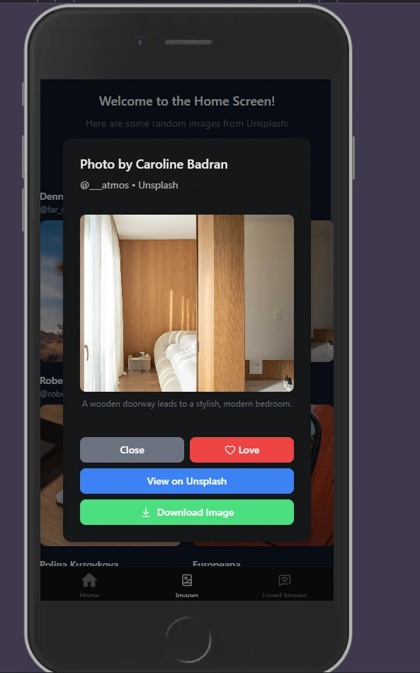 Gallery Features: Download images to device gallery, view on Unsplash, and manage loved images