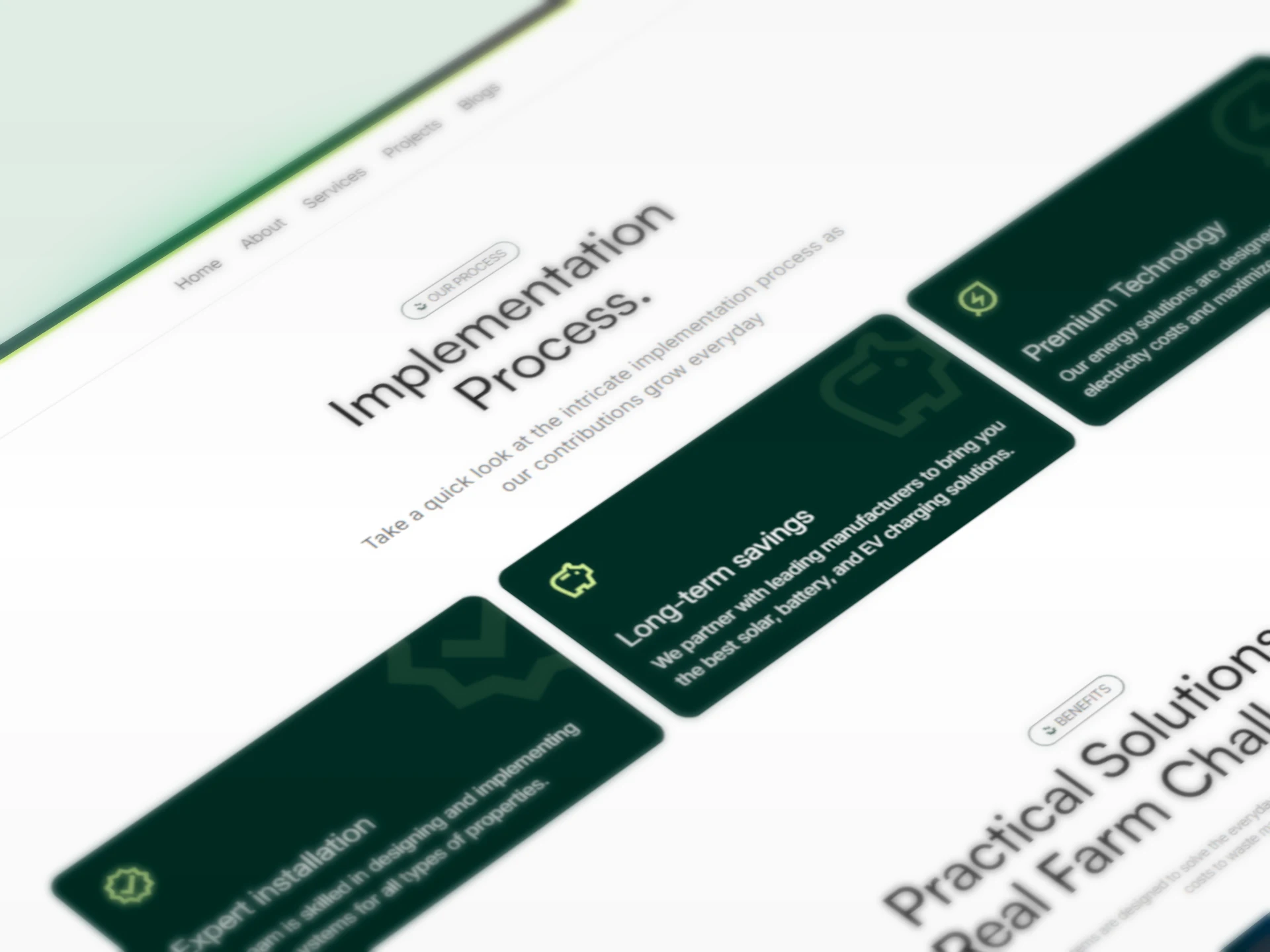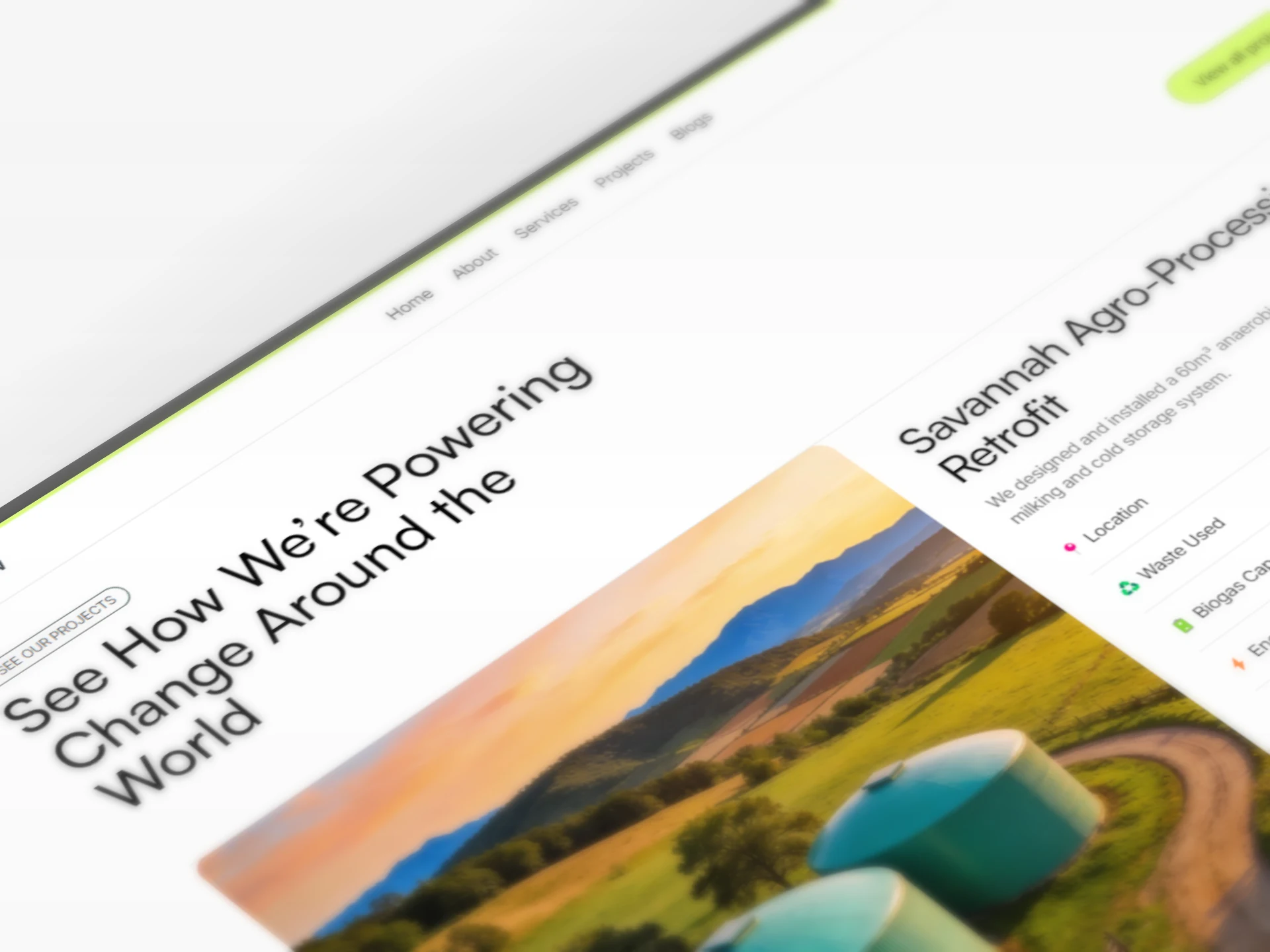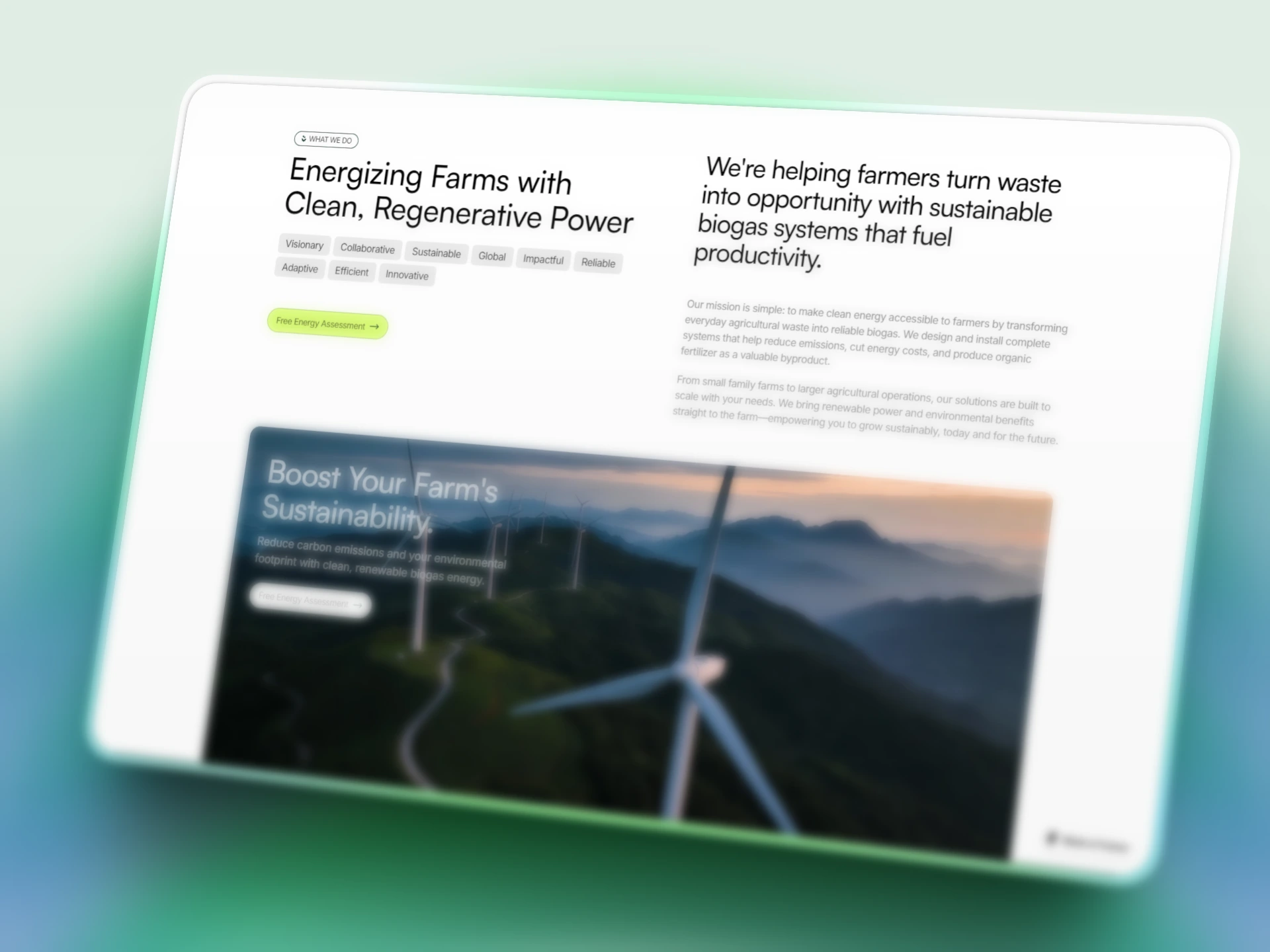 The visual direction emphasizes trust and environmental responsibility through a calming color palette of greens and blues, paired with authentic renewable energy photography. Each section was crafted to guide visitors through the company's mission, services, and impact in the clean energy sector.