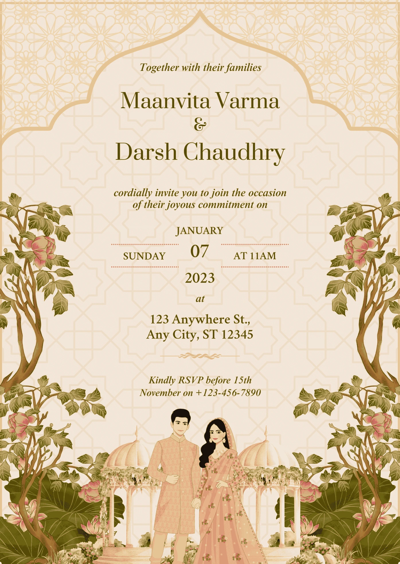 This is a sample wedding invitation design created by me using Canva. I specialize in crafting elegant and personalized wedding invitations that reflect your unique style and theme. Each design is fully customizable – from colors and fonts to text and images.