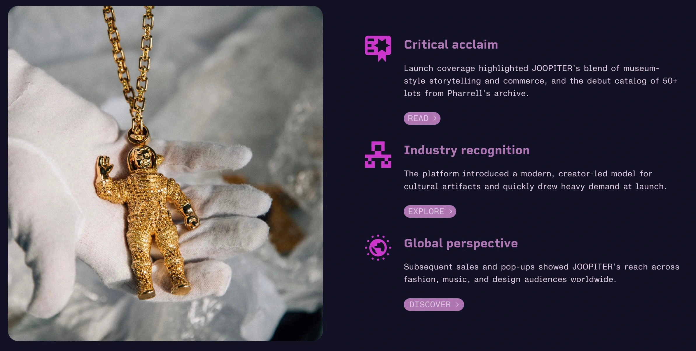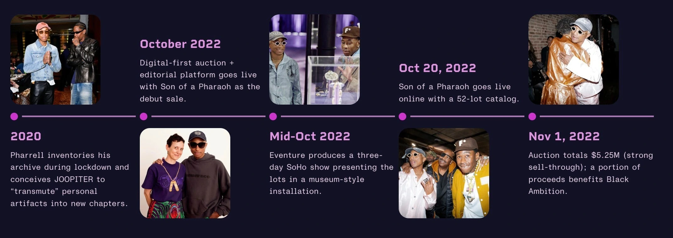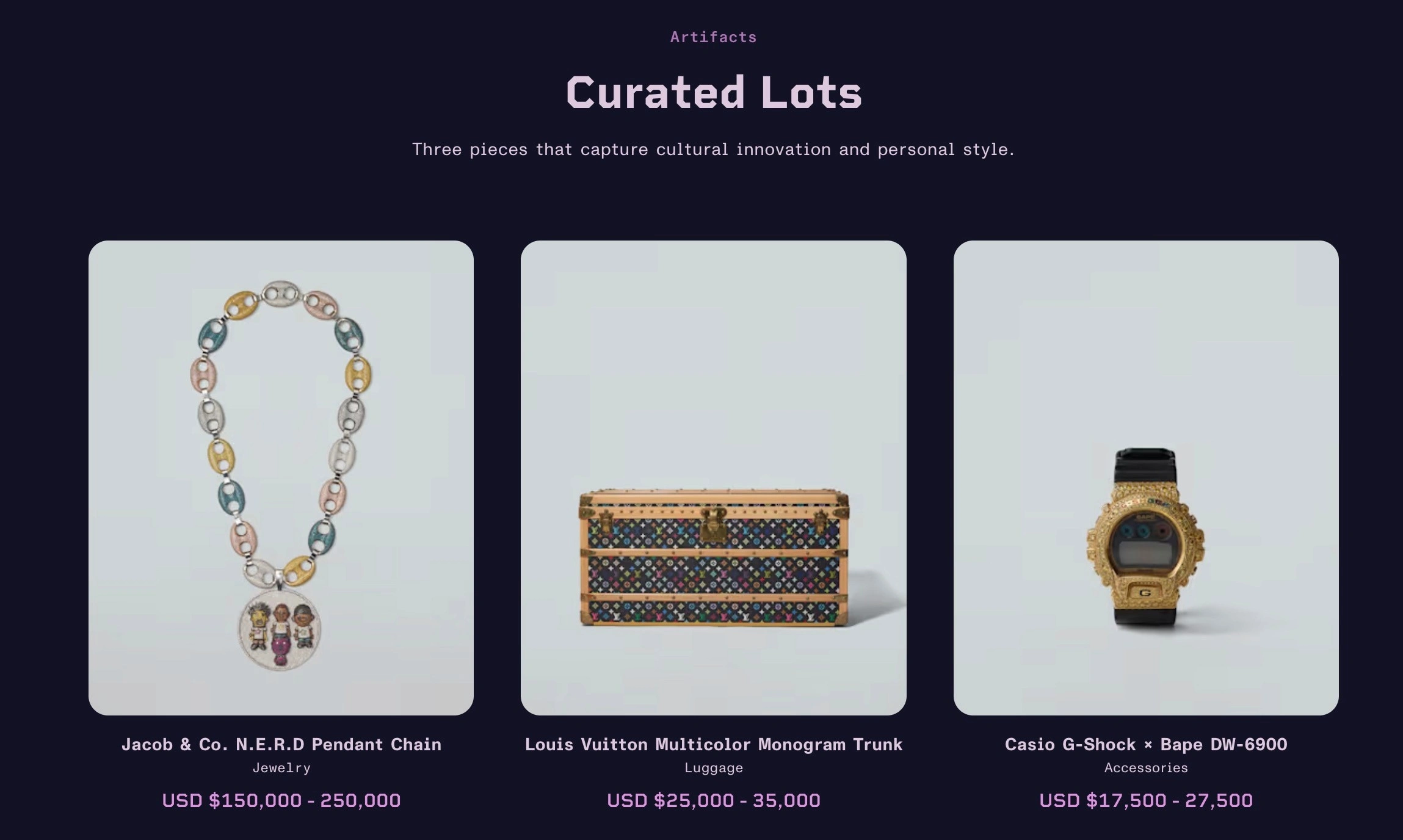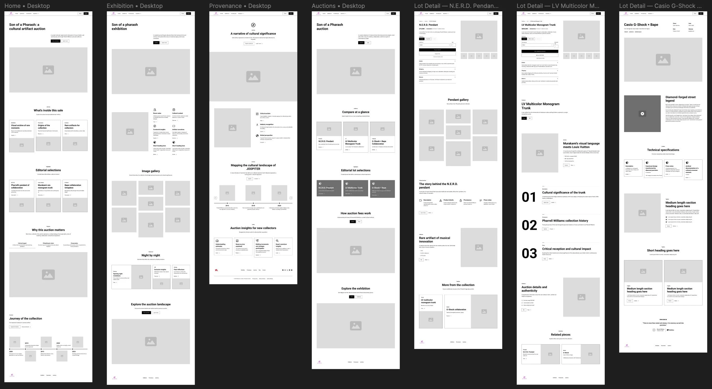 Reimagined Pharrell Williams’ “Son of a Pharaoh” sale as a digital auction that feels like an editorial feature, the redesign splits the experience into Discover vs Auctions, layers in timelines, exhibition context, and curated hero lots, and teaches first-time collectors how bidding.