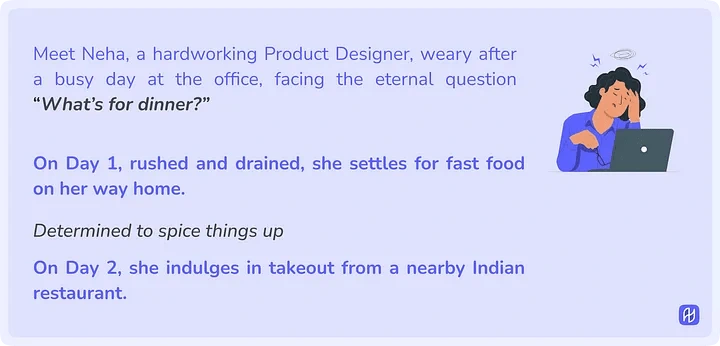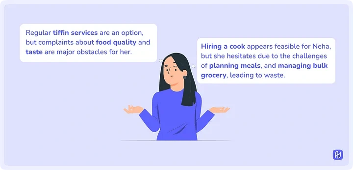At least on weekends, Neha wants to make a change. She desires to cook homemade meals using fresh ingredients, but the thought of planning recipes, grocery shopping, and meal prep overwhelms her. Neha wants a practical and efficient solution to simplify the cooking process and make it more accessible amidst her demanding schedule.