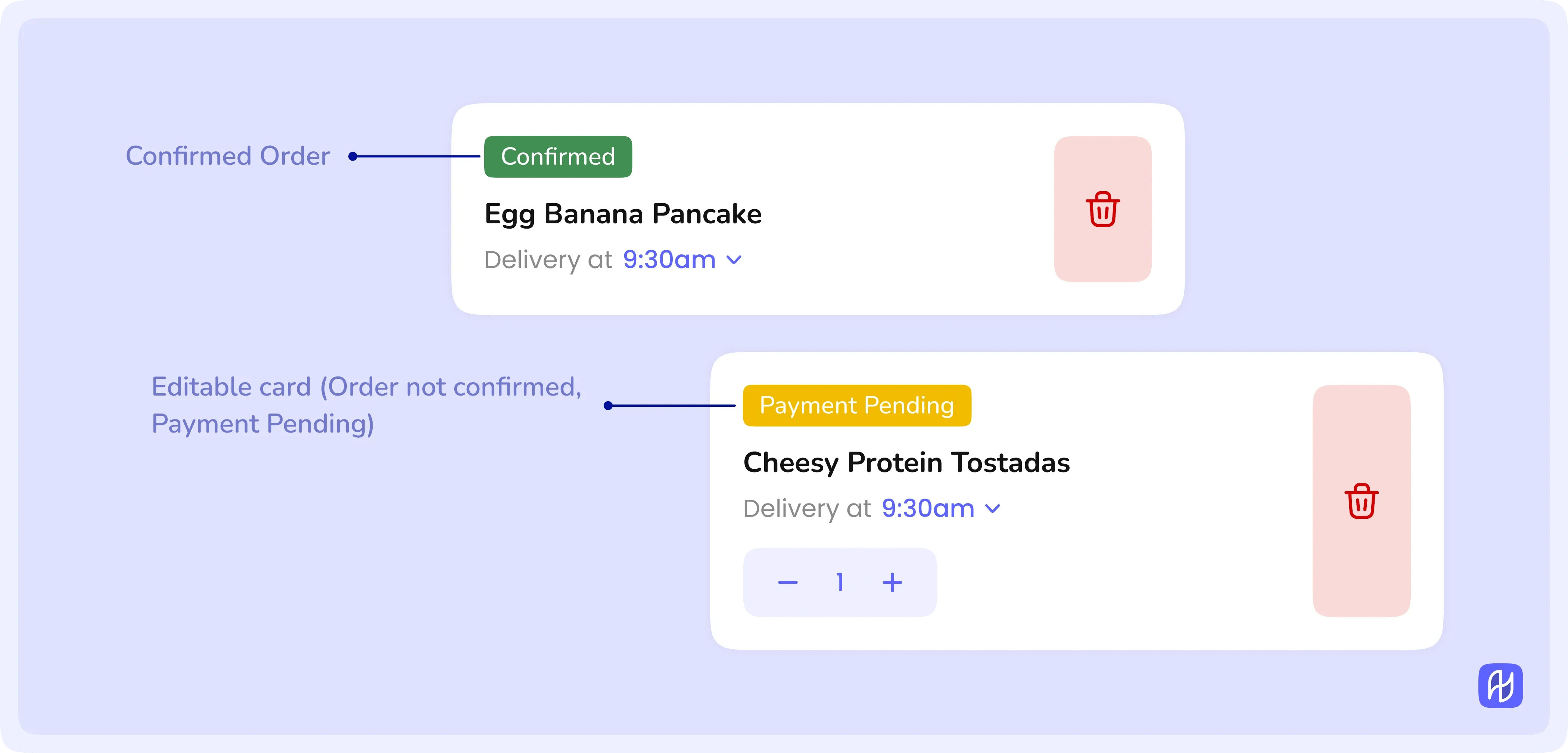 The card status shows if the recipe box is confirmed for delivery or its still just added to the meal scheduler and can be edited. These two cards help the user understand which recipe boxes are not confirmed.