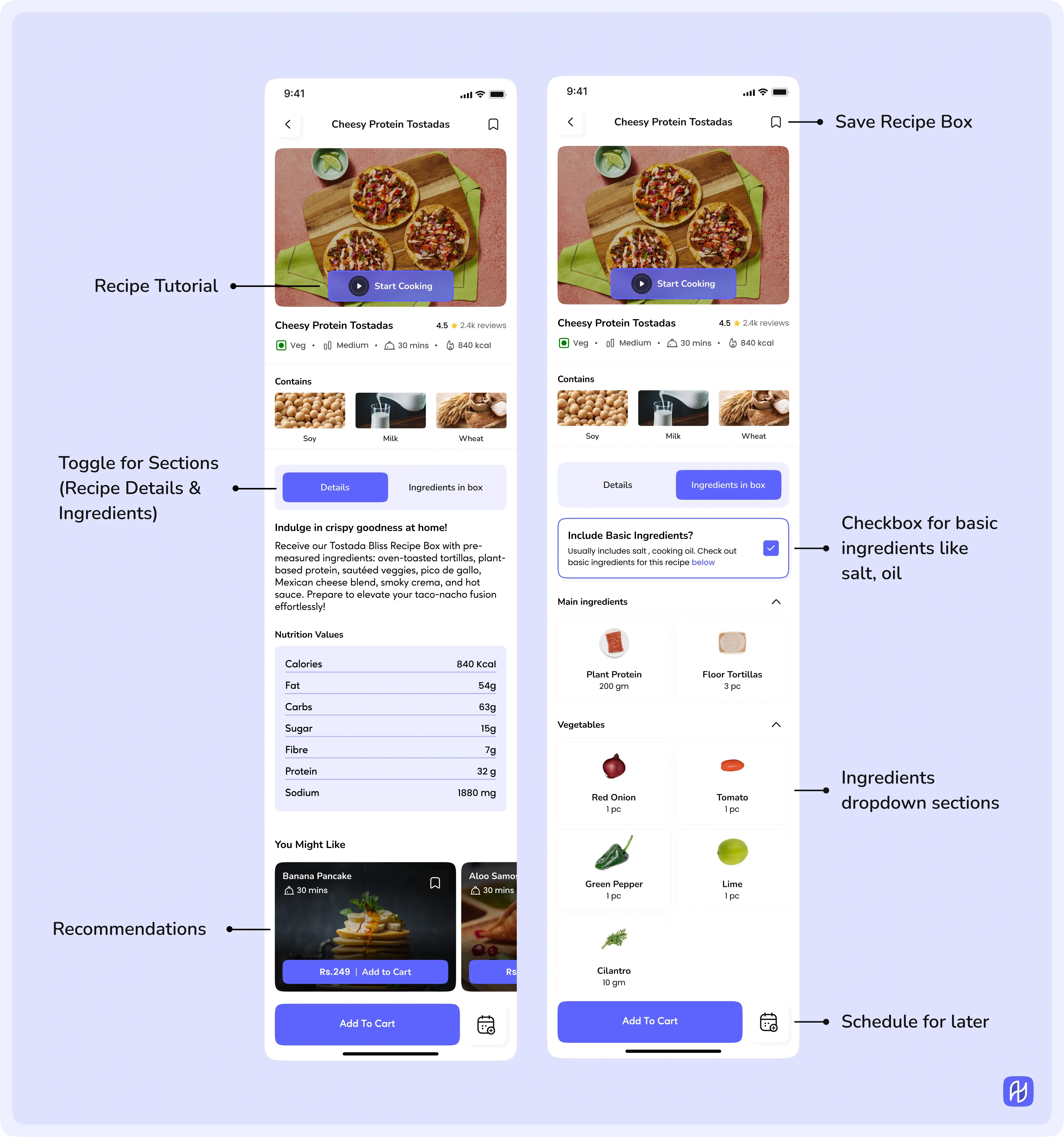 User can save favourite recipes, schedule for later, or add to cart for seamless cooking experiences.