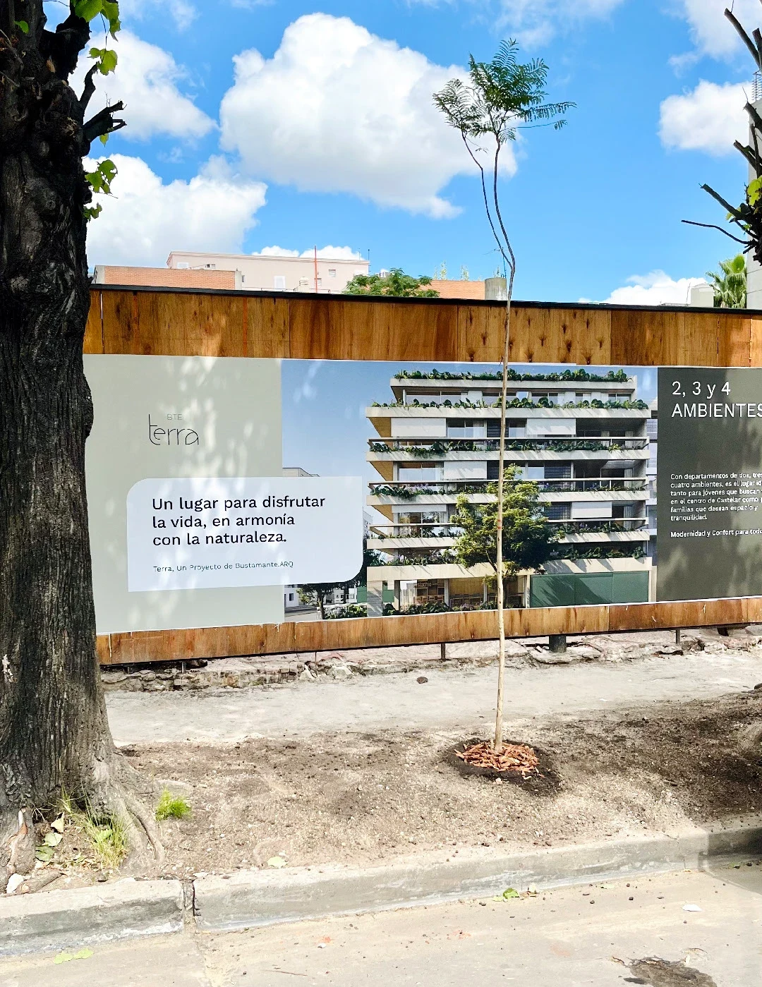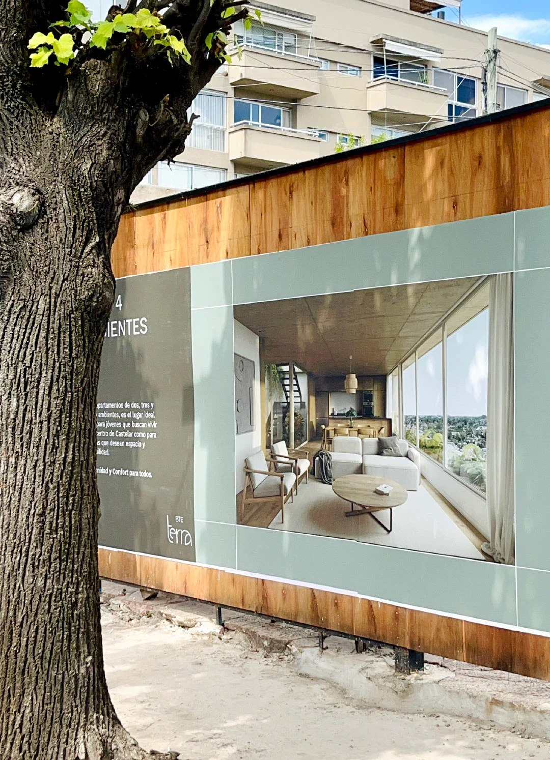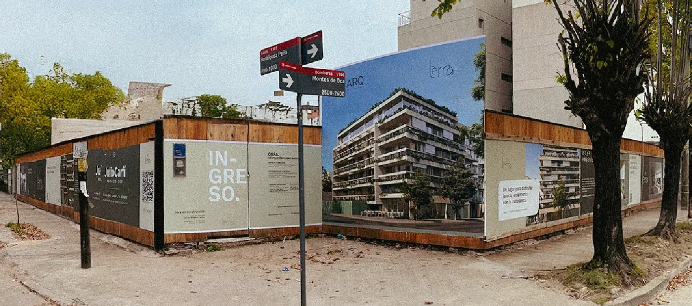 The goal was to create a large-scale construction site perimeter that transcends traditional signage. We aimed to invite passersby into an immersive visual journey. Spanning 110 square meters, the signage is thoughtfully divided into four sectors, ensuring maximum impact and clarity from every angle of the busy intersection. Each sector operates autonomously, allowing pedestrians to grasp the project’s essence whether coming from Rodríguez Peña or Montes de Oca.
