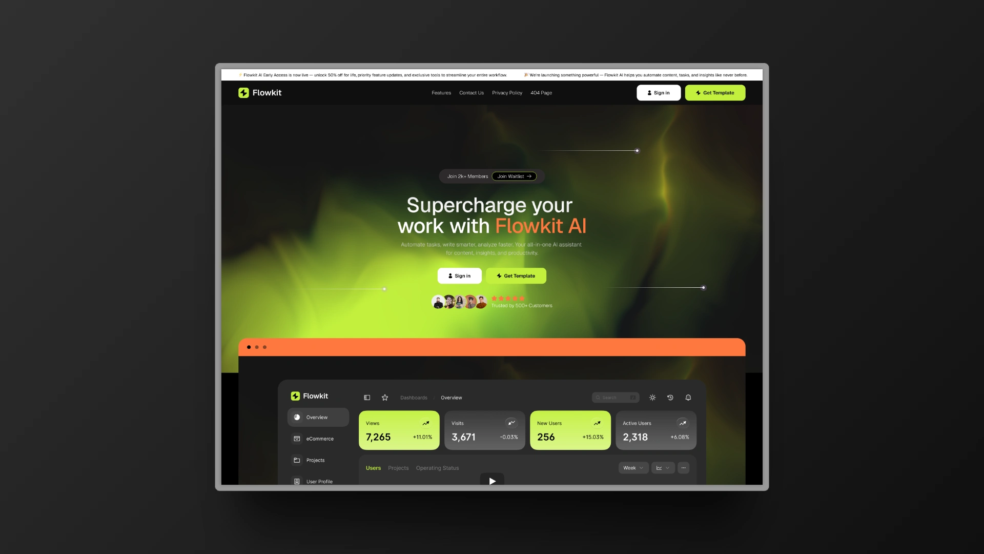 Built with modern UI/UX trends, using bold typography, vibrant gradients, and modular layouts, FlowKit AI ensures scalability and adaptability for any SaaS business.