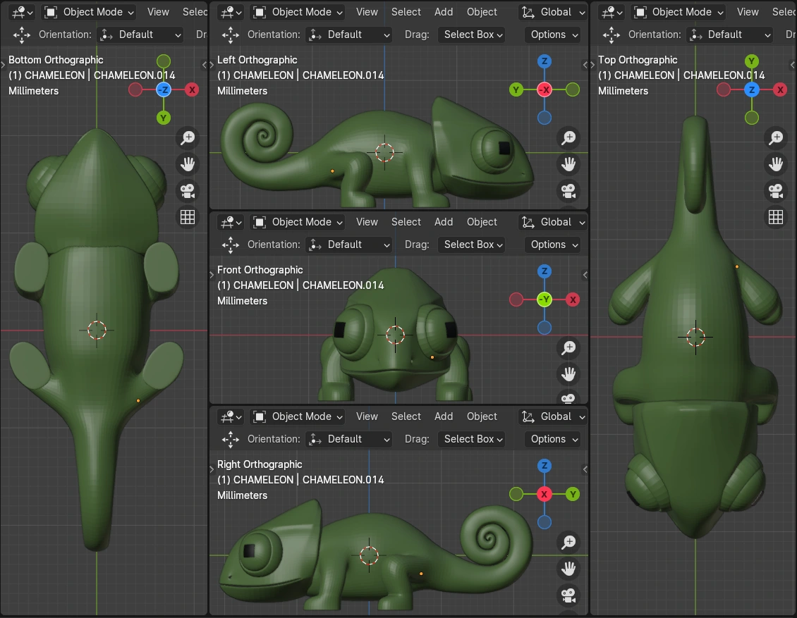 Designed a Cute Chameleon 3D model toy optimized for 3D printing. I exported in the preferred format. I then tested the print readiness of each piece.