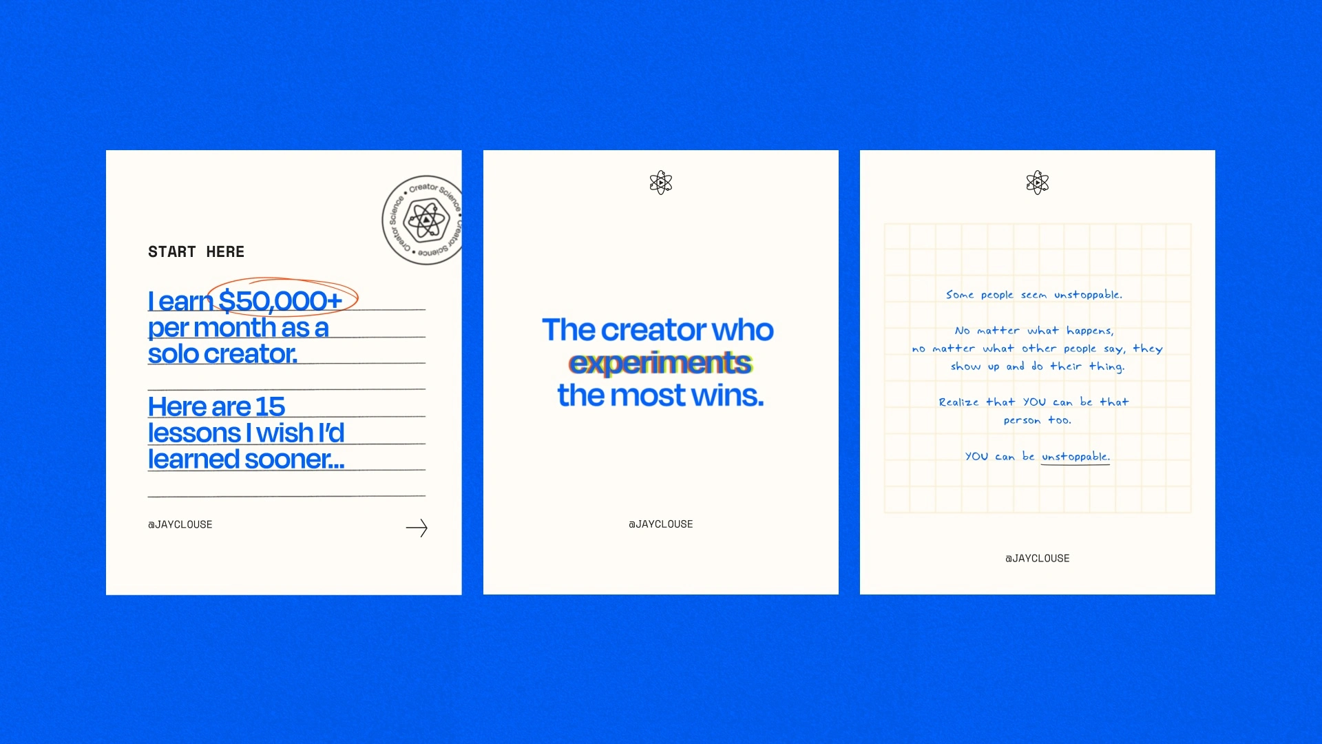 I was consistently surprised and delighted by how Hollie took my word salad of ideas and presented me with beautiful visual designs that reflected exactly what I was hoping for. I really don’t know how she did it. The whole project felt like an incredible partnership – I couldn’t recommend working with her more highly.” – Jay Clouse, Creator Science