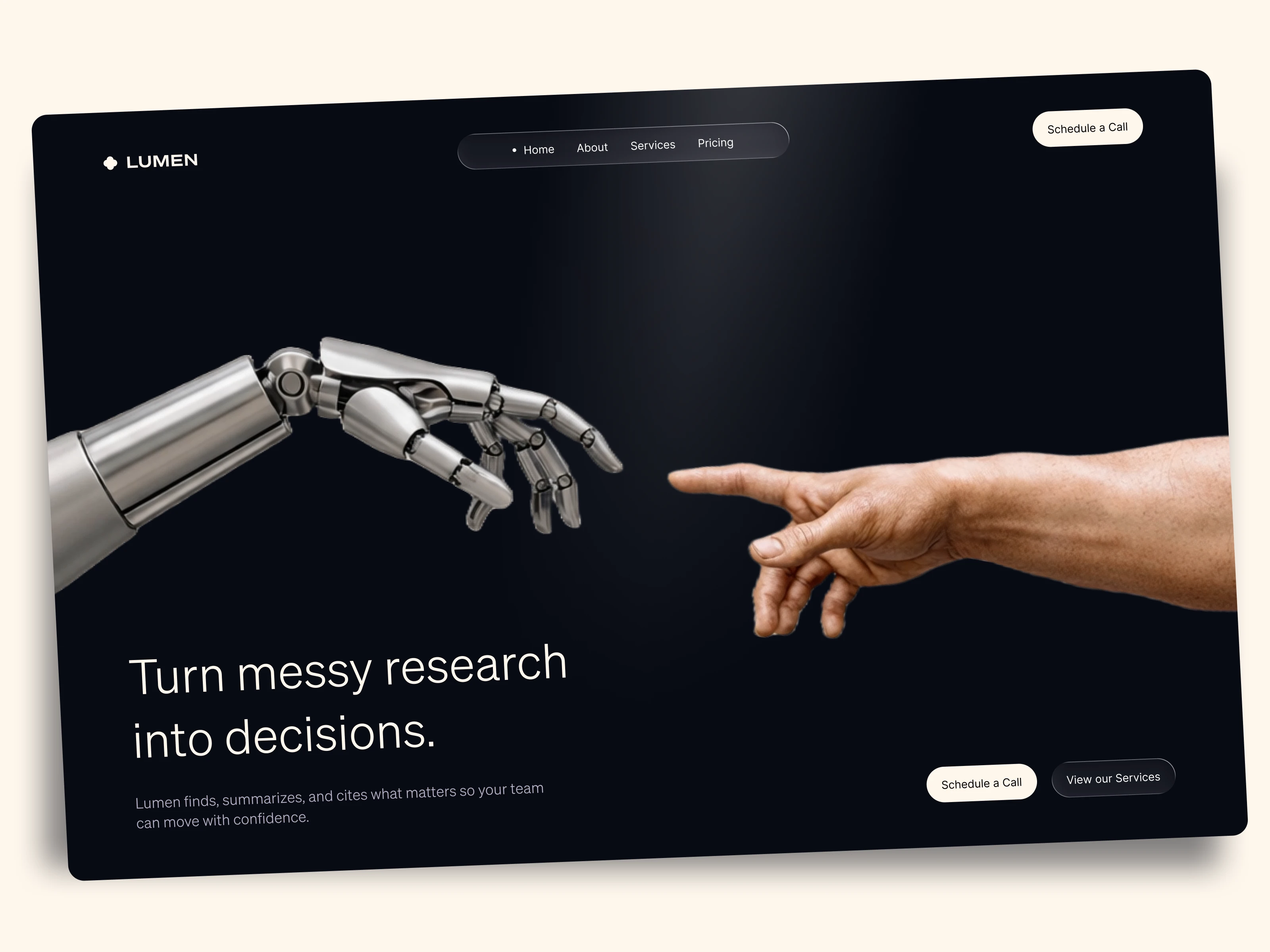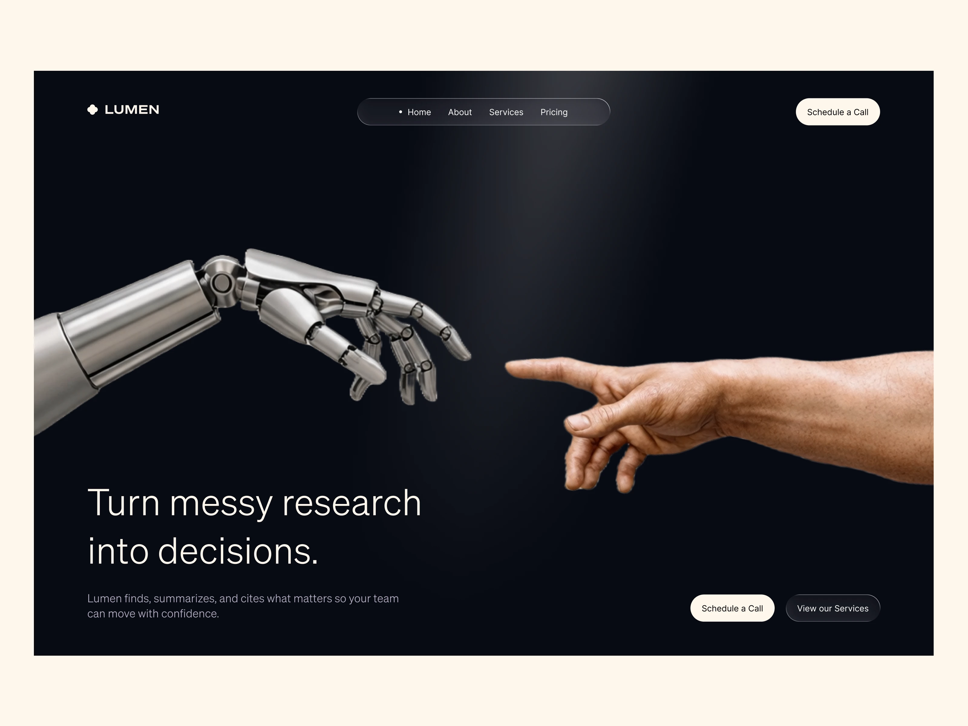 For the hero section, I chose a visual of a robotic hand reaching for a human hand. This wasn't just decoration; it visually communicates the core value proposition: AI assisting human intelligence, not replacing it. This creates an emotional hook instantly.