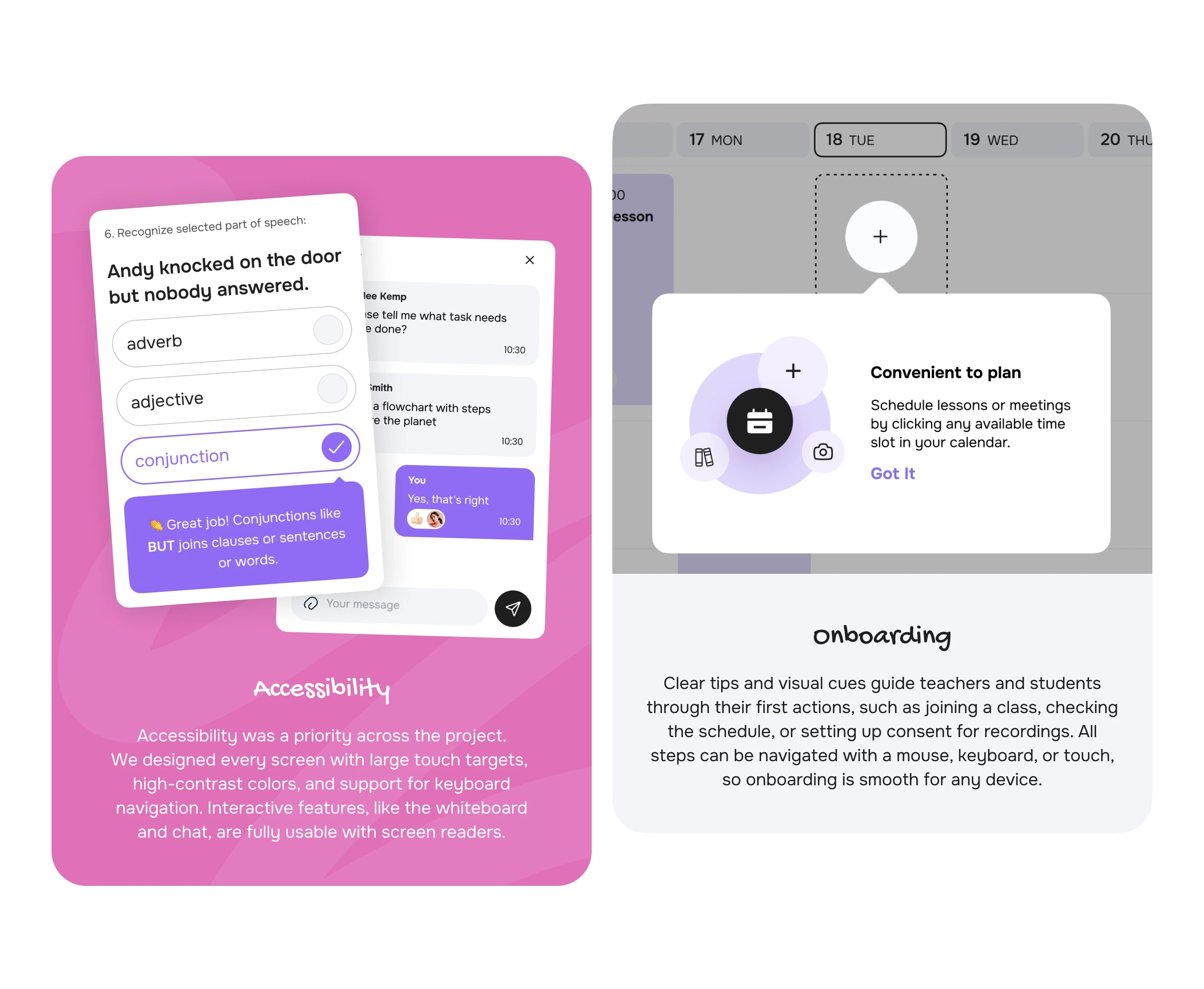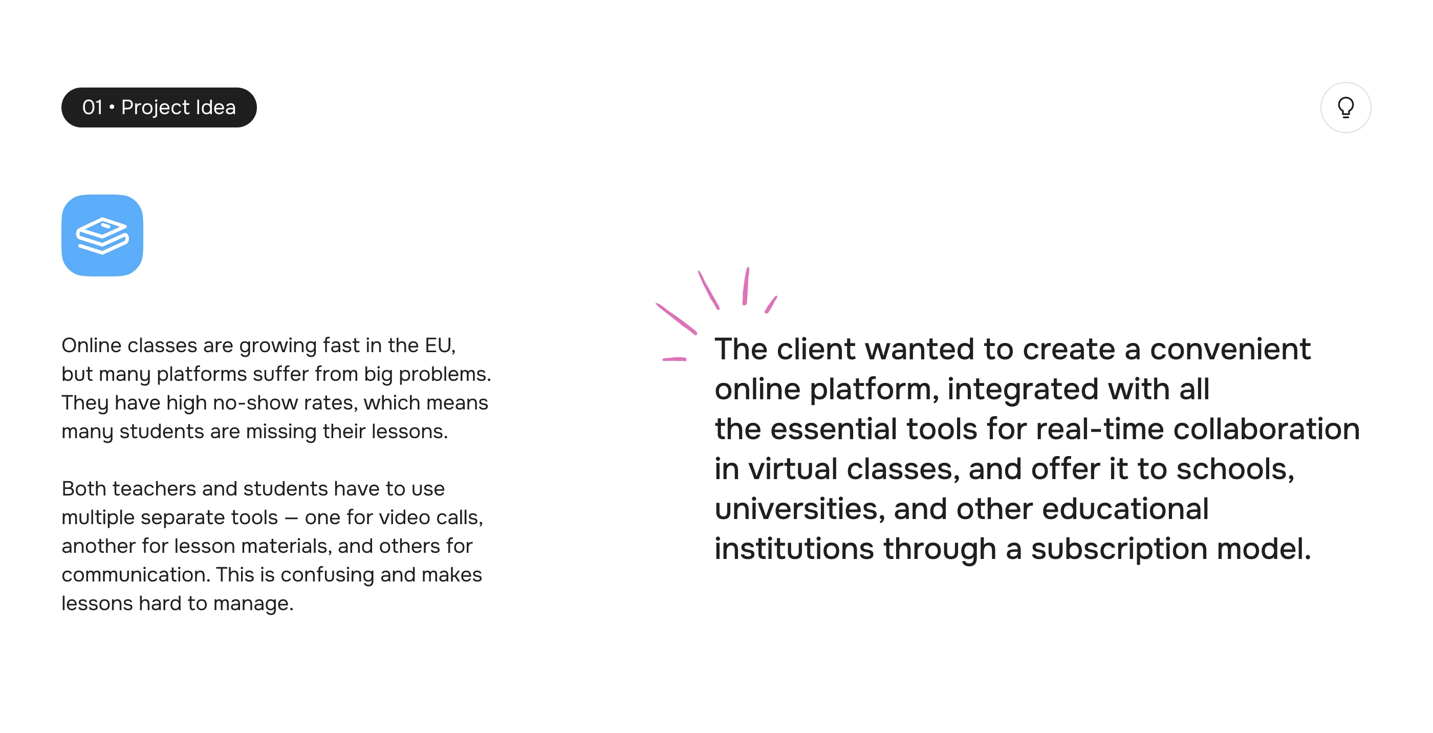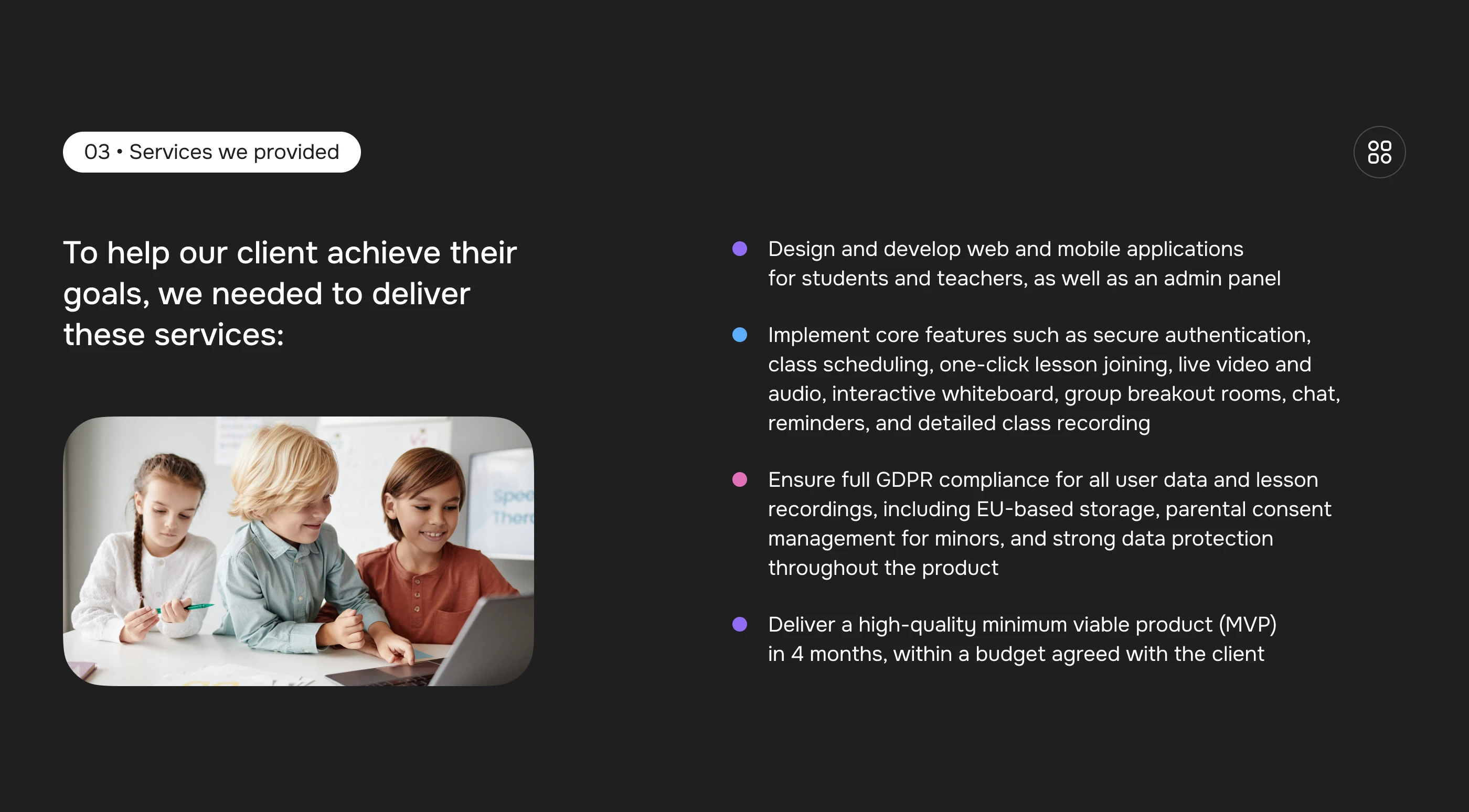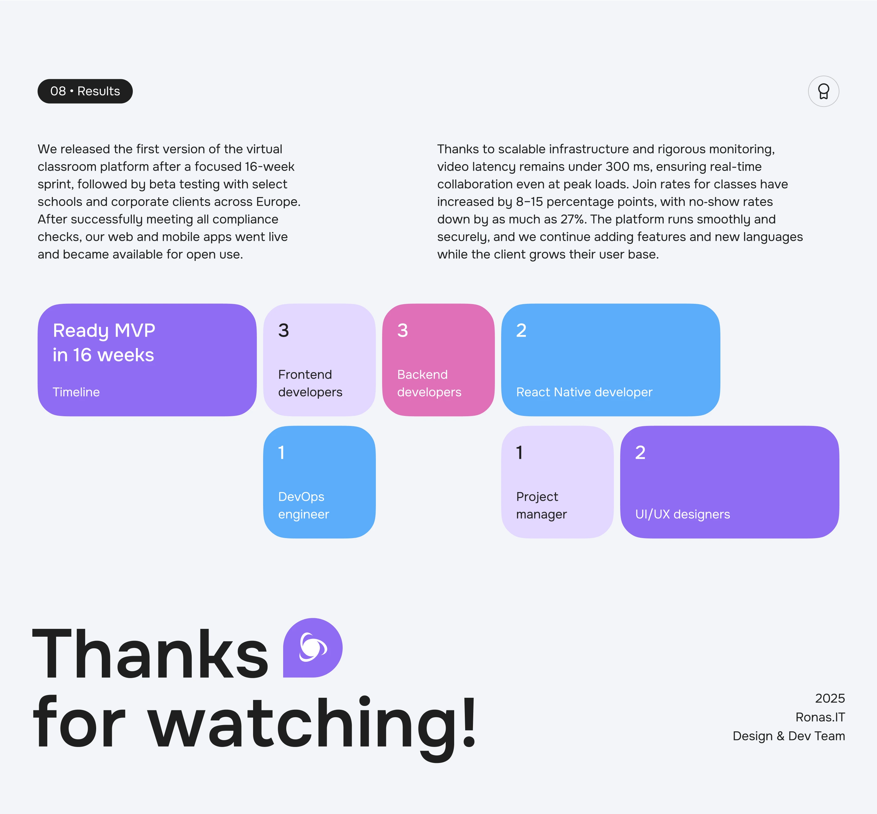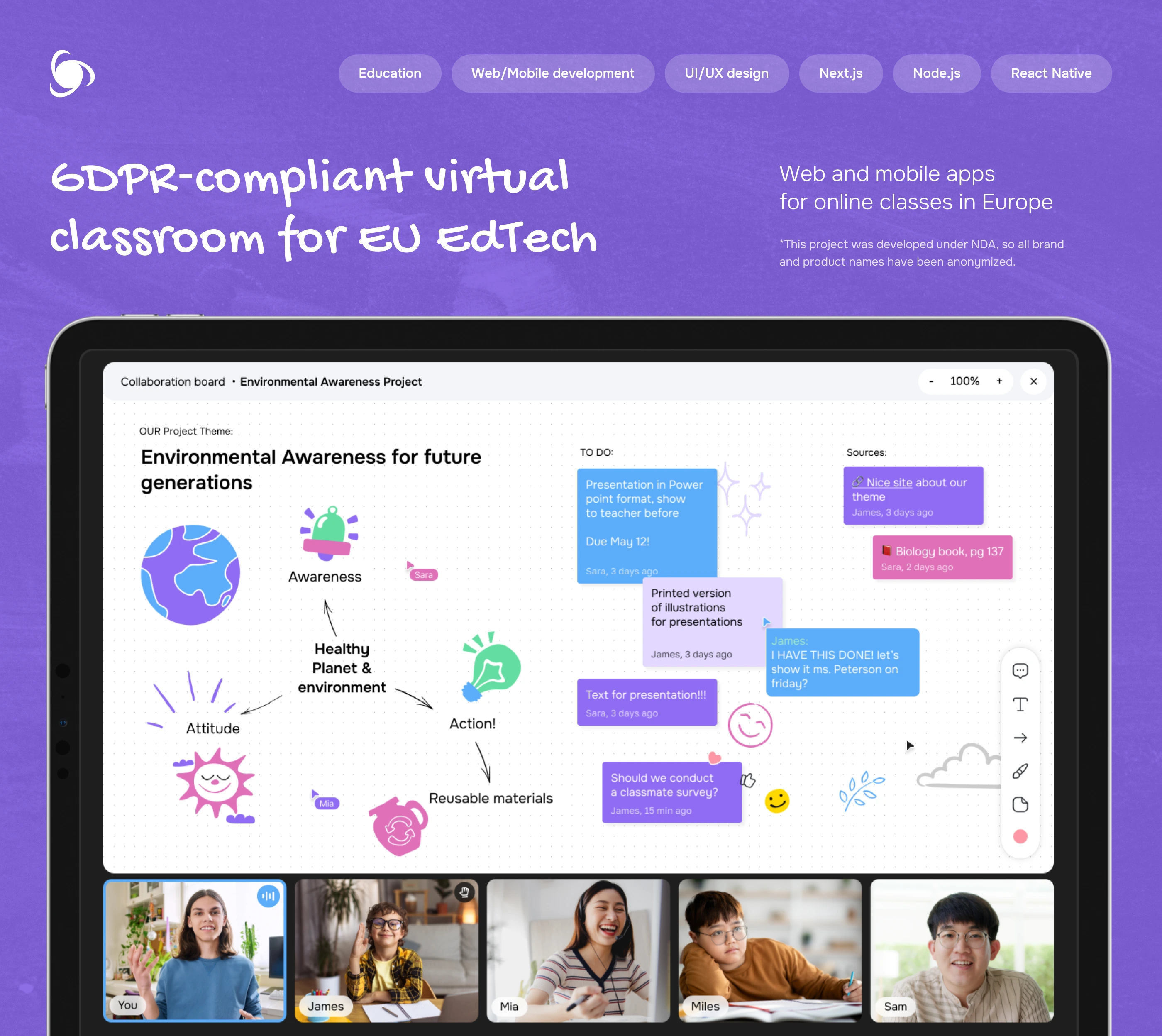 Ronas IT designed and developed a GDPR-compliant virtual classroom platform specifically for the EU EdTech market. This comprehensive solution features robust web and mobile app development (Next.js, Node.js, React Native) for schools and universities, offering a seamless online learning experience. We delivered an intuitive virtual classroom with real-time video, interactive whiteboards, chat, smart scheduling, and secure EU data storage. Our UI/UX design prioritized accessibility (WCAG 2.2 AA, EN 301 549), parental consent management for minors, and significantly reduced student no-shows. This custom educational application ensures privacy, reliability, and high engagement for teachers and students across Europe.