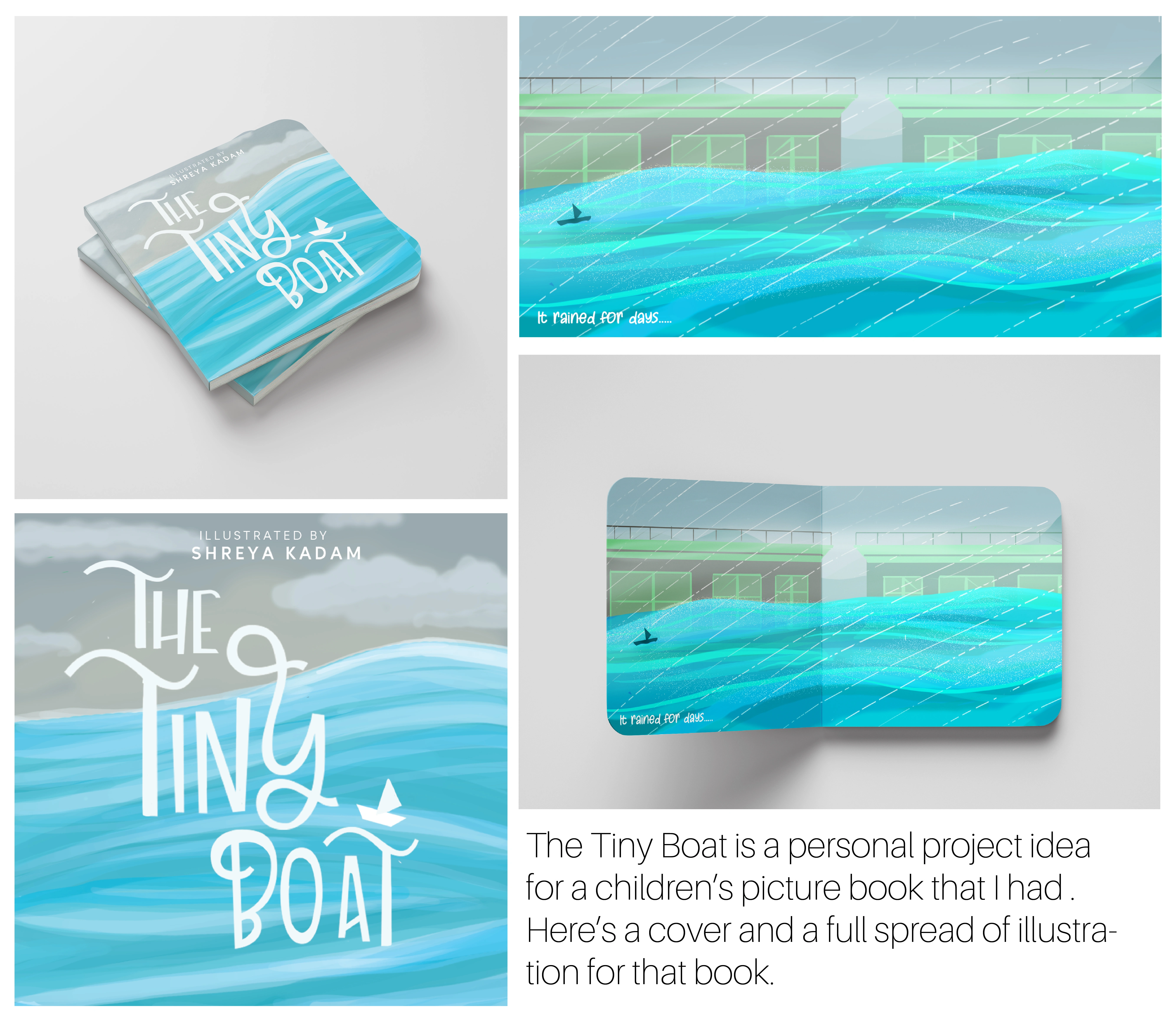 A personal children’s book cover concept titled The Tiny Boat. This piece explores storytelling through whimsical scenes and soft colors, capturing the curiosity & wonders of childhood.