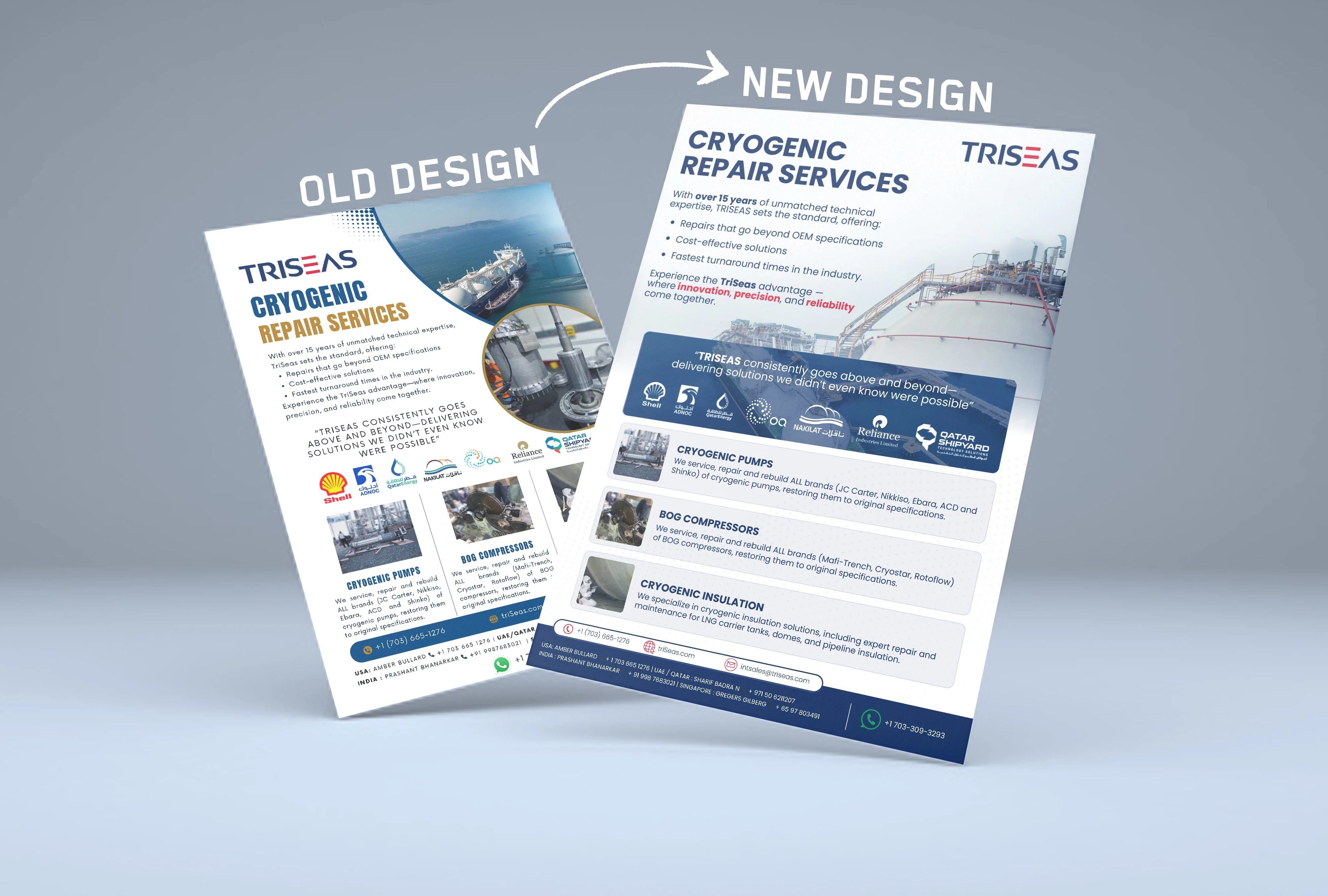 Successful redesign transforming Triseas’ cryogenic repair flyer into a cleaner, modern, and more professional layout that improves clarity and credibility.