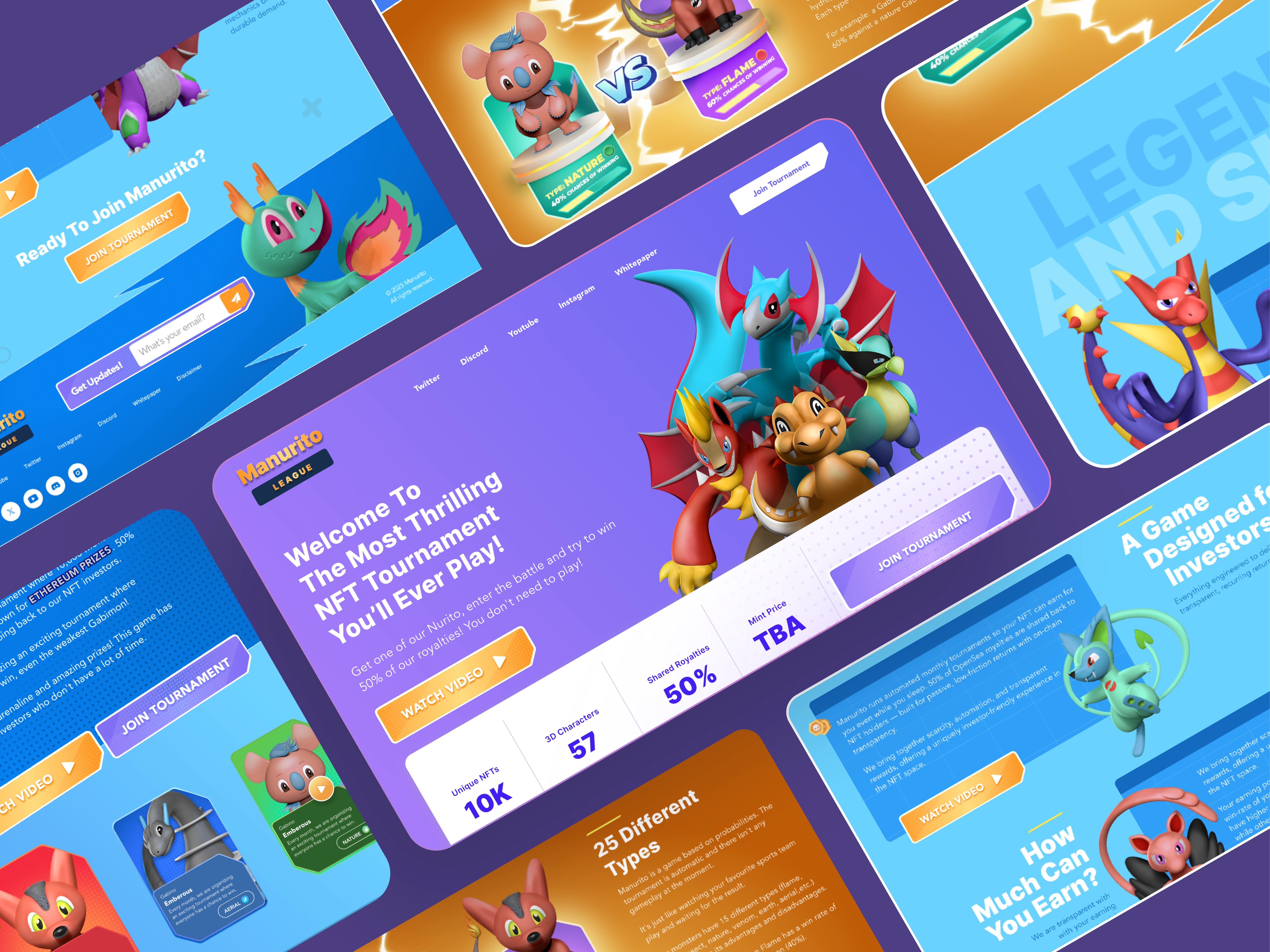 Bold gradients (blues, purples, oranges) create distinct thematic sections while maintaining cohesive flow. Each Nurito character is prominently featured with high-quality 3D renders that emphasize their unique personalities.