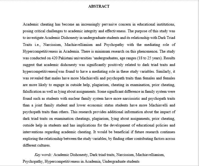 This is the research project on the topic 'Dark Triad Traits predicts academic dishonesty with the mediating role of hypercompetitiveness among university students'. The client got A grade for this project as it was required for the fulfillment of his masters program.