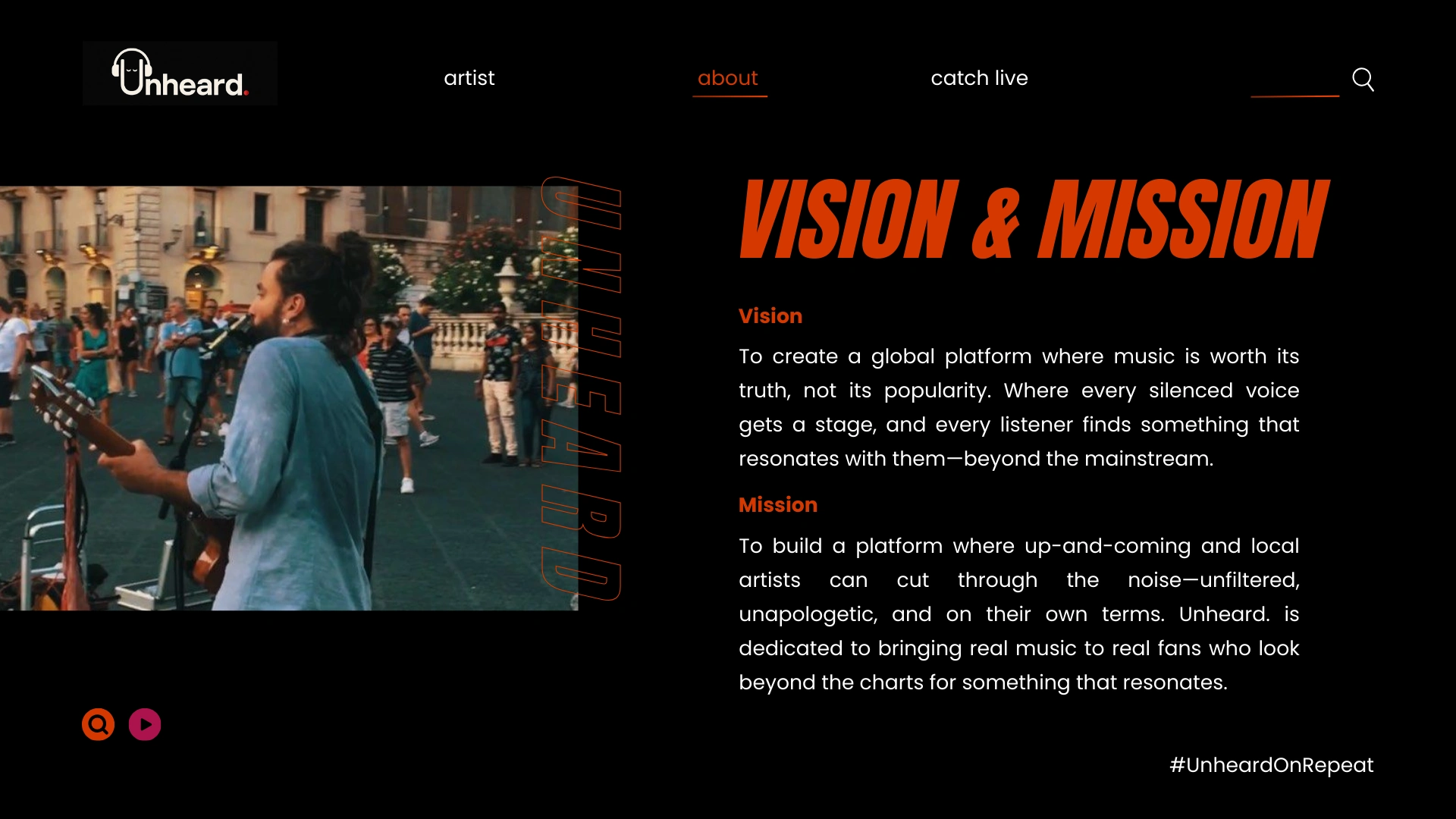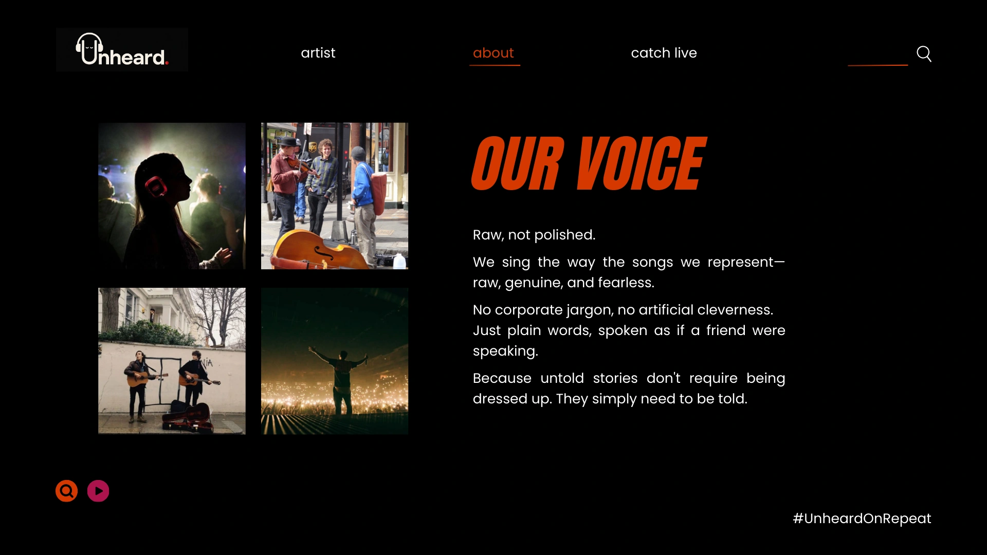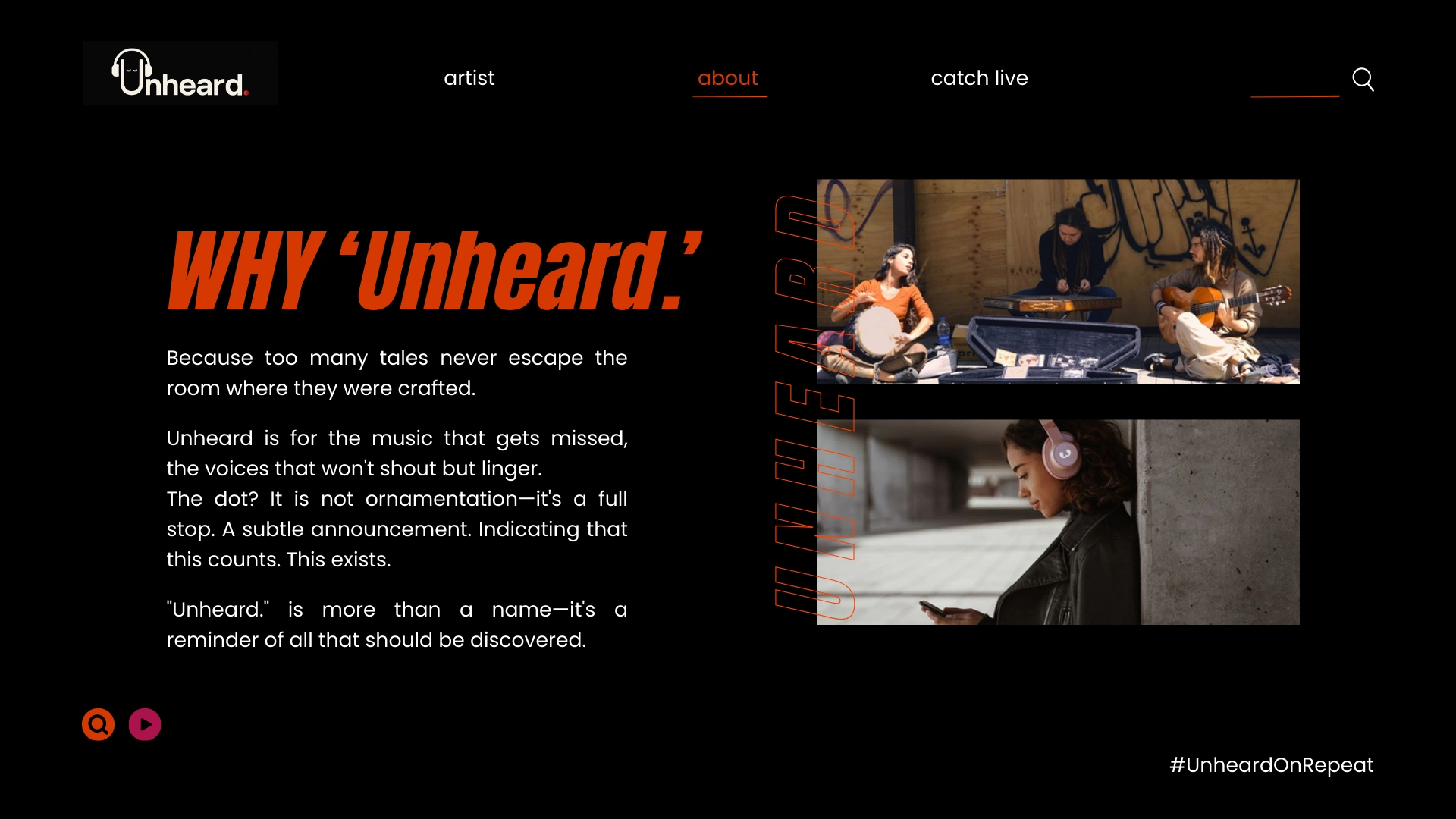 Unheard. is a mock music platform designed to spotlight underrated and independent artists who often get overlooked in the mainstream. The branding reflects authenticity, raw talent, and a stage for voices that deserve to be heard.