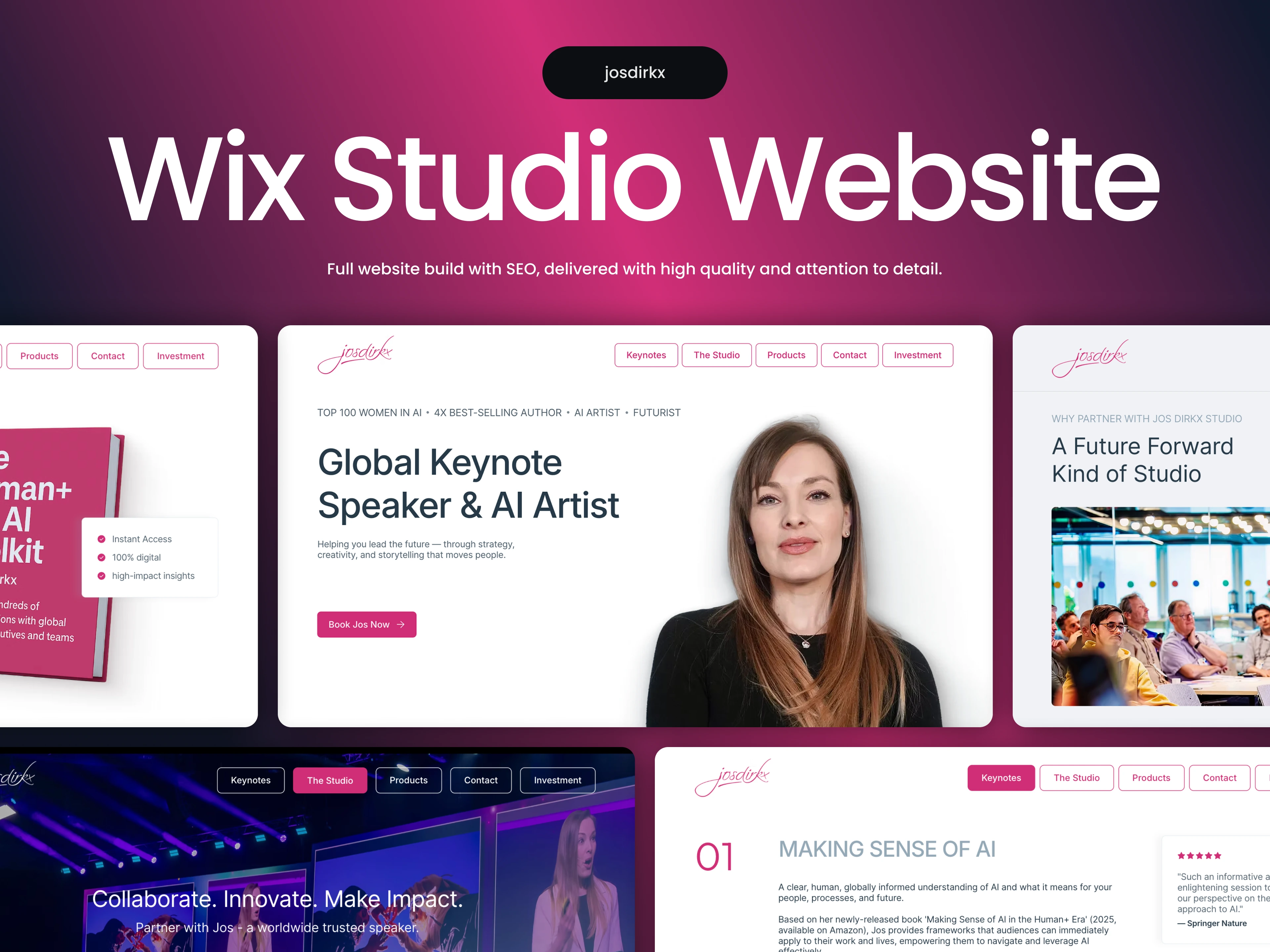 We designed 6 pages and transformed it into a fully responsive, high-end Wix Studio website for Jos Dirkx - a global keynote speaker, AI artist, and bestselling author. The goal was to maintain the cinematic, clean aesthetic while enhancing visual clarity, responsiveness, and lead generation. We recreated and refined the layouts in Wix Studio, added two custom forms (Contact + Investment), and layered in subtle scroll effects for a polished, professional finish. SEO, metadata, and mobile optimization were included to support visibility and conversions.