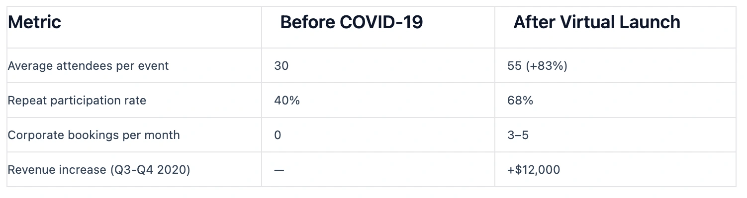 ✅ Opened new corporate revenue streams (+$12k in 6 months)