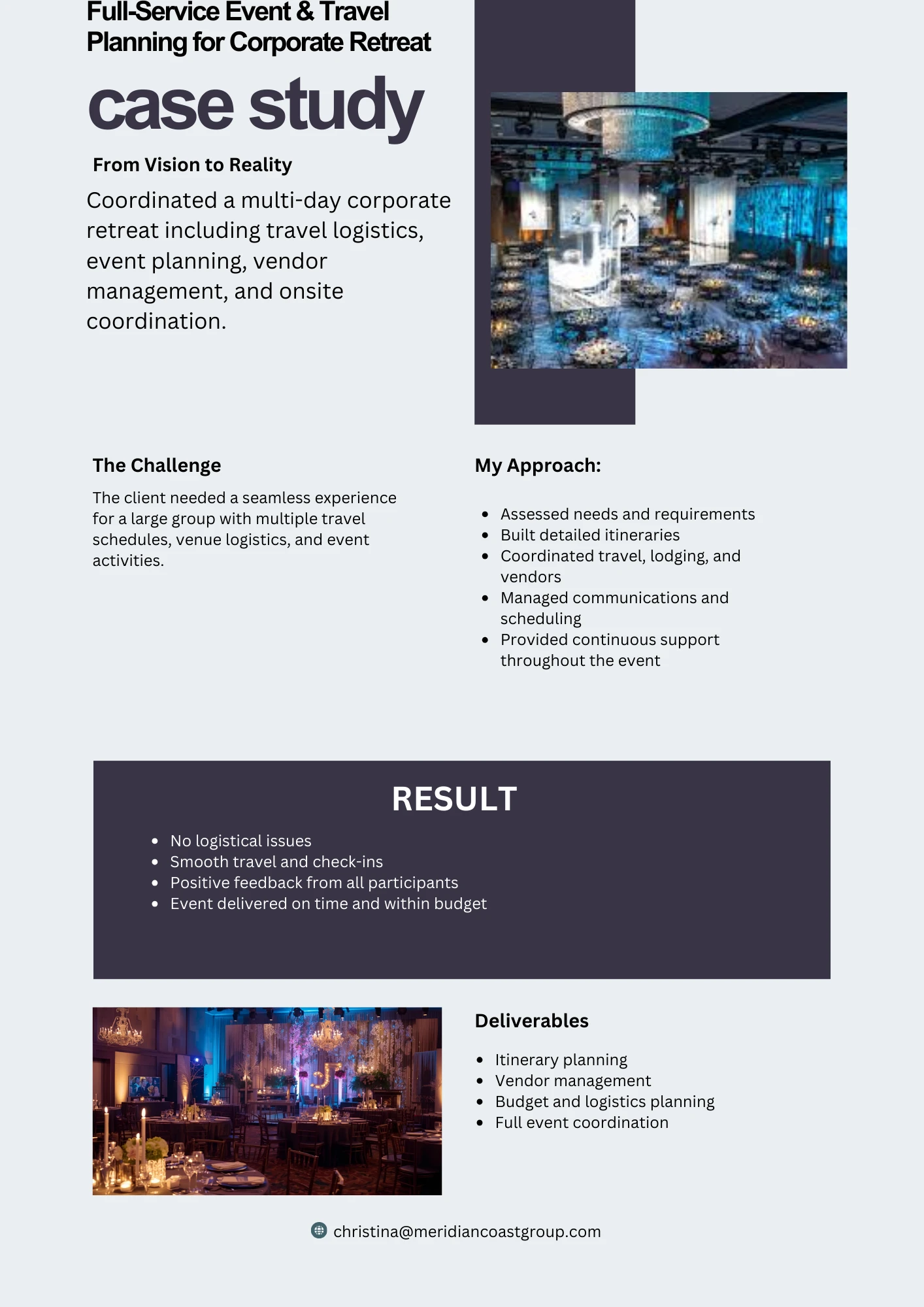 My Approach: Assessed needs + requirements Built detailed itineraries Coordinated travel, lodging, and vendors Managed communications and scheduling