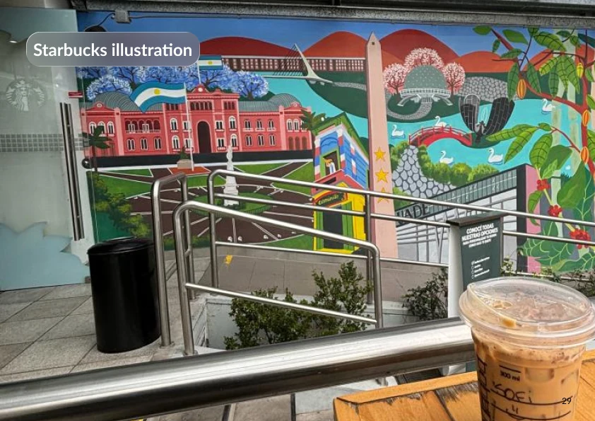 My proposal links the flora of Brazil, the largest importer of coffee, with that of Buenos Aires. It incorporates emblematic places such as the Obelisk, the Casa Rosada, the Japanese garden, Caminito, the Plaza de Mayo and the Women's Bridge, as well as the Argentine University of the Company, where the mural will be exhibited. The design aims to represent the interaction between nature and the urban environment.