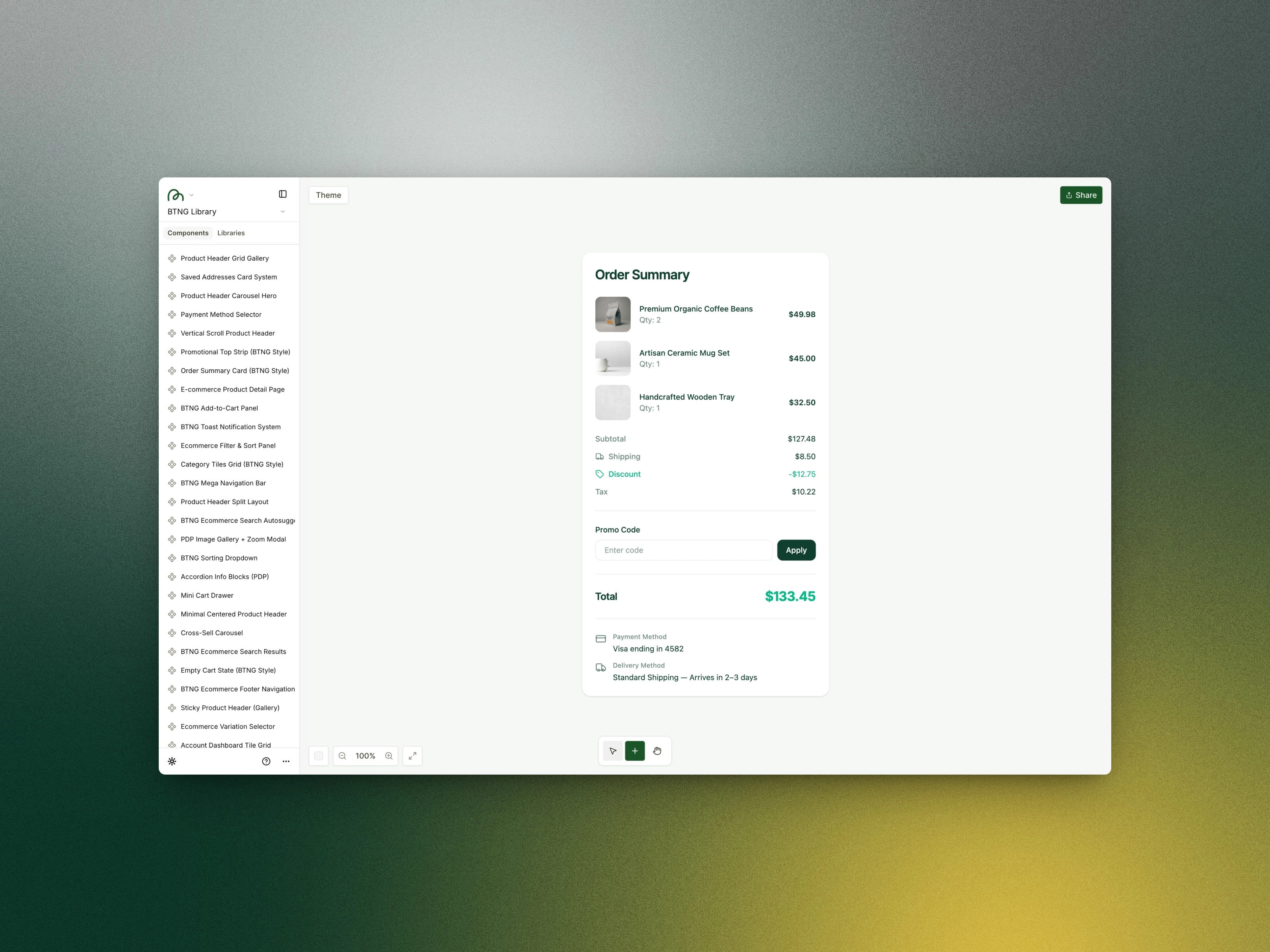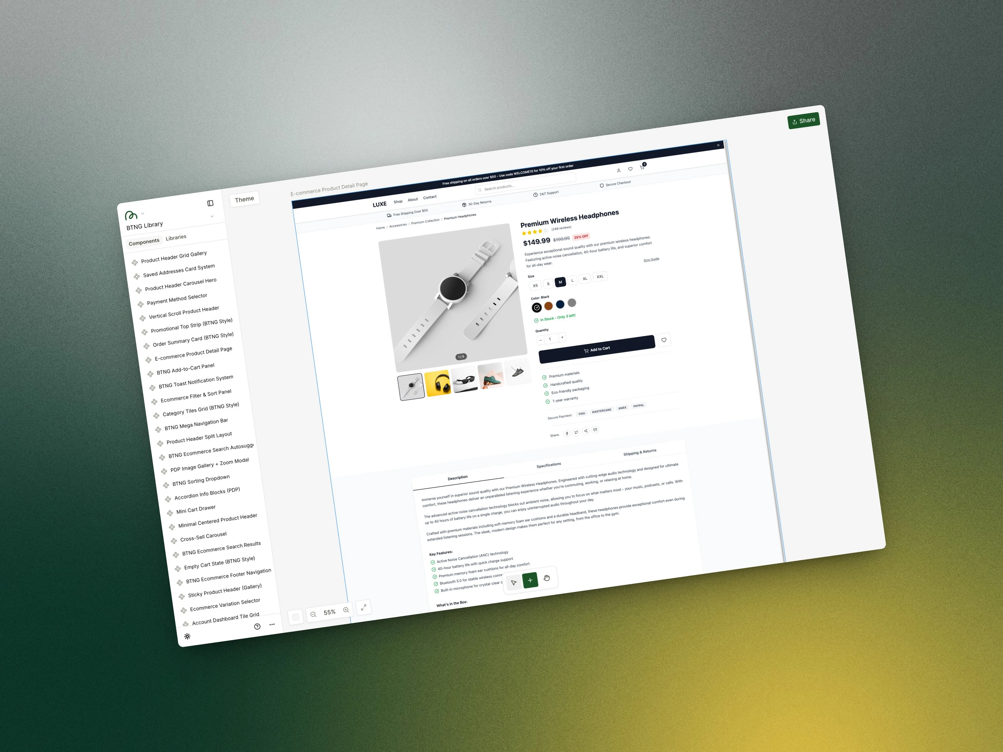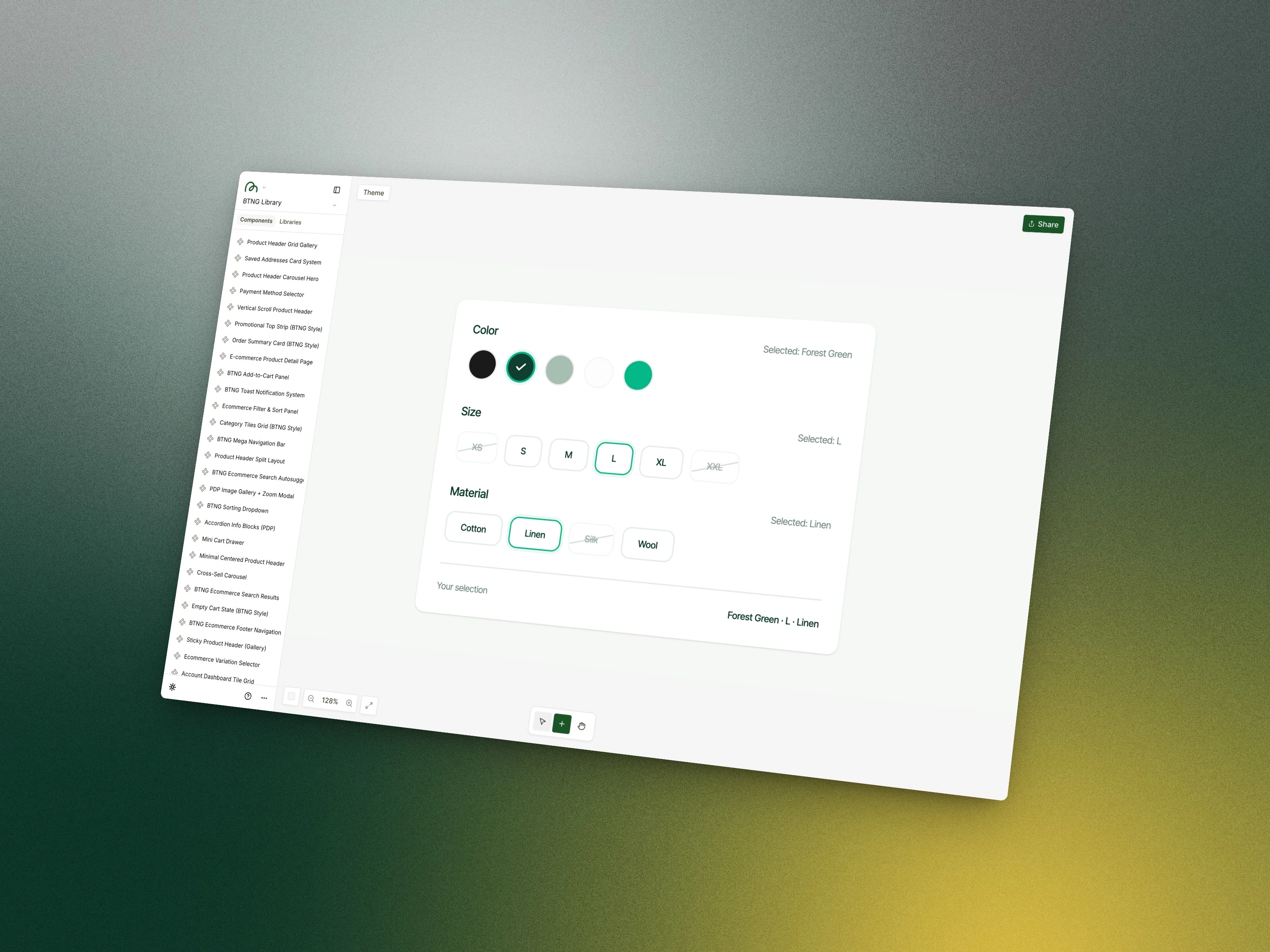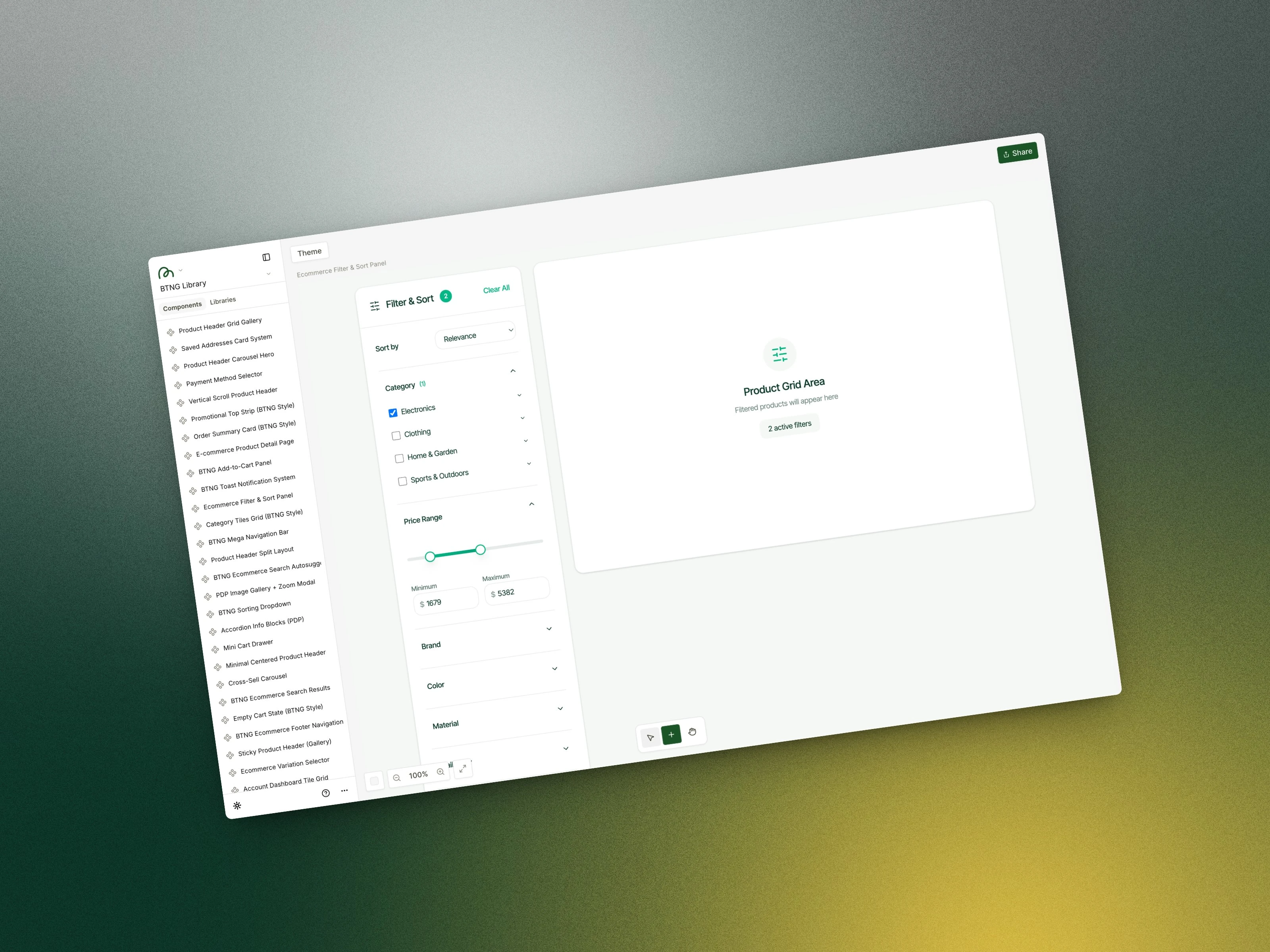 This comprehensive filtering component allows users to sort by relevance and filter by company, price range, brand, color, and material. Filter design has a massive impact on product discovery, and this interactive prototype lets teams test different filter hierarchies and interactions before committing to development. Users can click, filter, and see results update in real-time.