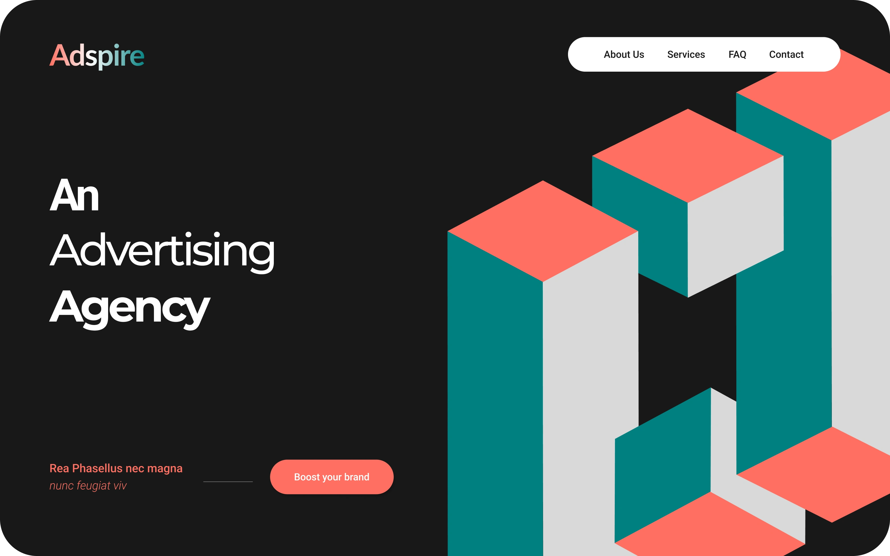The 3D cube design provides a fresh, interactive experience. It's visually striking, using dynamic cubes to highlight Adspire services, team and process. This approach creates a memorable impression and showcases the agency's innovative approach to advertising.