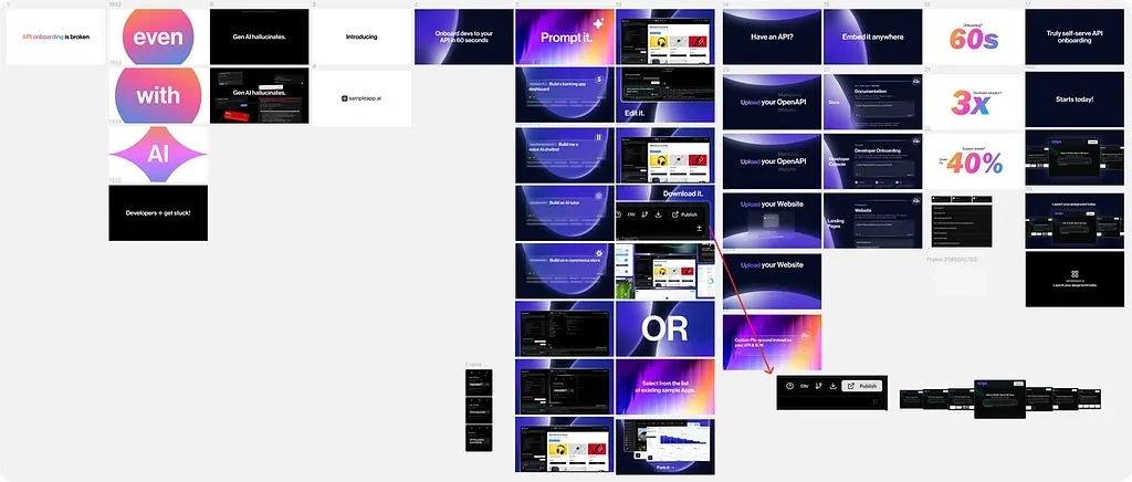 They came with a final script already prepared. The task was to design a storyboard in Figma based on their creative direction, then animate the full piece. The video walks through the problem (how current AI tools fail at API onboarding), the solution Sampleapp.AI provides, and the business impact it delivers.