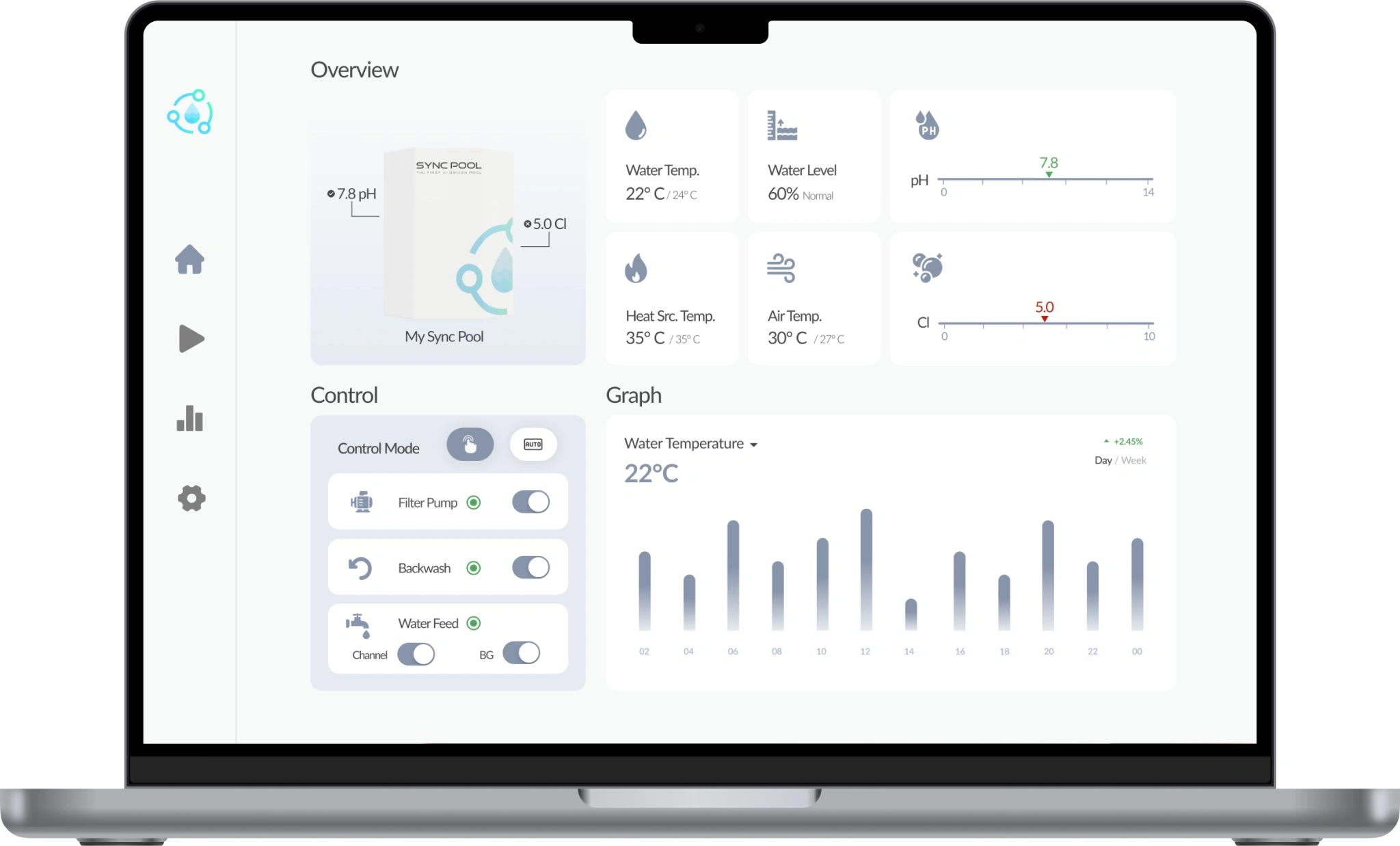 The design focuses on providing users with the tools to monitor and adjust key metrics like pH levels and chlorine conveniently from their mobile devices.