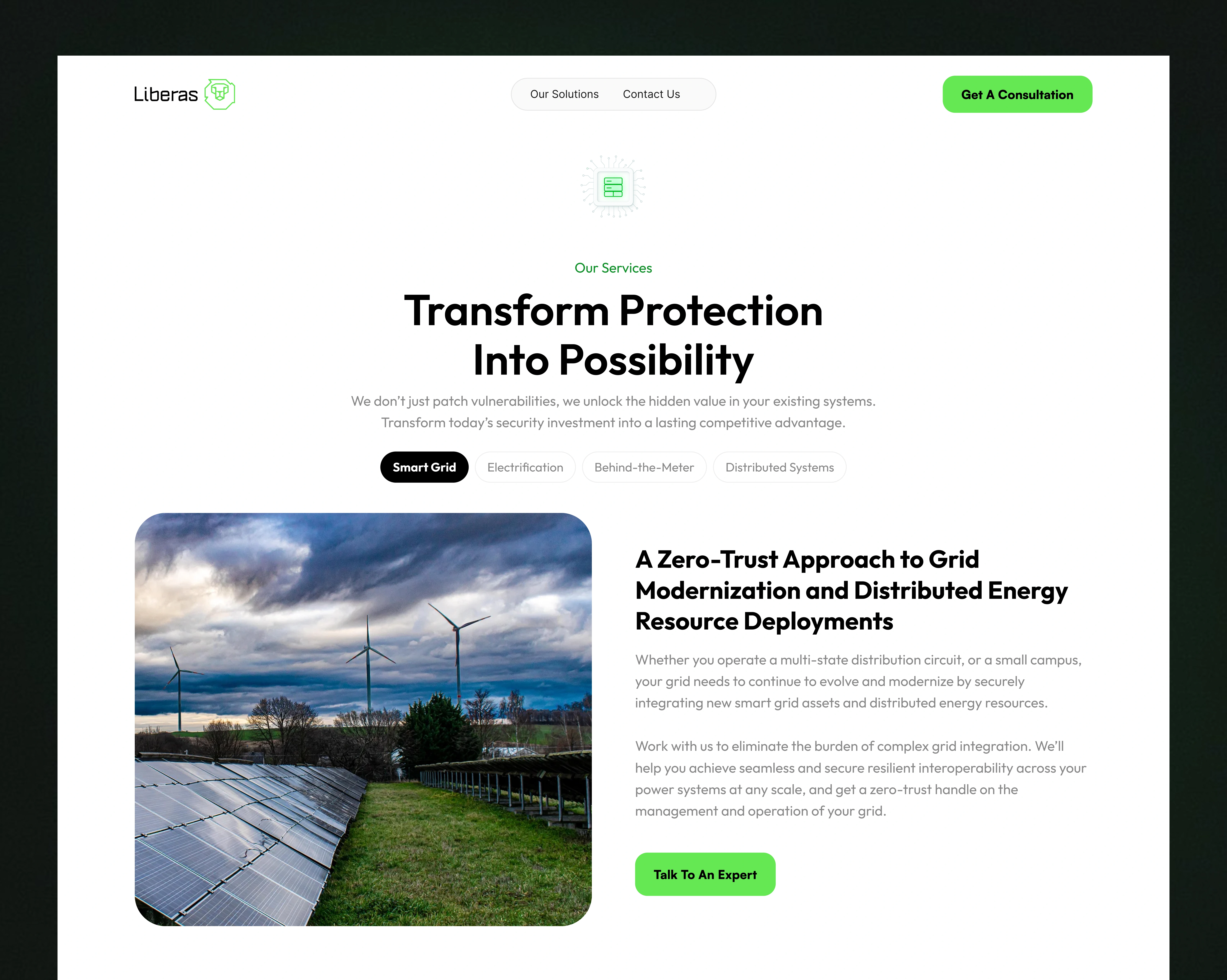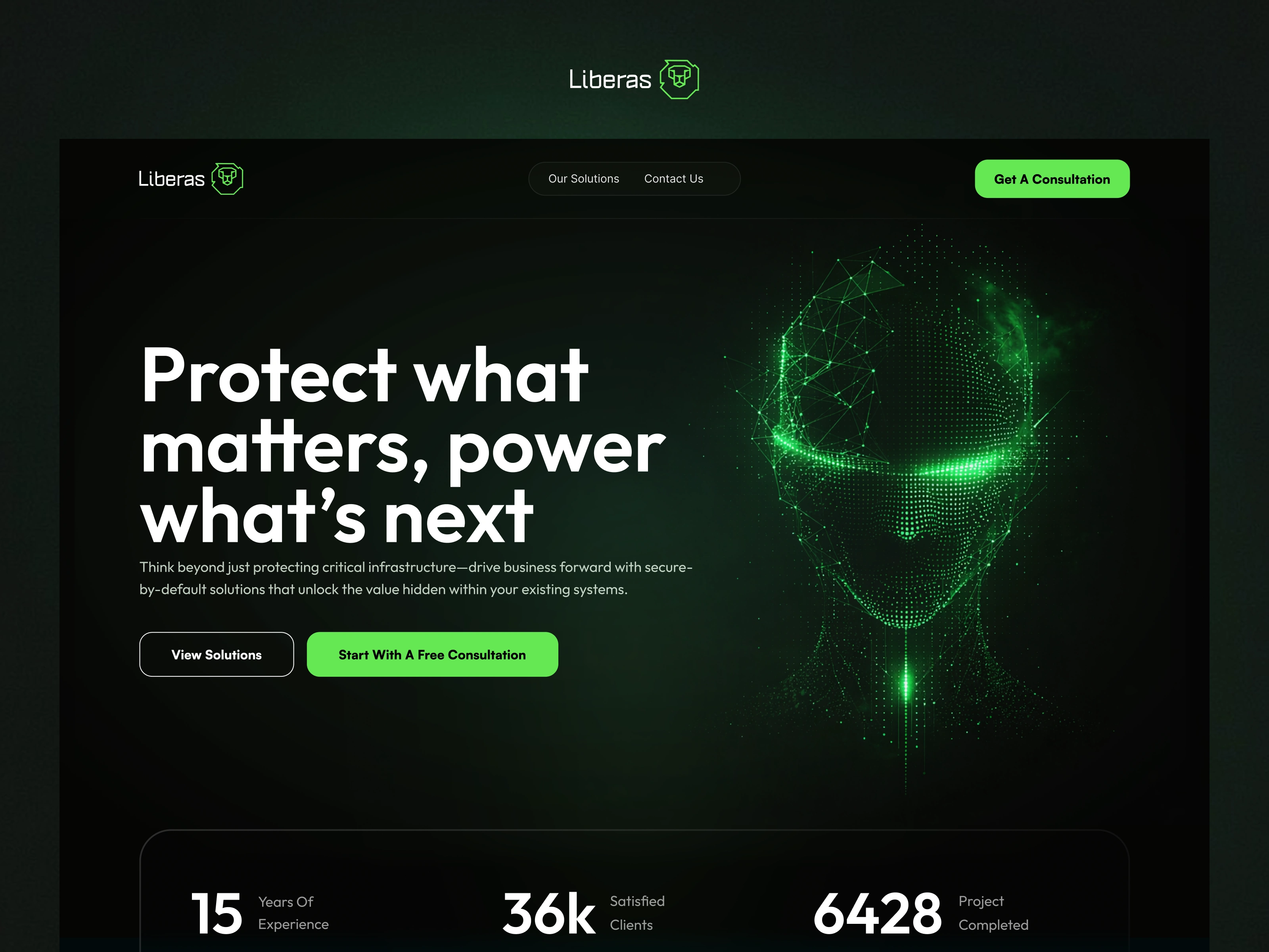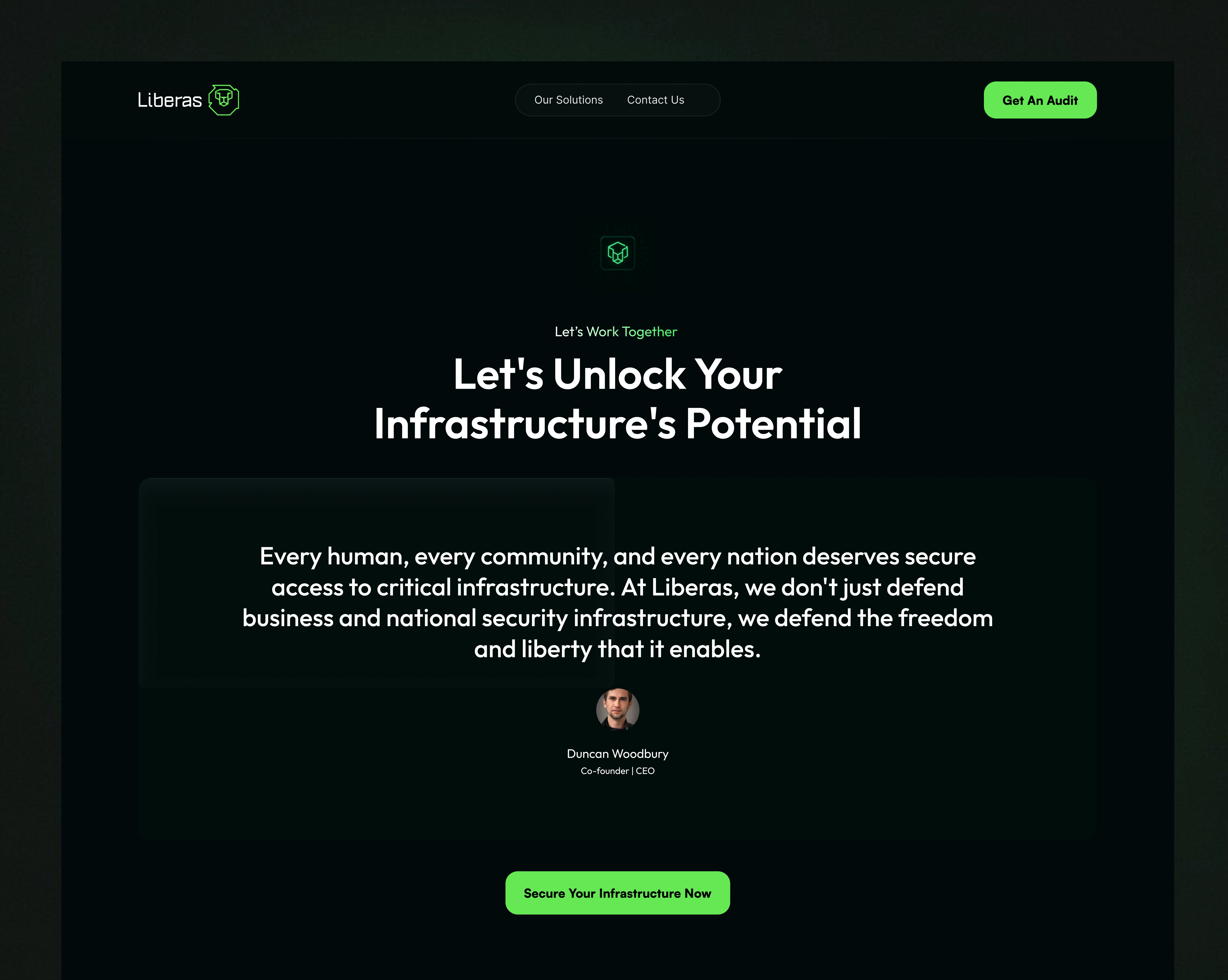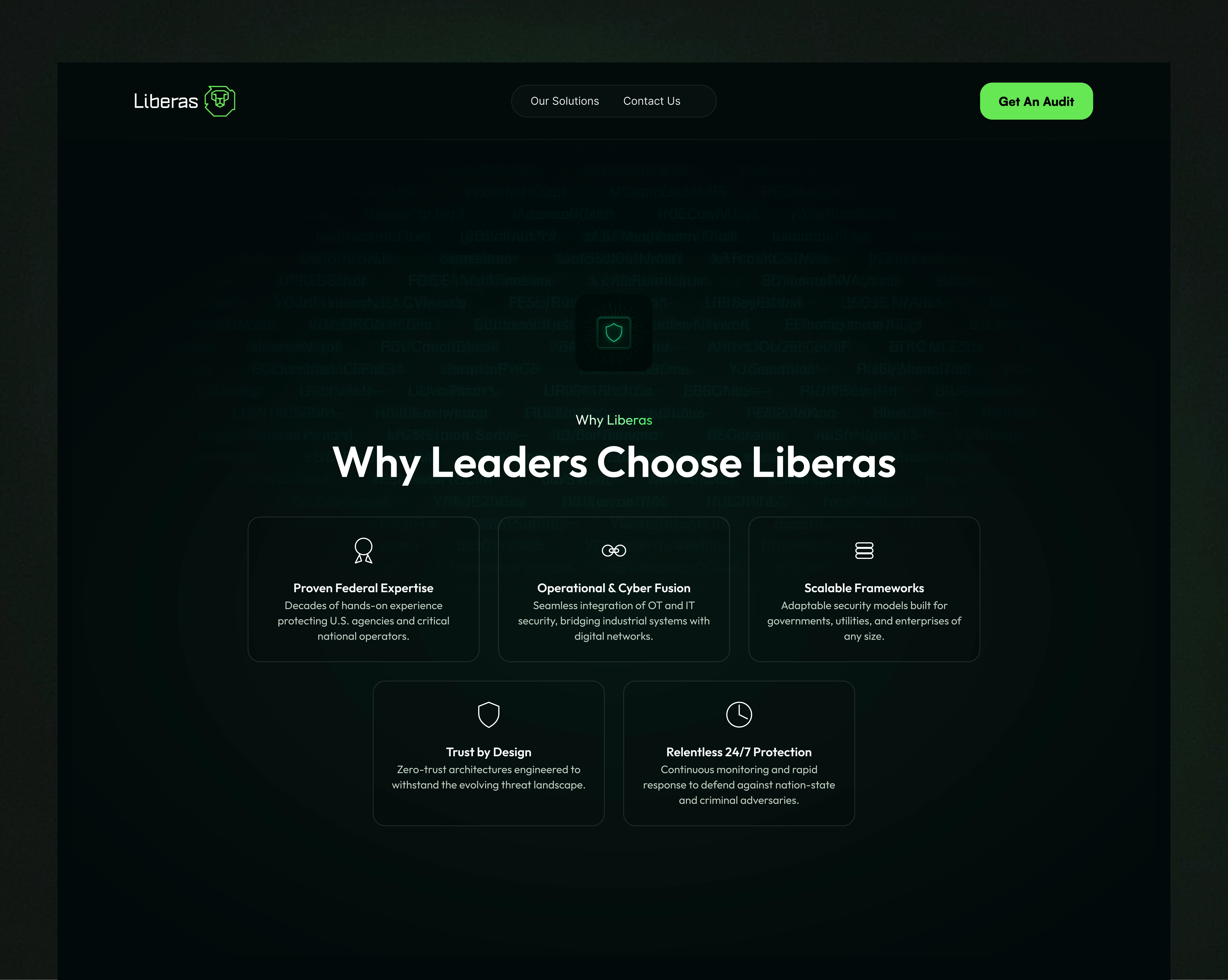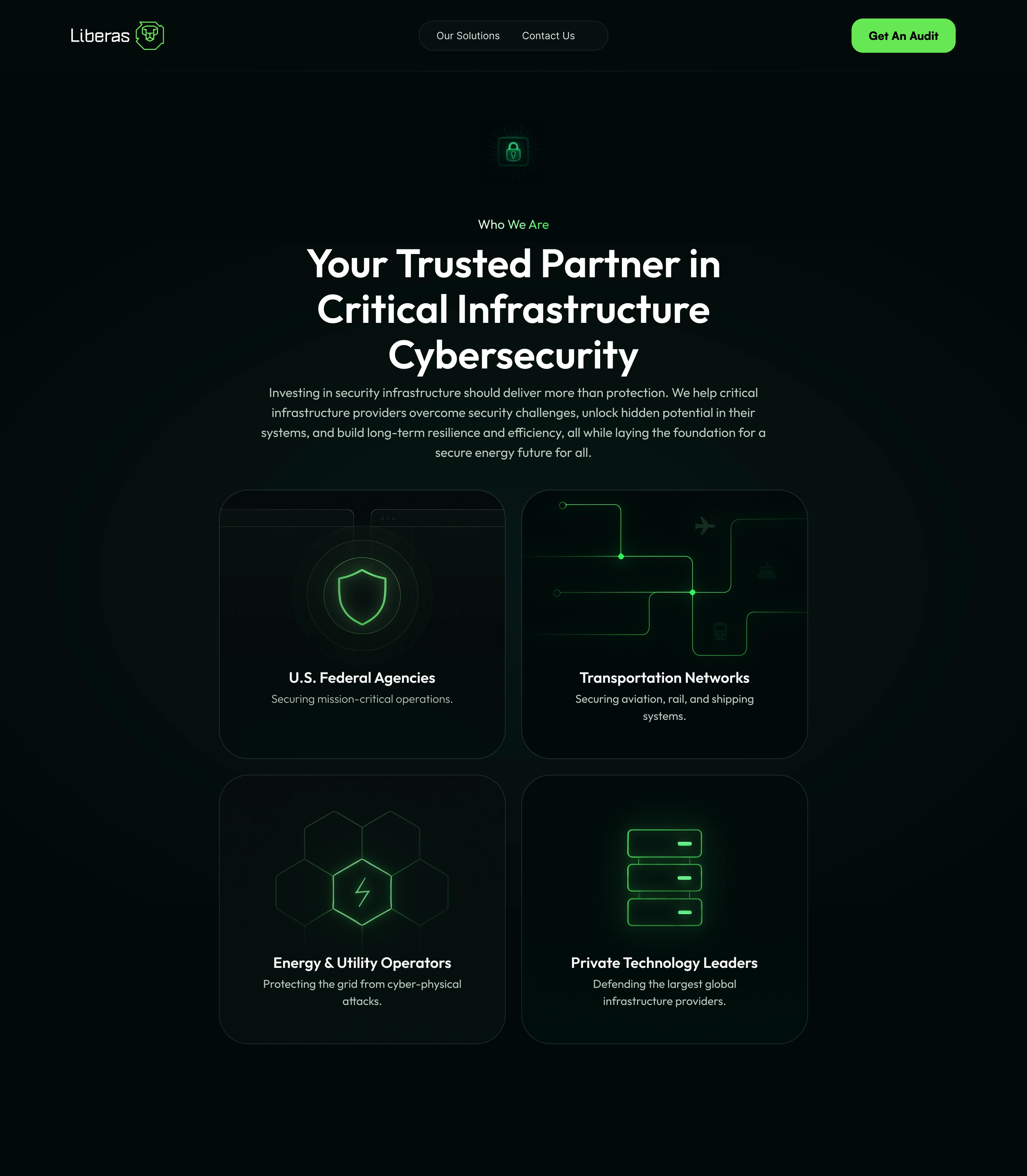 The goal was to build a secure, professional, and high-performance digital presence that reflects Liberas's expertise in hardware-based security, penetration testing, and critical infrastructure defense. The design needed to balance authoritative, security-first aesthetics with a user-friendly experience for potential clients looking to book consultations.