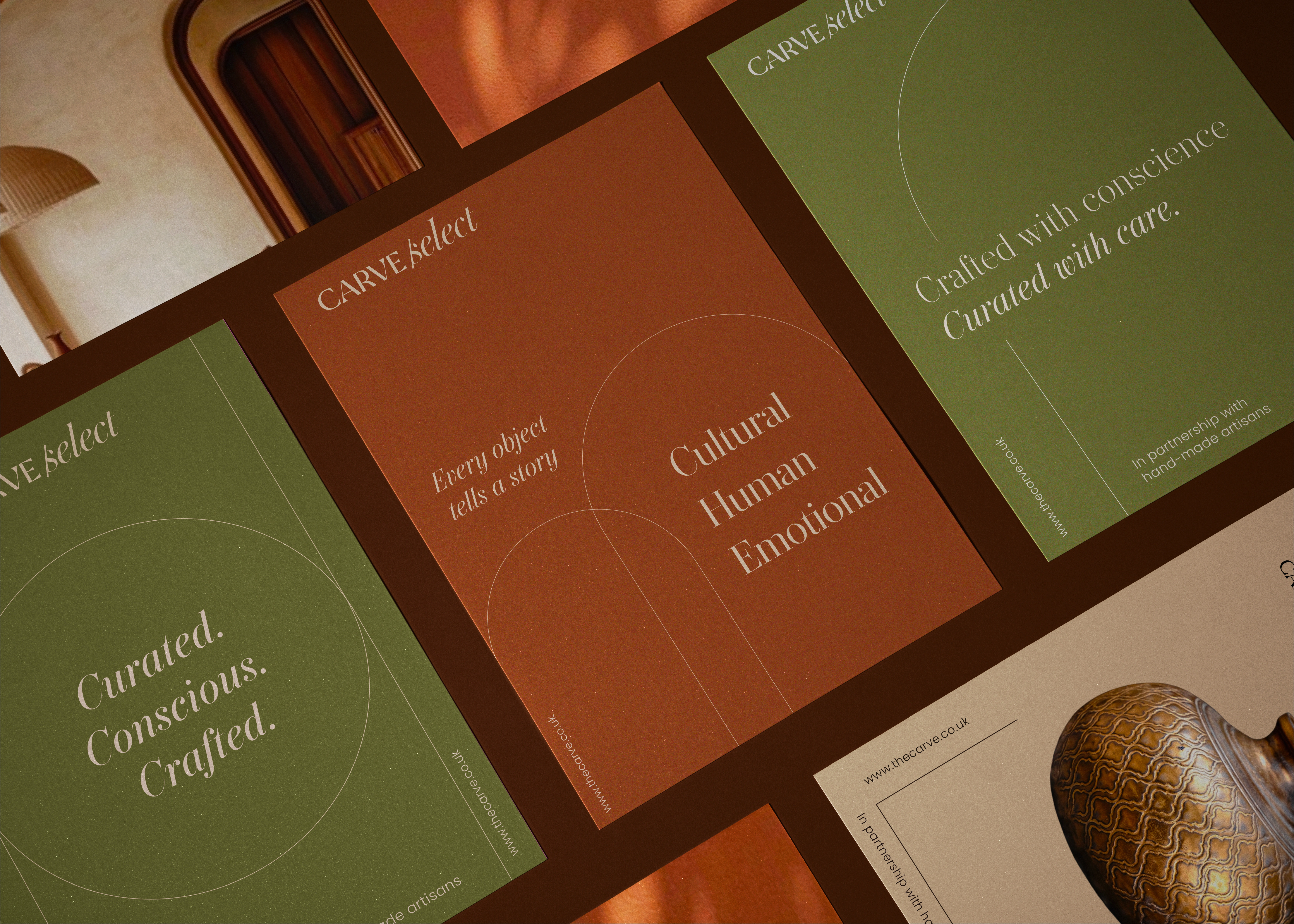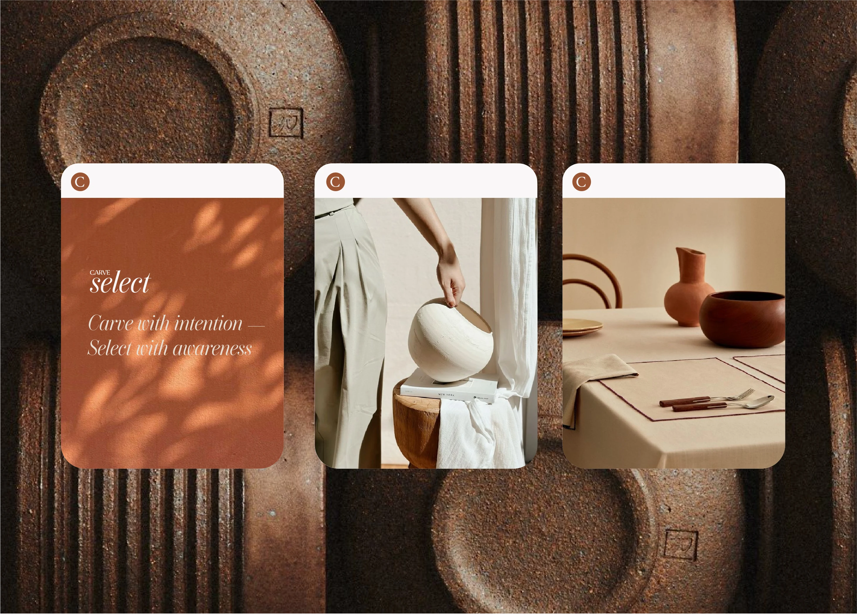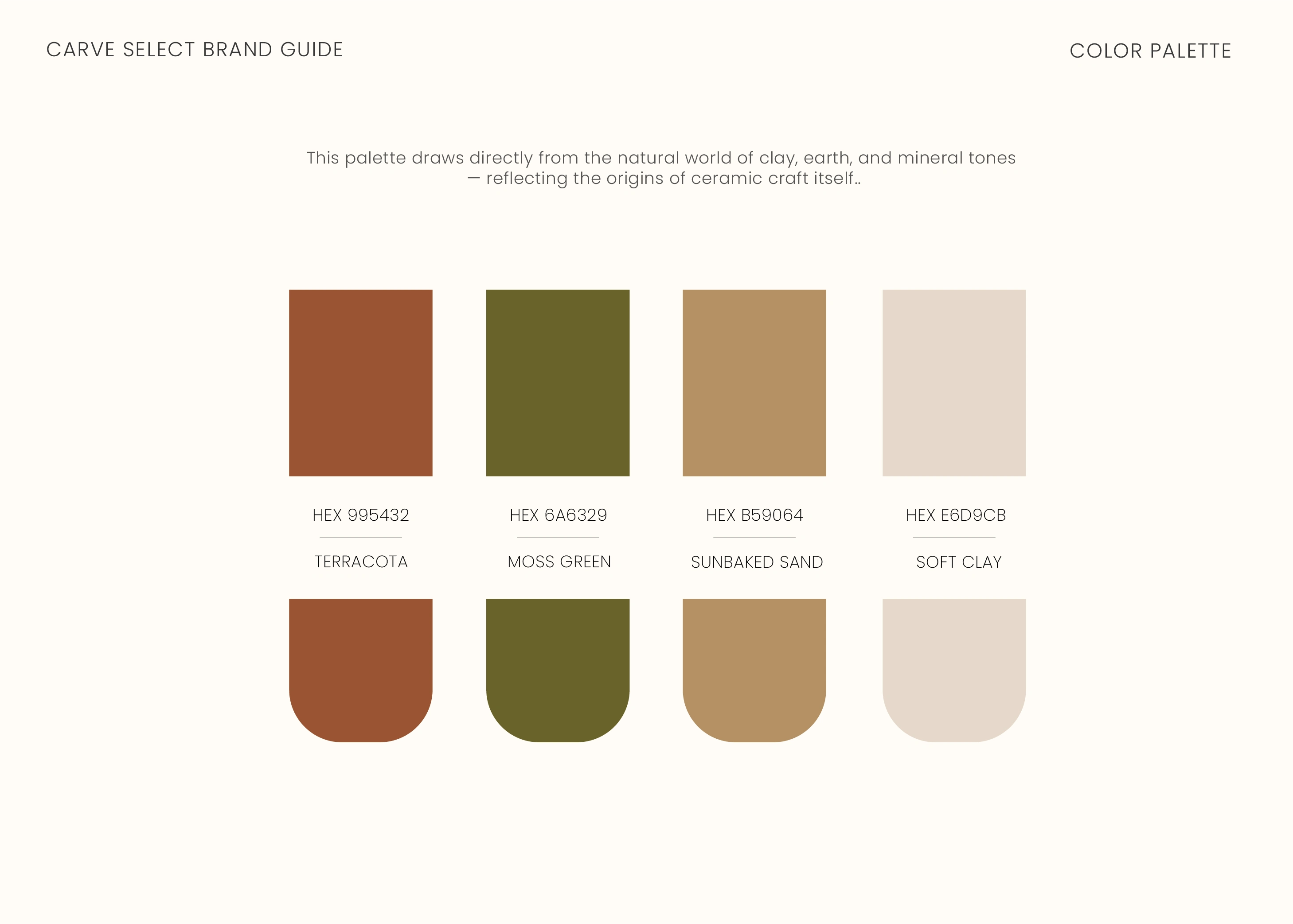 The starting point was the material itself — clay, earth, texture, and the making process. The colour palette was drawn directly from the natural world of ceramic craft: terracotta, moss green, sunbaked sand, and soft clay. These weren't aesthetic choices made at a distance — they were chosen because they are the colours of the thing Carve Select curates.