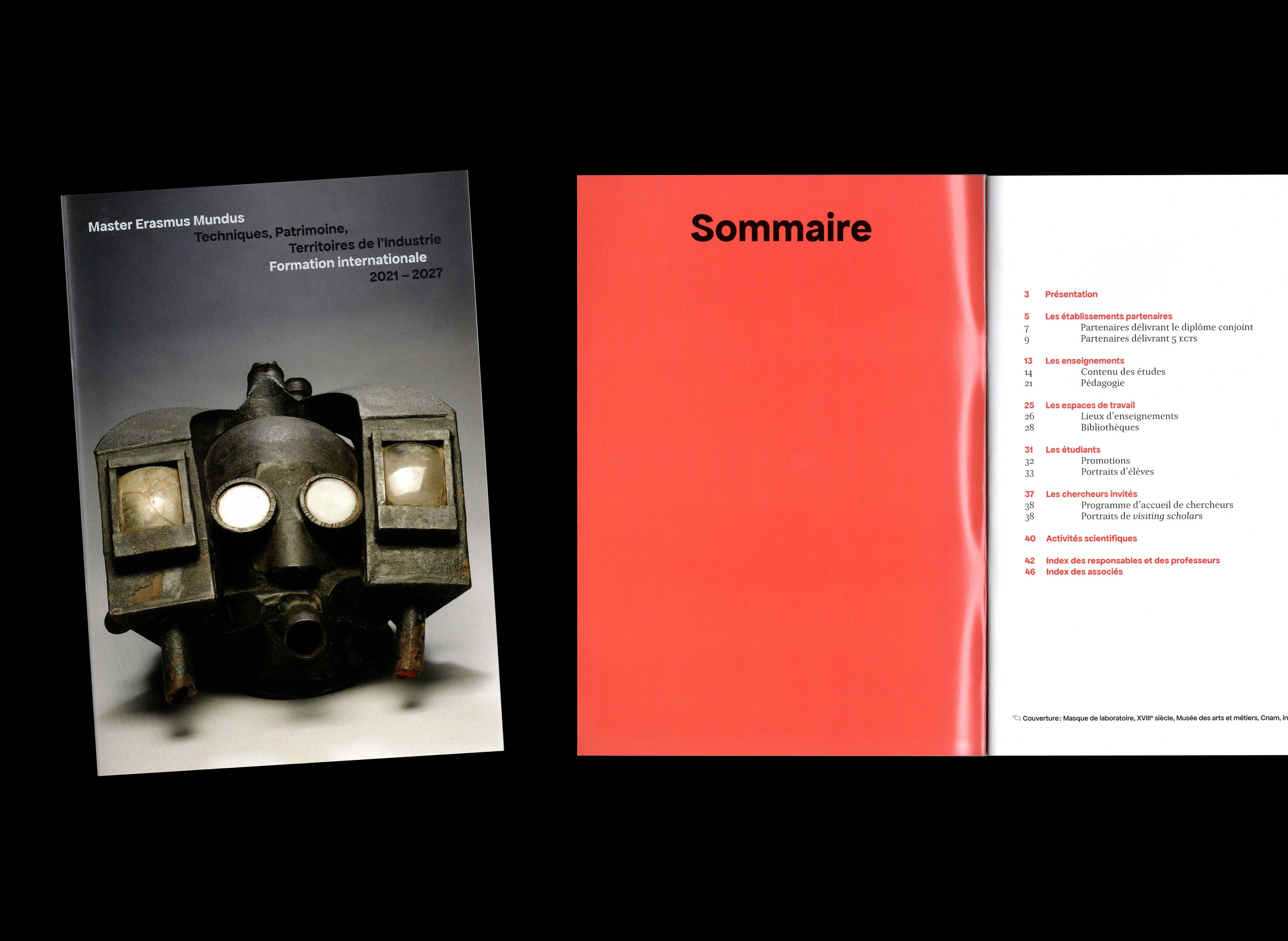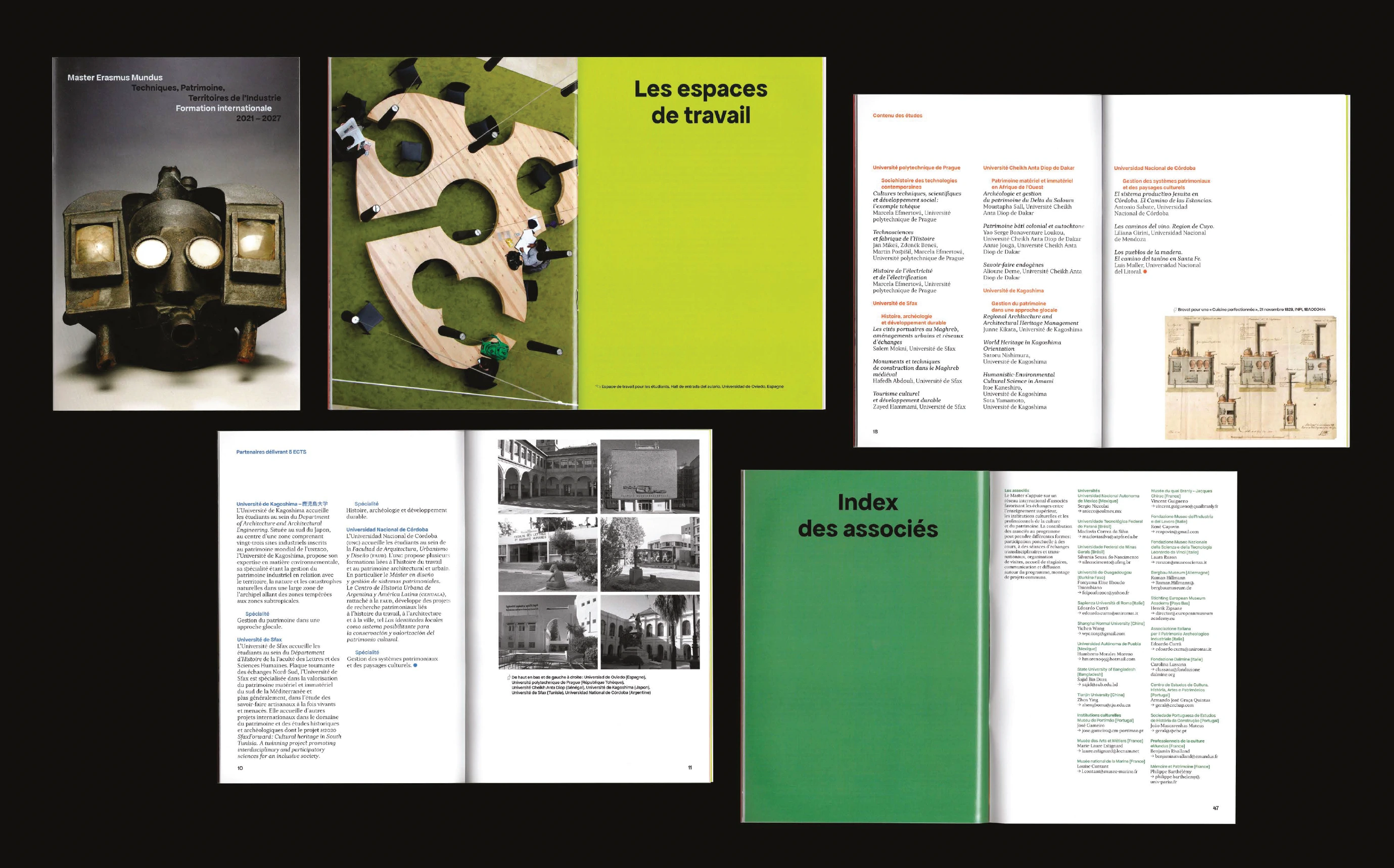 Layout of the brochure presenting the Erasmus Mundus Master's program in Techniques, Heritage, and Industrial Territories at Panthéon-Sorbonne University.