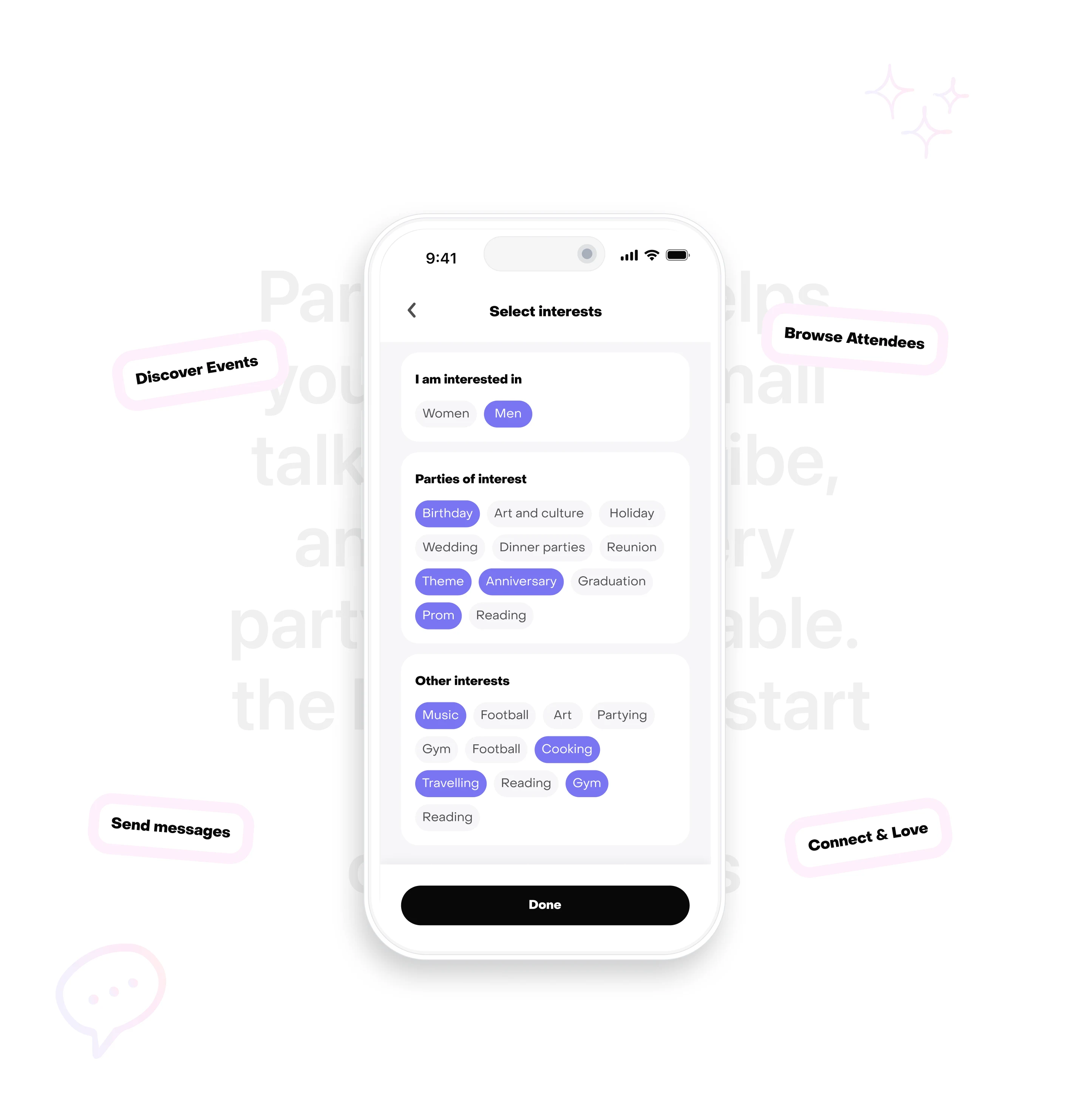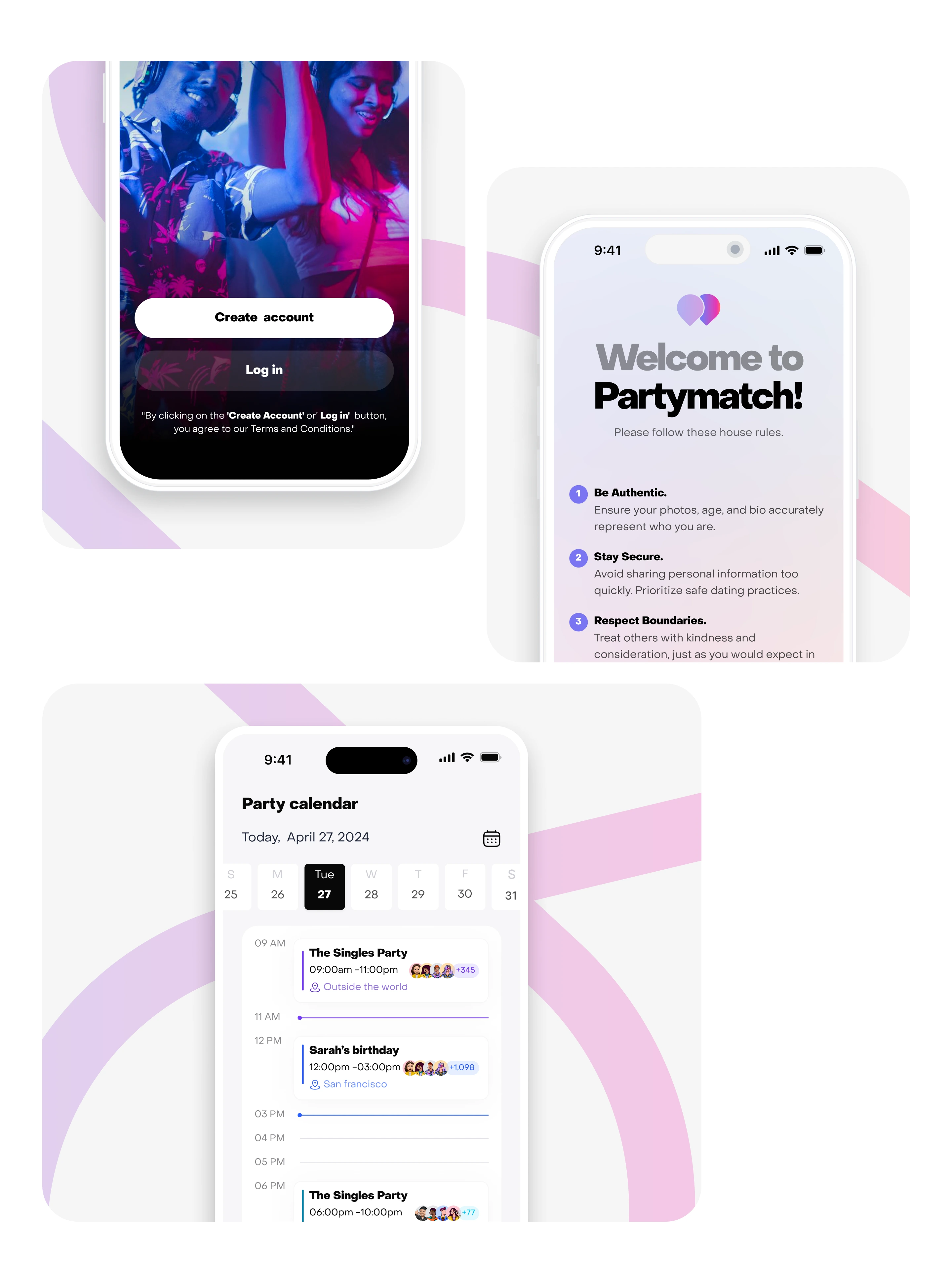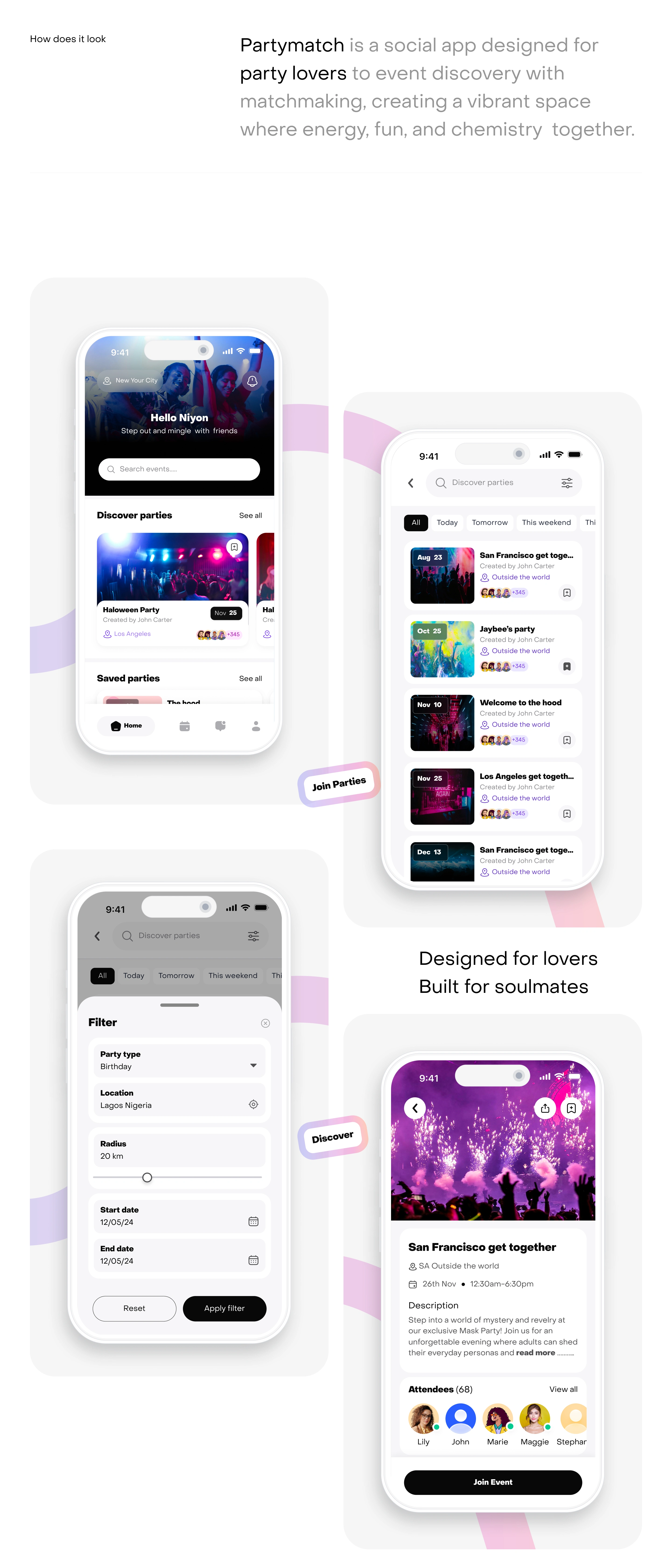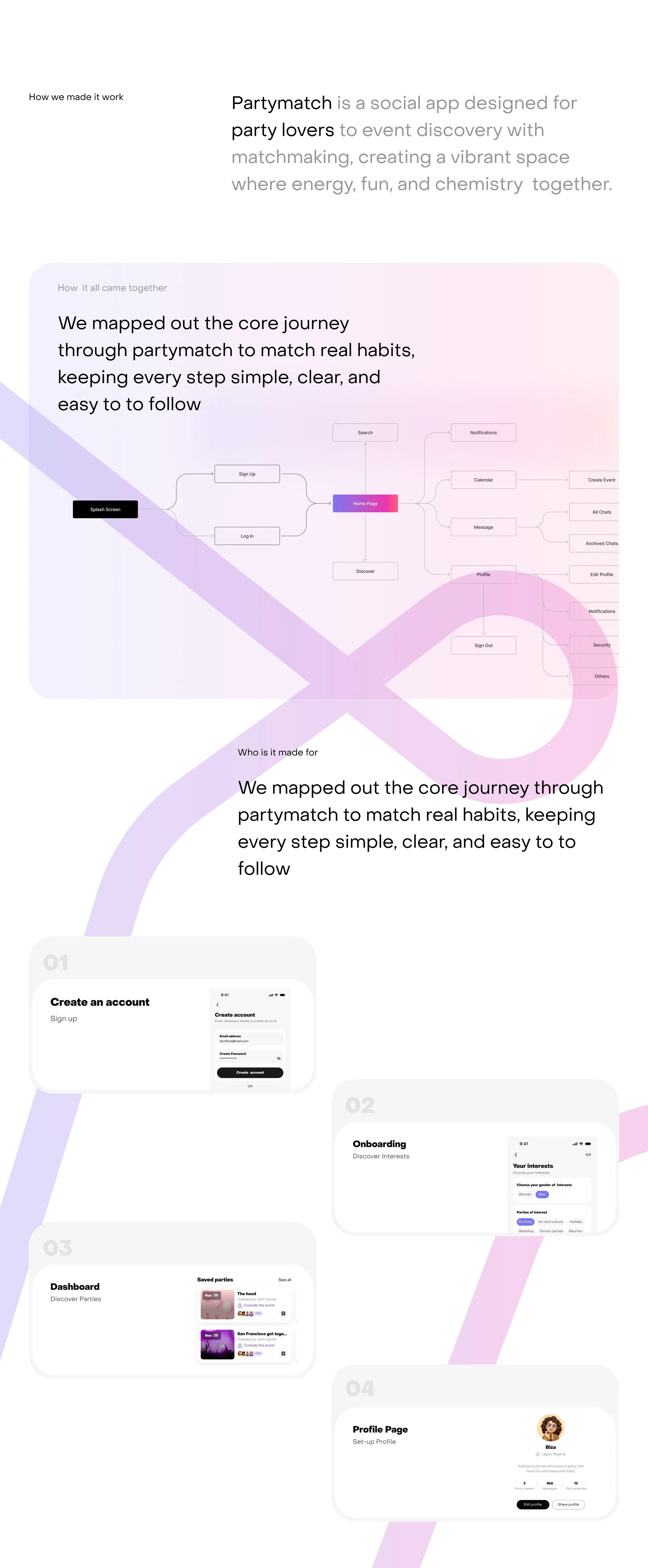 I designed the UI/UX for Partymatch, a social app that helps party lovers meet, connect, and find love through shared events.