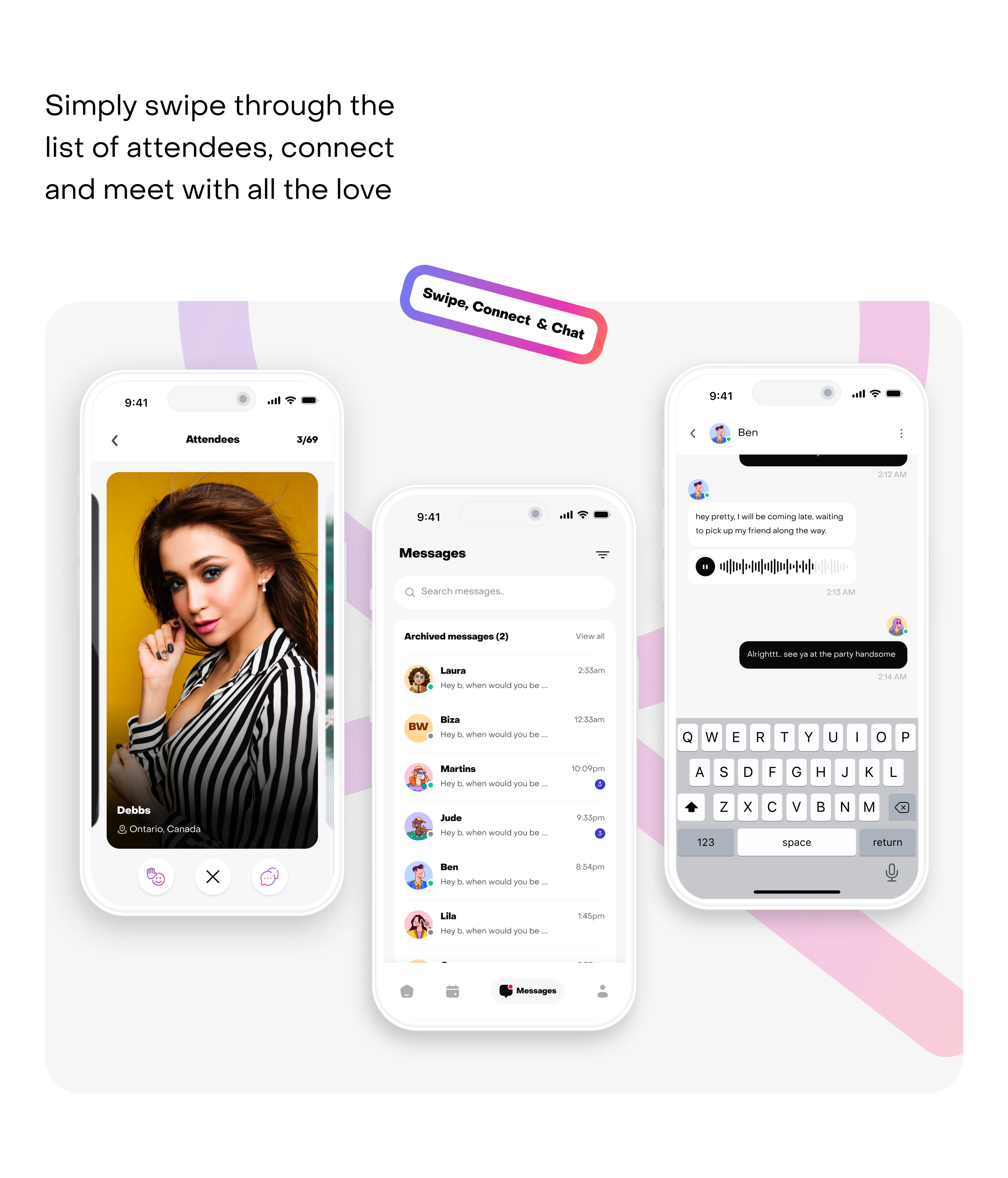 The interface emphasizes usability, engagement, and seamless navigation, ensuring users can explore events, connect with matches, and enjoy the platform effortlessly.