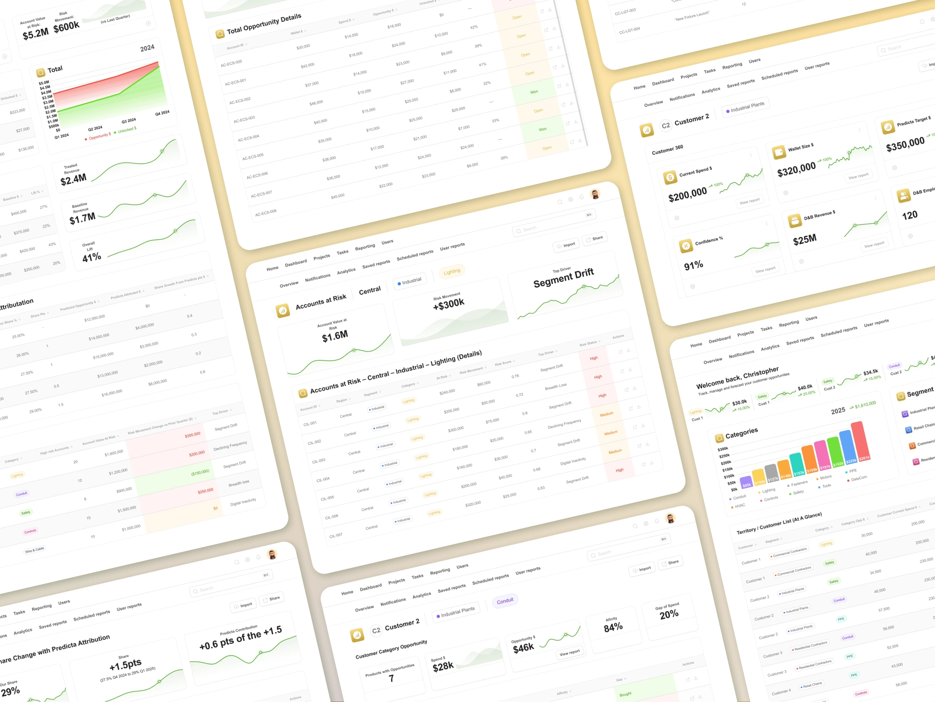 Created high-fidelity, clickable prototypes tailored to 3 views: Executive, Sales Rep, and Marketing in the B2B dist. space to share with senior stakeholders.