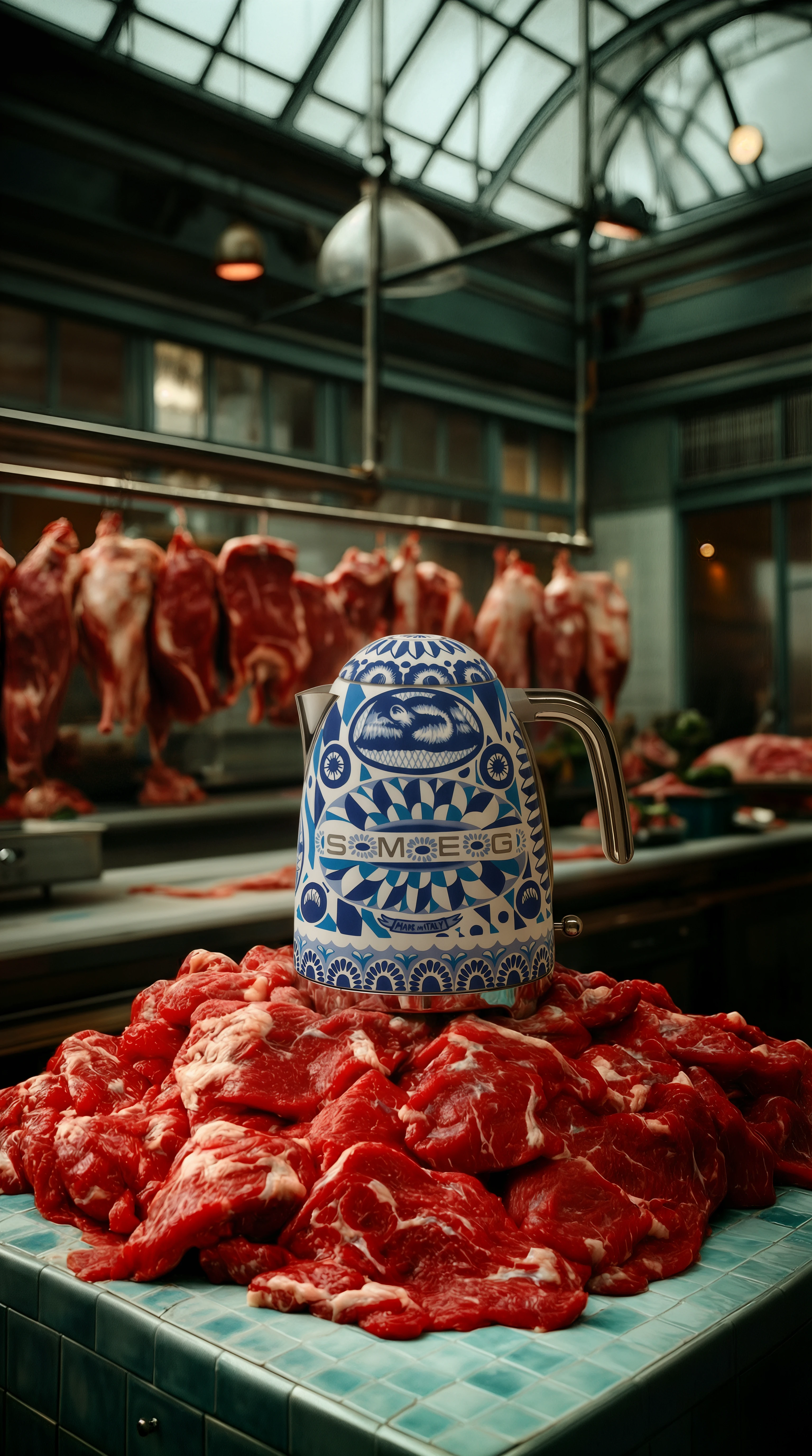 An iconic SMEG × Dolce & Gabbana kettle, featuring hand-painted Mediterranean motifs inspired by Sicilian ceramics, is placed inside a butcher’s workspace — surrounded by raw meat, cold tiles, and harsh industrial lighting.