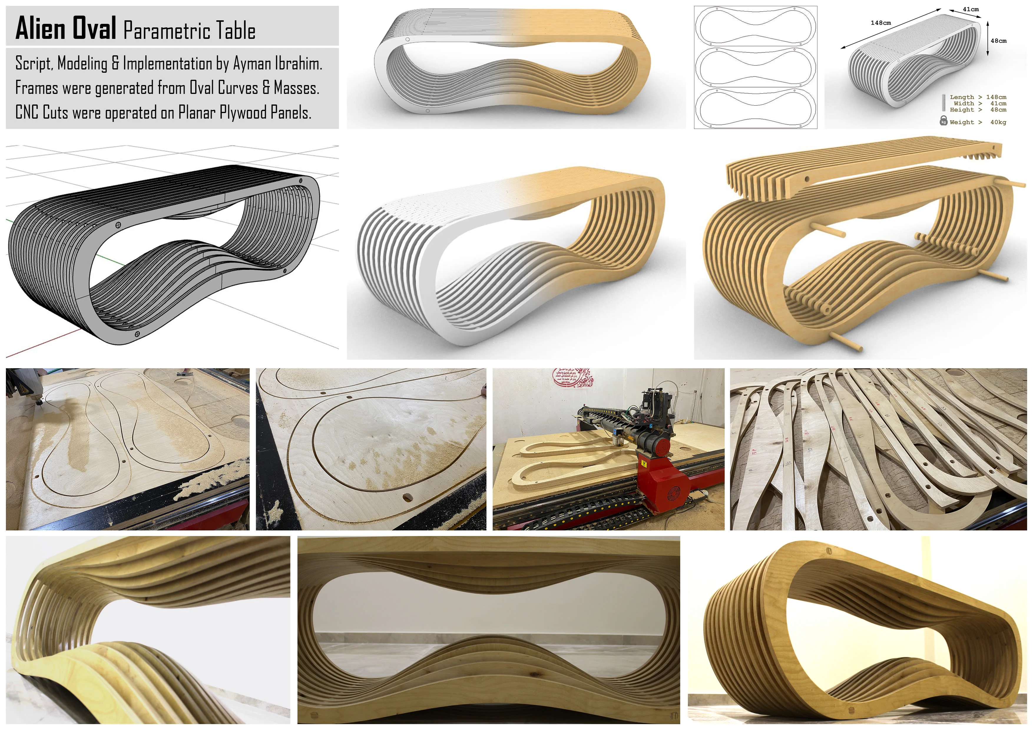 The Oval Parametric Table Frames were generated from Oval Curves & Masses. CNC Cuts were operated on Planar Plywood Panels.