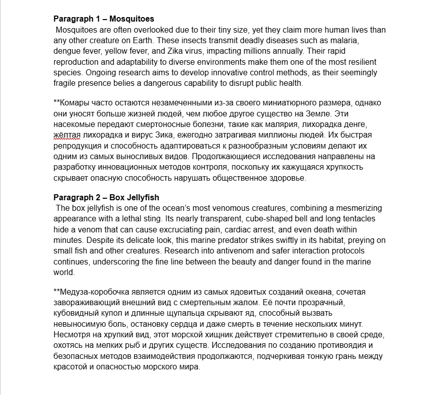 Delivered a dual-language translation of a "Top 10 Most Dangerous Animals" article, showcasing precise and culturally aware localization skills.