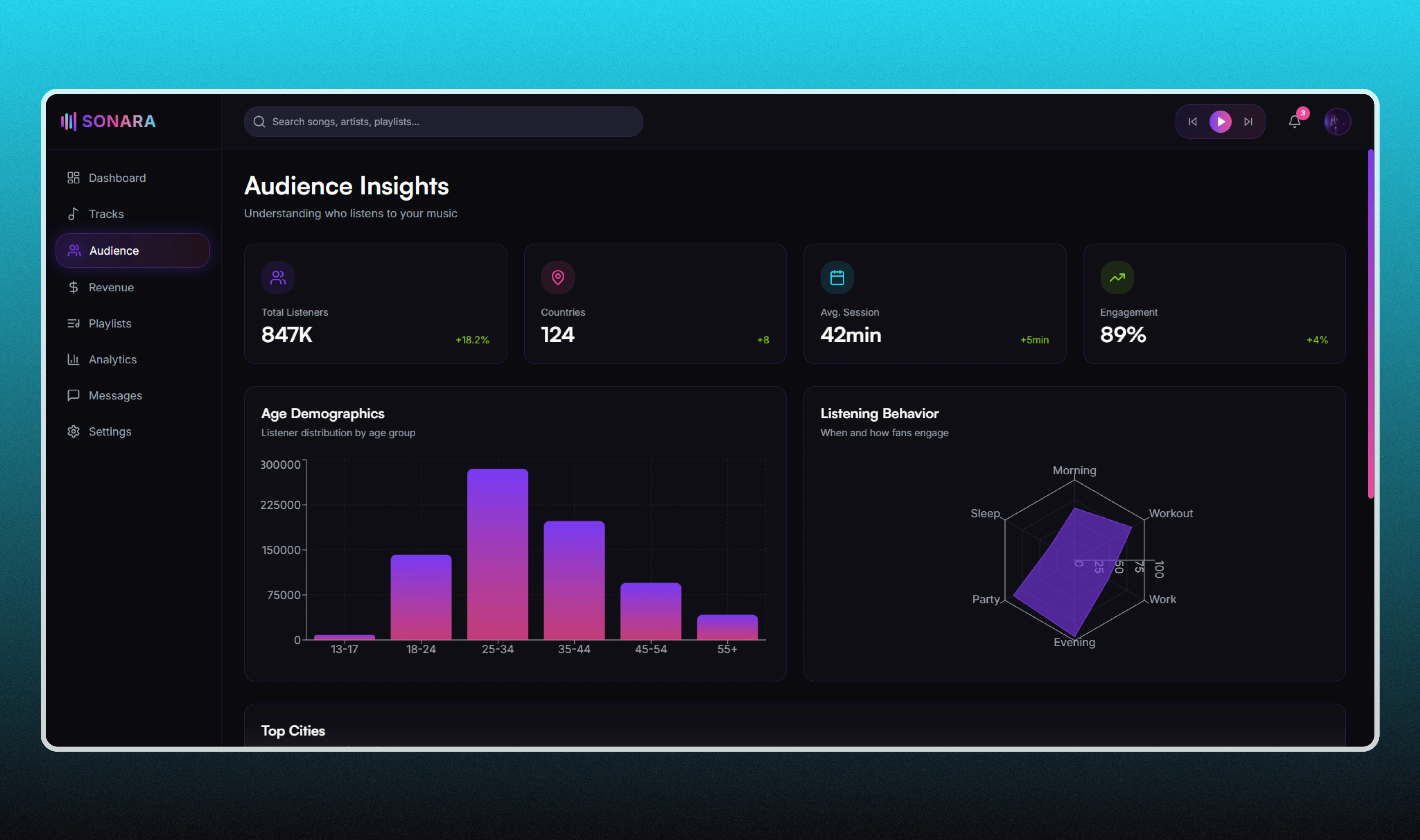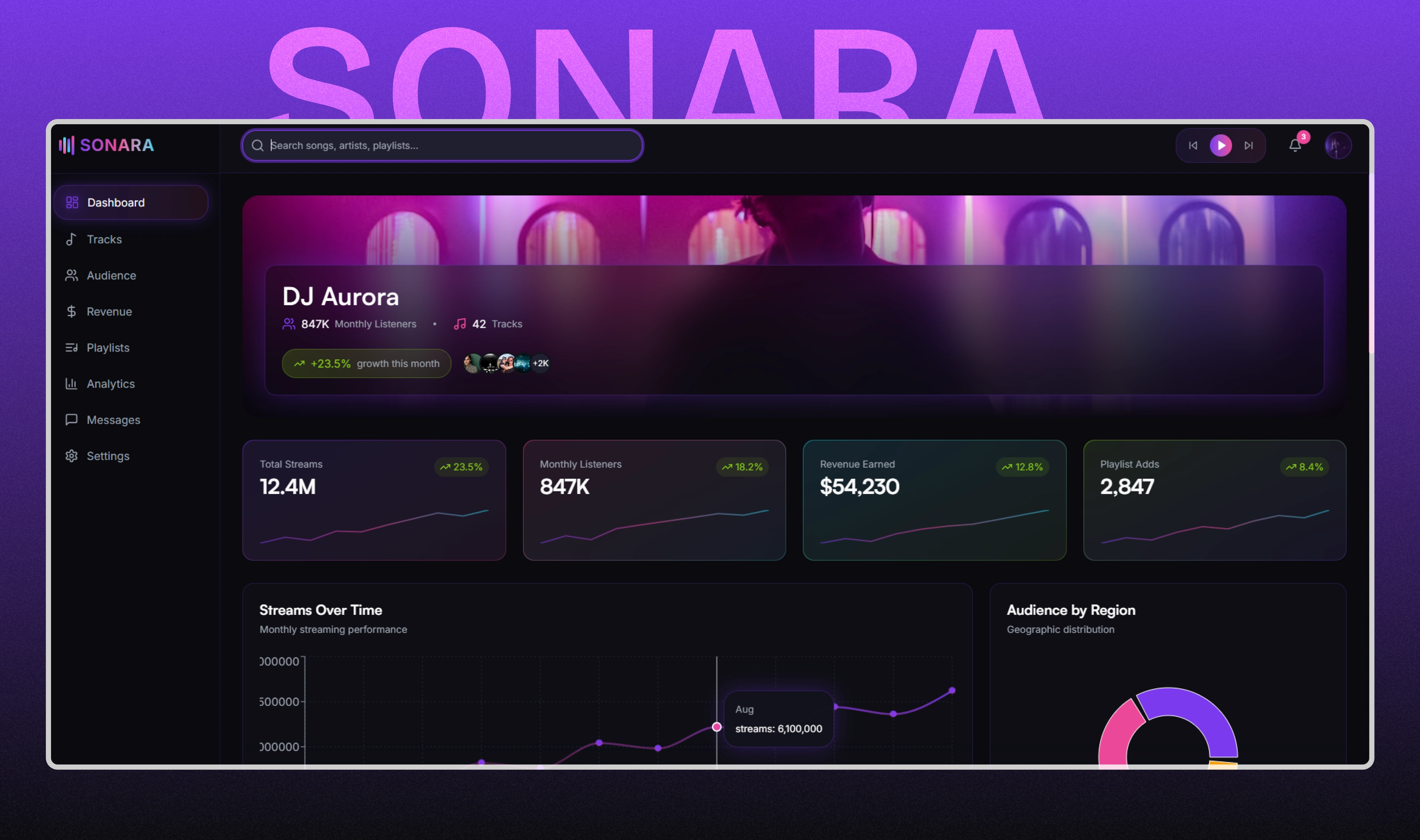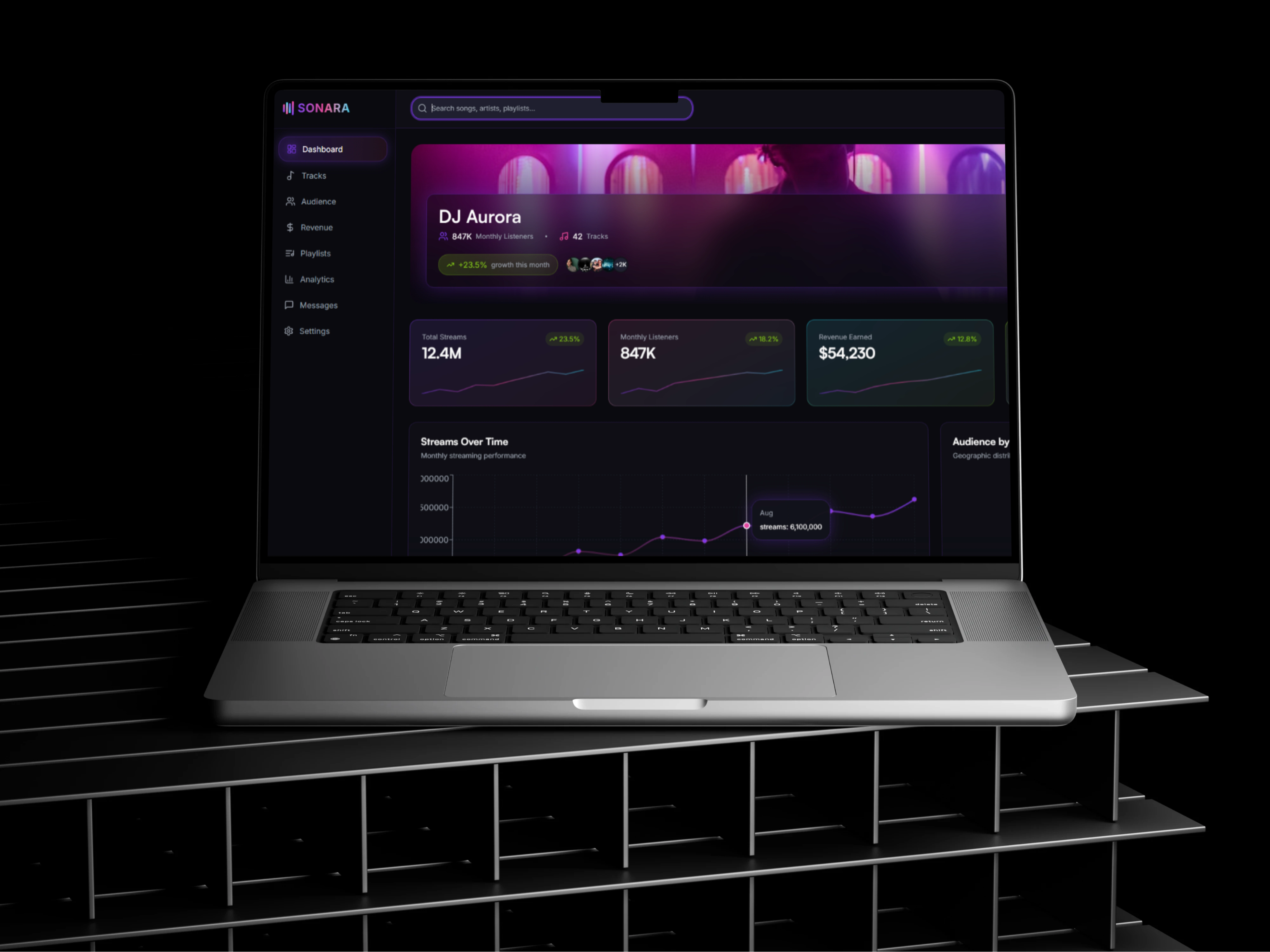 We designed a futuristic, data-driven dashboard that balances strong visual aesthetics with usability. Our role included UX planning, information architecture, visual direction, and interaction design—ensuring artists and teams can quickly access insights, monitor growth, and make data-driven decisions.