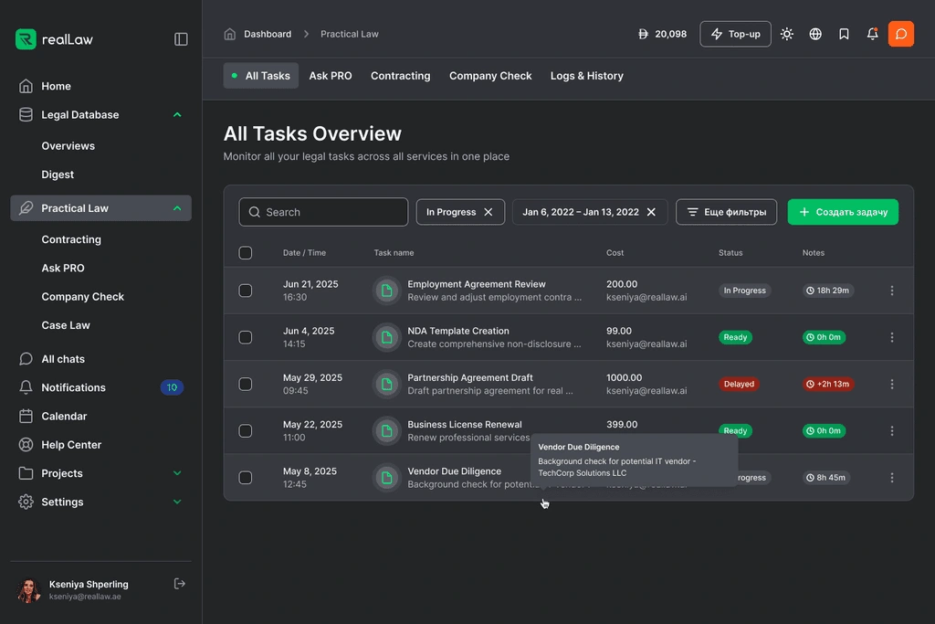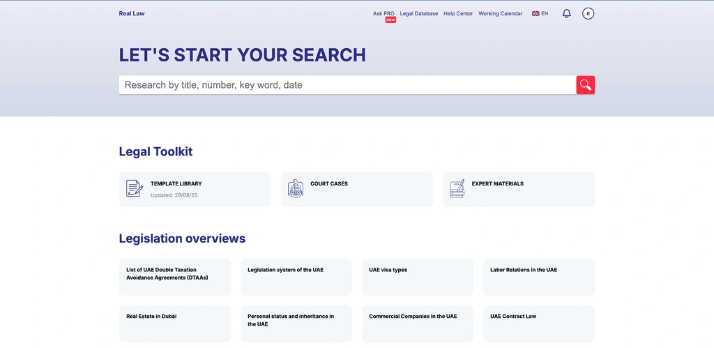 realLaw is a legal-tech SaaS platform designed to make UAE legislation accessible and practical for businesses, lawyers, accountants, and entrepreneurs. The platform combines AI-driven insights with official legal sources and expert consultation.