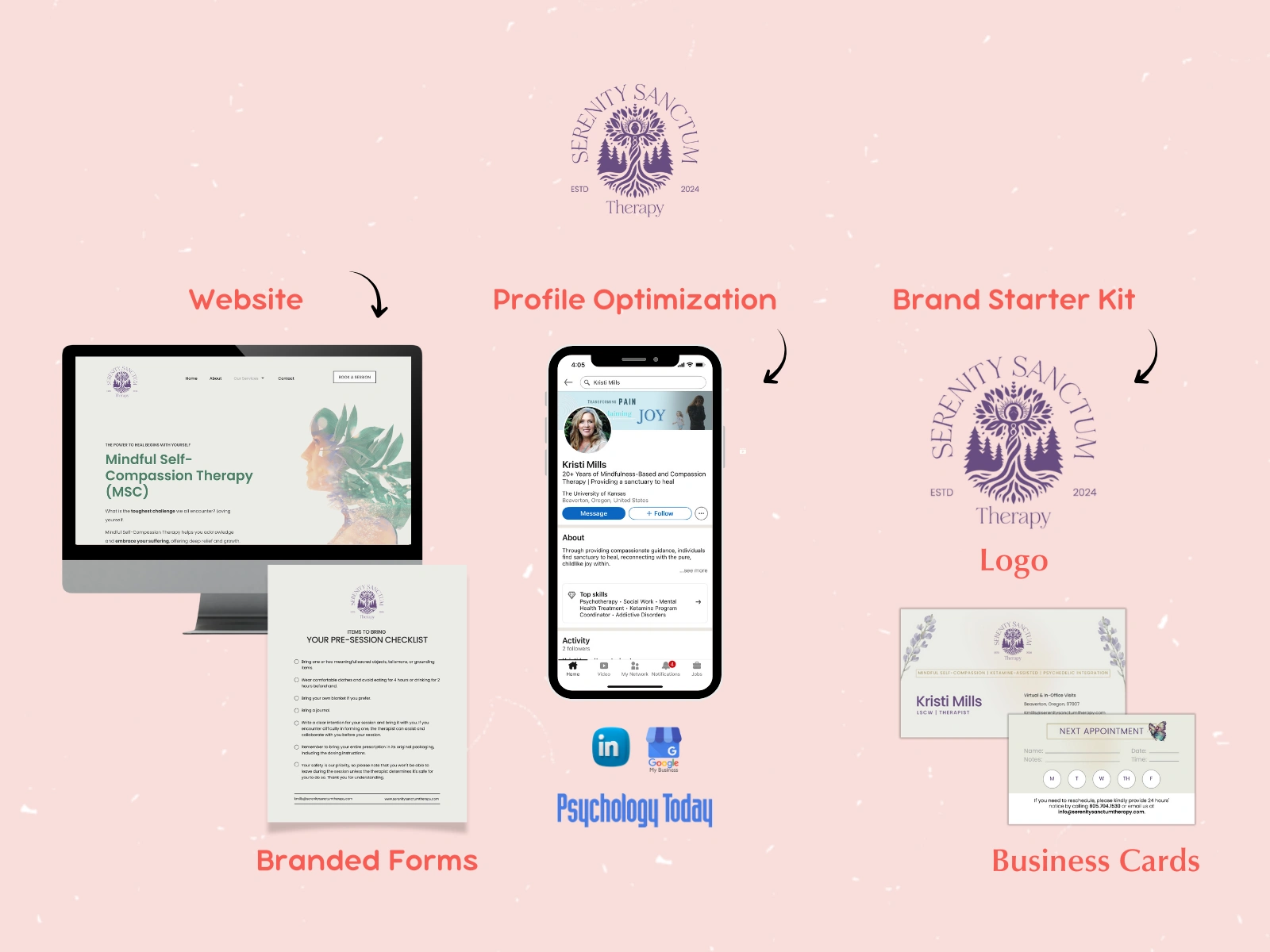 Serenity Sanctum Therapy was a brand-new practice launched by a therapist with no business infrastructure and only a vision. The client didn’t know what to name her practice or where to start. I handled everything from filing the LLC and business license to designing a 7 page website and branded materials like business cards, a logo, and patient intake forms. By setting up her social media, LinkedIn, Psychology Today, and Google Business accounts, I created a strong online presence and brought her dream practice to life. Within just two weeks of launch, the client received 14 inquiries from potential patients.