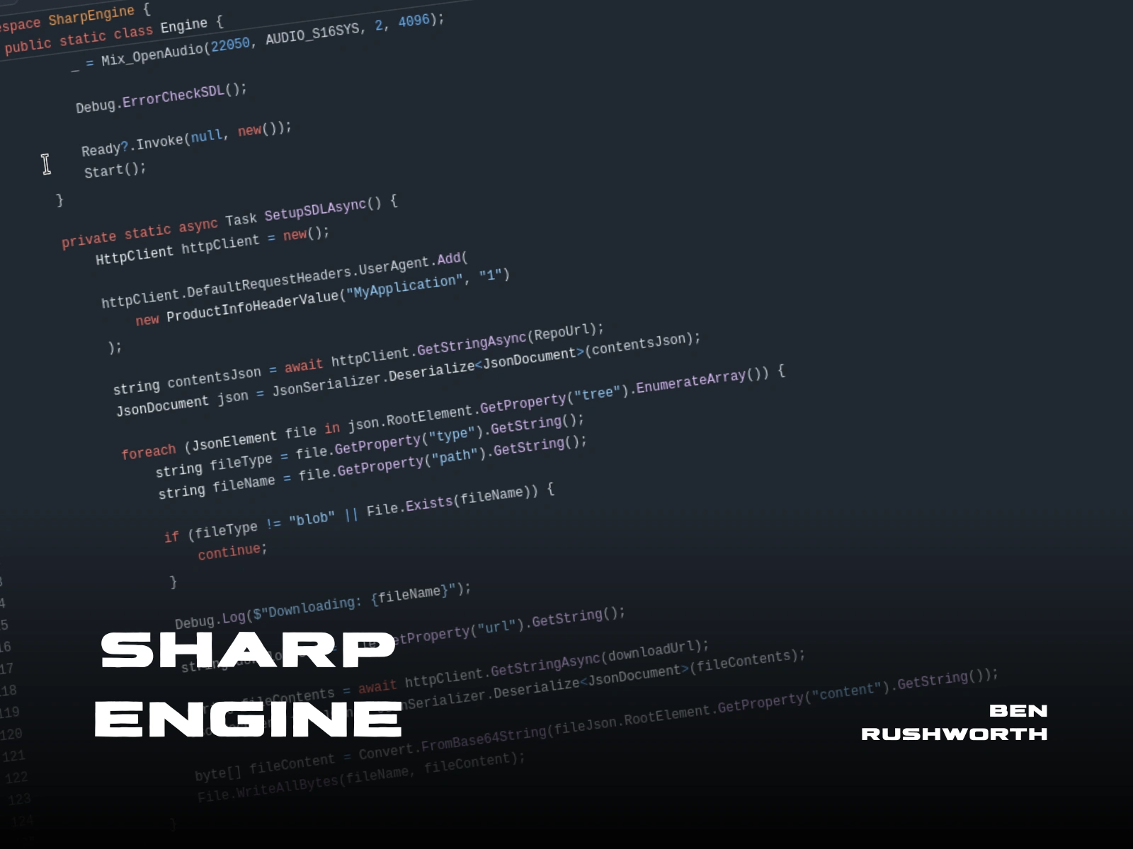 Sharp Engine is a 2D game engine written in C# using SDL2. I wrote this a few years ago as a passion project, entirely independently. The engine has features such as: texture rendering, primitive shape rendering, playing audio, reading input, tile maps, and a built in UI system. I show this project off to anyone who will listen as I was really proud of this.