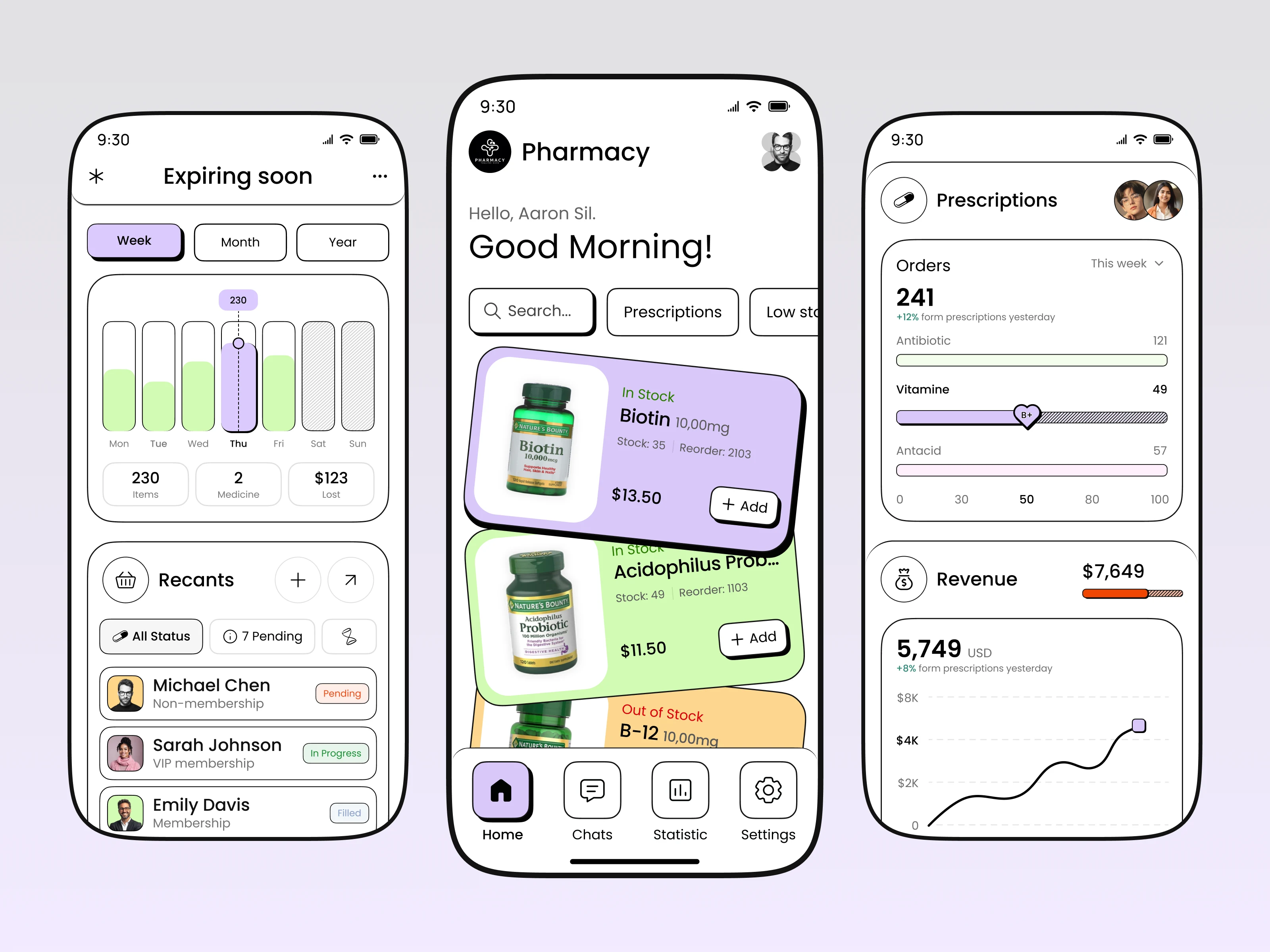 This concept focuses on helping pharmacies monitor medicine expiry dates, manage low-stock alerts, track prescriptions, and analyze weekly revenue performance through a clean and intuitive dashboard. The interface uses a minimal, card-based layout with soft colors to ensure clarity, accessibility, and ease of use for pharmacists and healthcare staff.