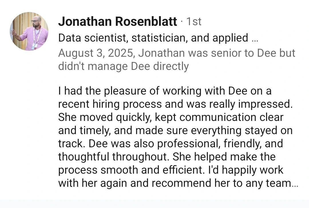 Hired the roles for Jonathan's team in Israel, managed the time difference, culture differences and overcame the language barrier.