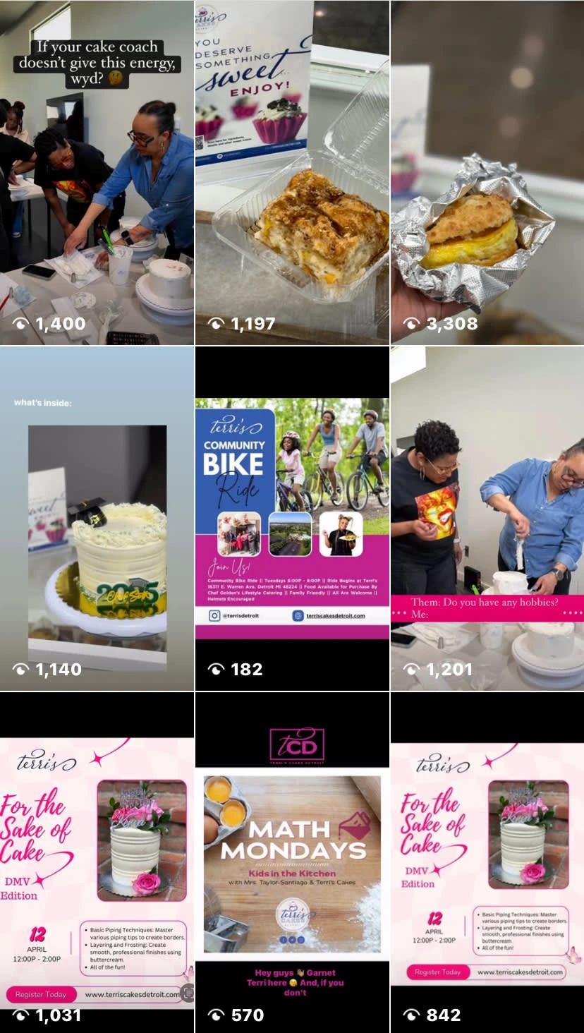 Managed content strategy + creation for a bakery and event brand. Achieved 3K+ views on multiple posts, created visuals, and helped grow reach by over 800%.