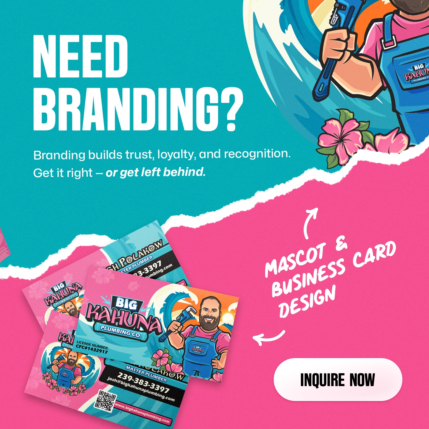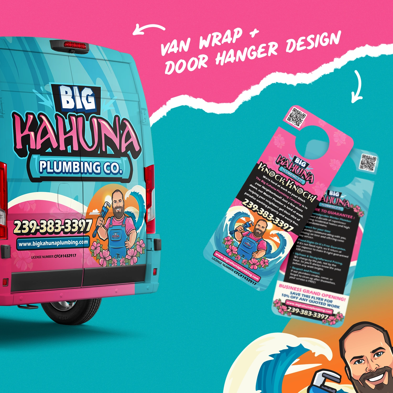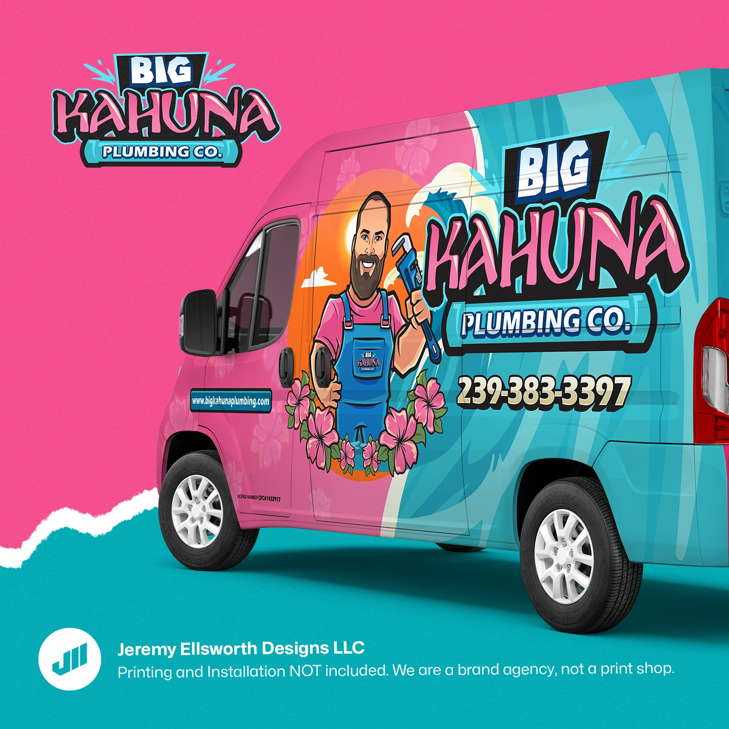 Big Kahuna Plumbing Co. — where branding meets island energy. From their bold mascot design to full vehicle wrap, we brought this brand to life with tropical personality, vibrant colors, and a memorable visual punch that makes every drive a statement.