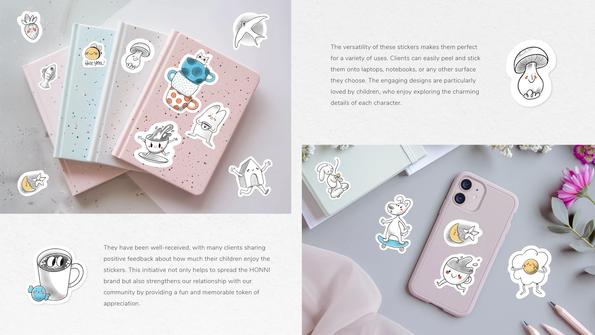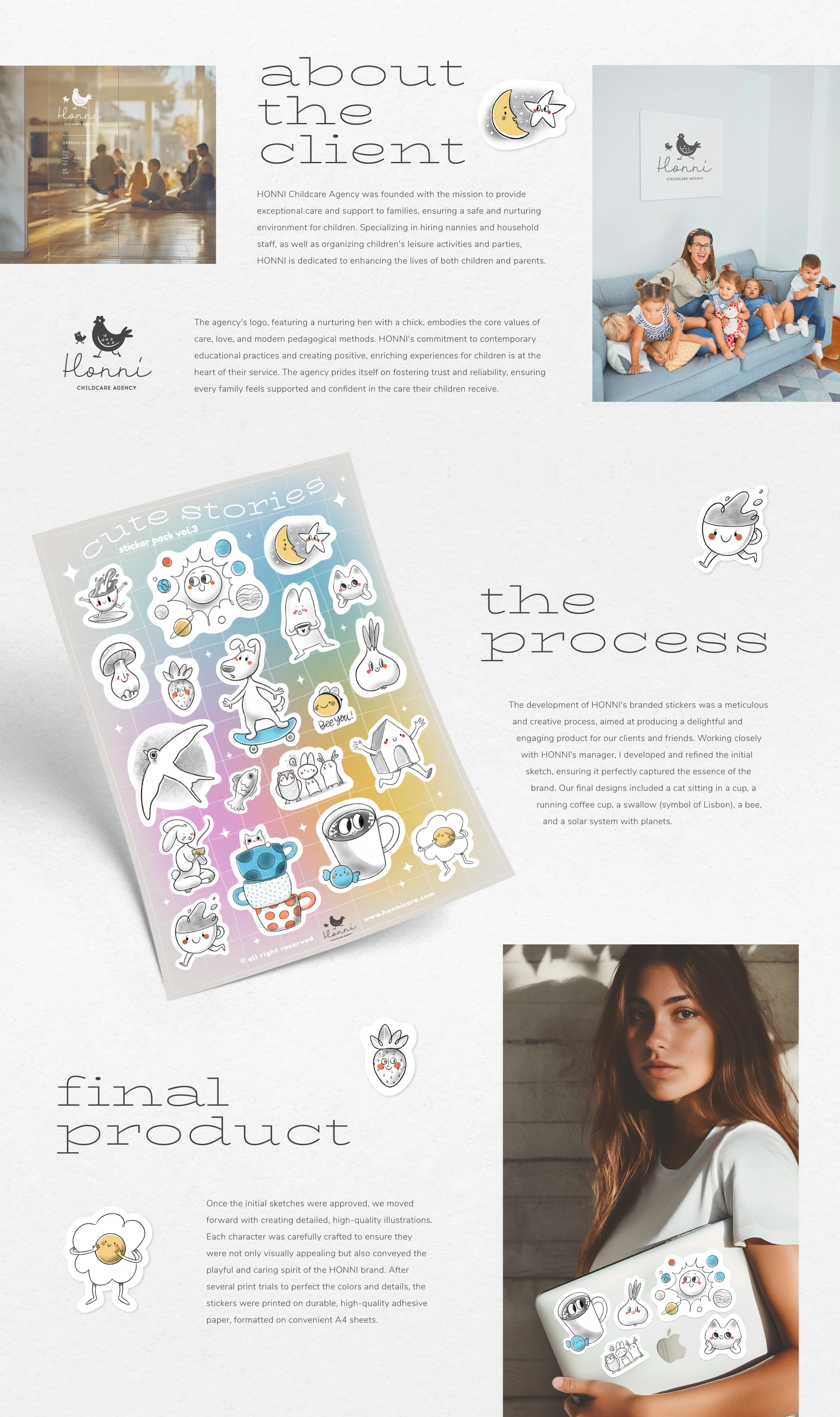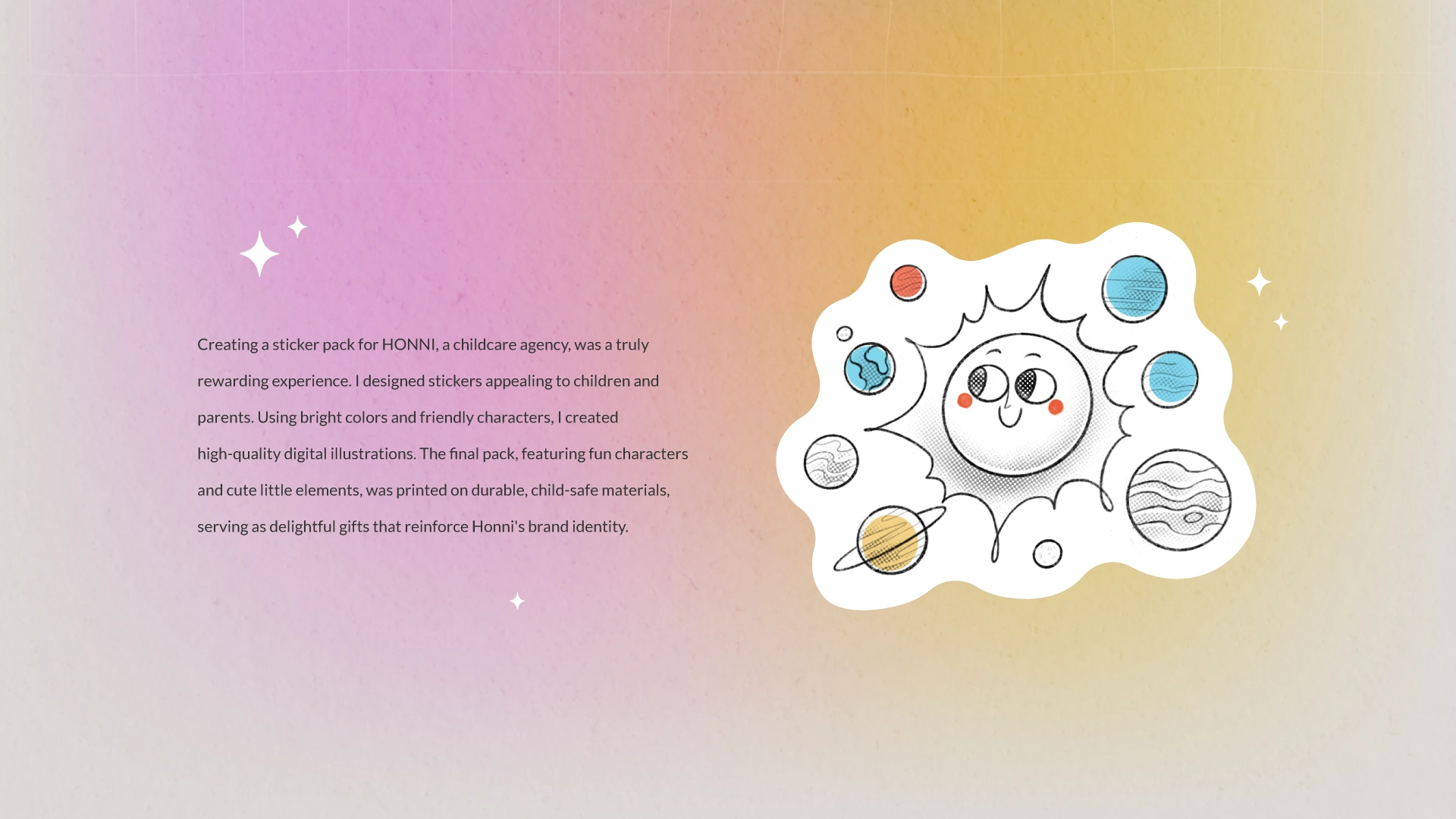 Introducing a sticker pack for Honni, a childcare agency. I designed stickers appealing to children and parents.